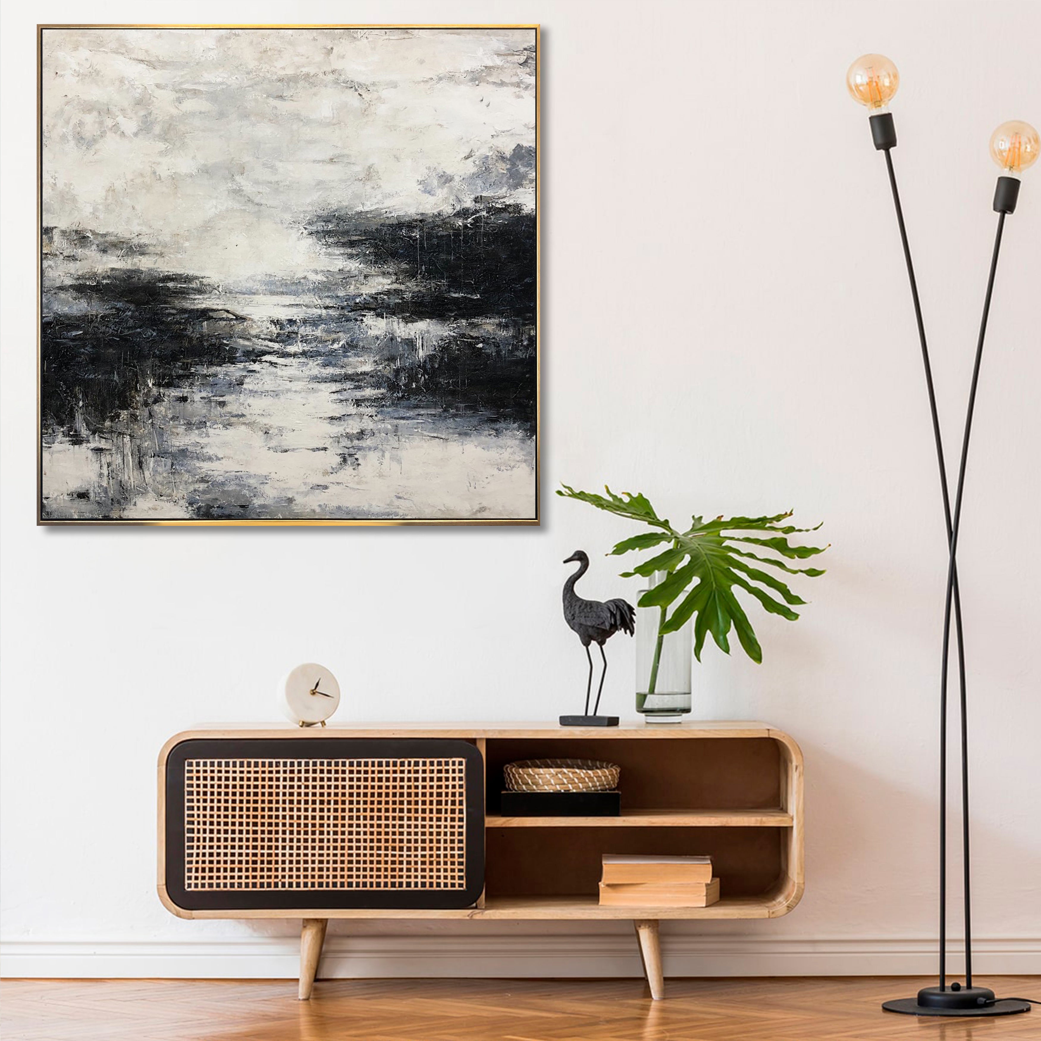 لوحة فنية حديثة على القماش لوحة جدارية بسيطة تجريدية باللونين الأبيض والأسود لوحة فنية رائعة مصنوعة يدويًا من الأكريليك على القماش فن أحادي اللون | SOLITUDE