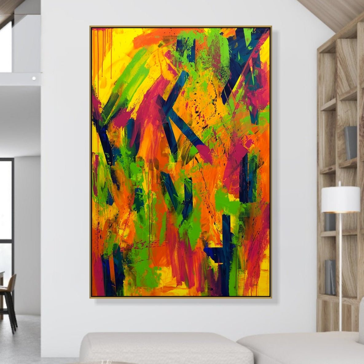 Immerse your space in the dynamic energy of this vibrant abstract painting. Featuring bold brush strokes and a vivid palette of greens, yellows, oranges, pinks, and blues, this modern art piece brings a burst of creativity and vitality to any room. Perfect for contemporary decor, this large canvas captures the lively spirit of nature's colors and adds a striking visual impact to your living room or office. Enhance your interior design with this unique and expressive wall art.
