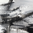 This abstract painting features a dramatic interplay of black, white, and gray tones, creating a stark and captivating contrast. The composition is filled with sweeping, textured brushstrokes and dripping lines, adding depth and movement to the piece. The layered application of paint gives the impression of a tumultuous landscape or a chaotic natural scene. The overall effect is intense and dynamic, evoking a sense of raw energy and motion.