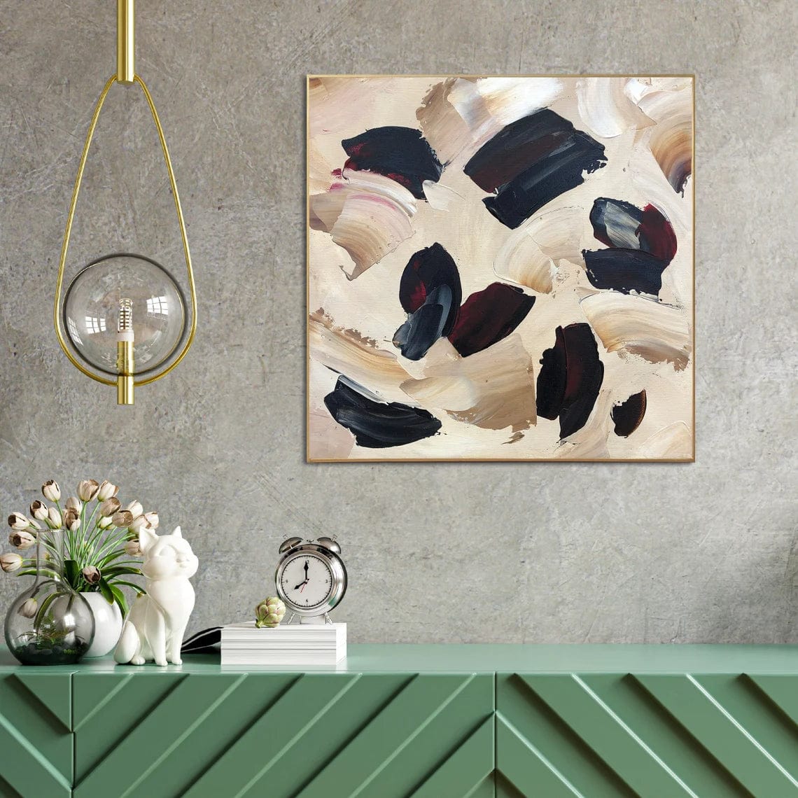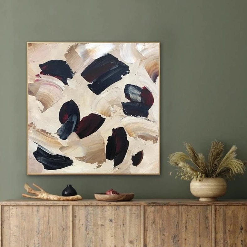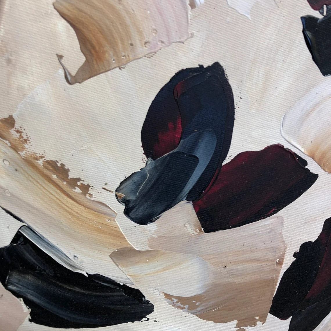 This abstract painting features bold, dark brushstrokes in black and deep red, interspersed with softer, swirling strokes of beige and light brown. The juxtaposition of dark and light creates a striking contrast, adding depth and movement to the composition. The overall effect is a dynamic and thought-provoking piece that invites the viewer to explore its interplay of colors and textures.