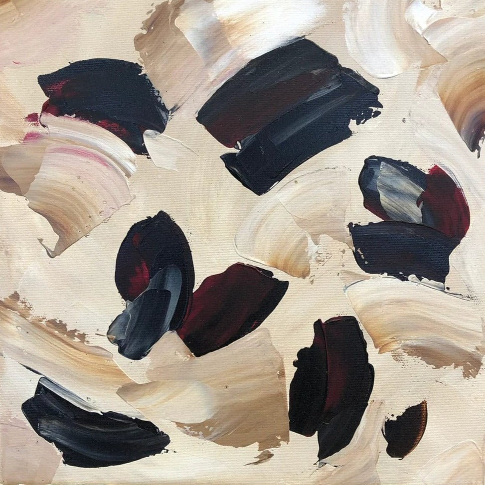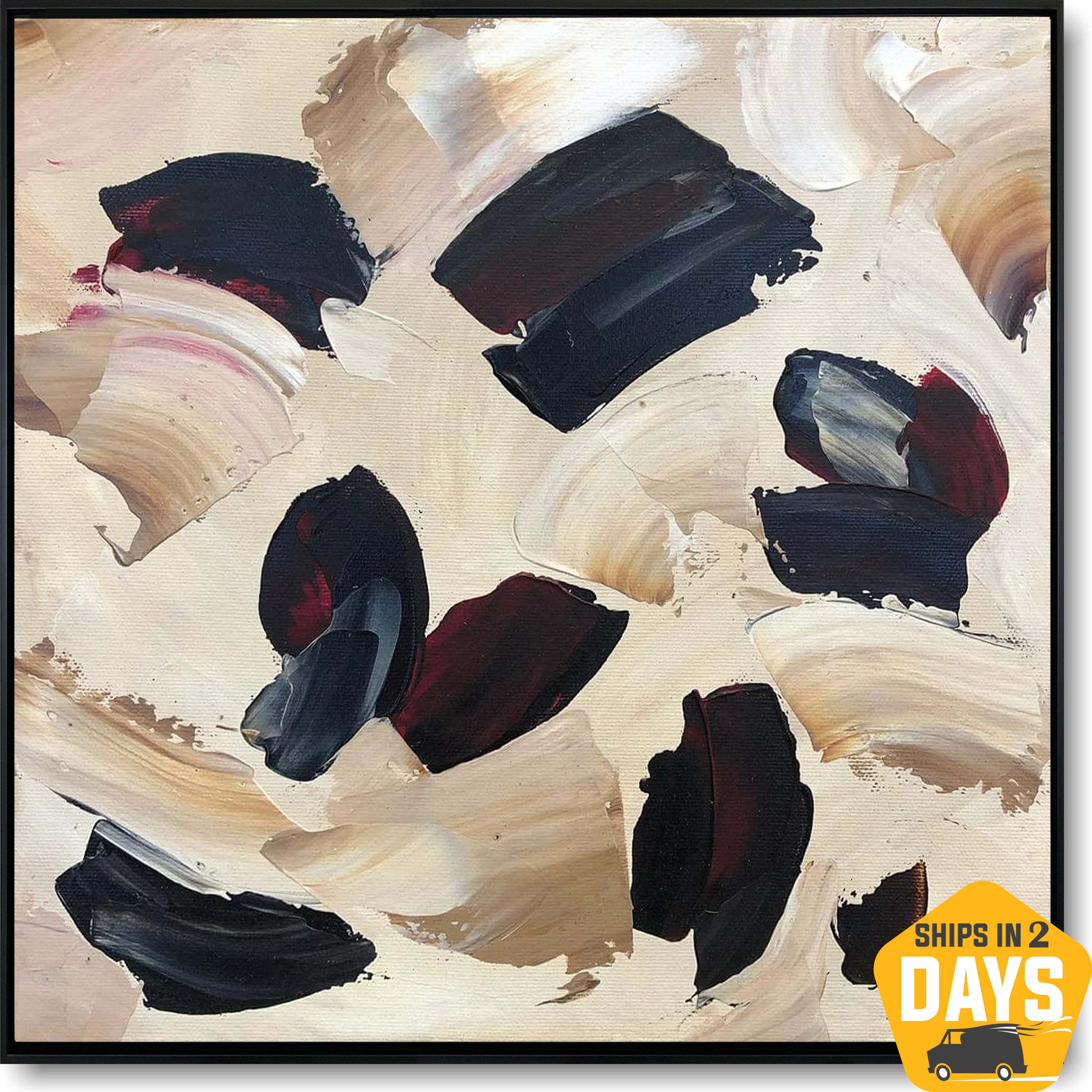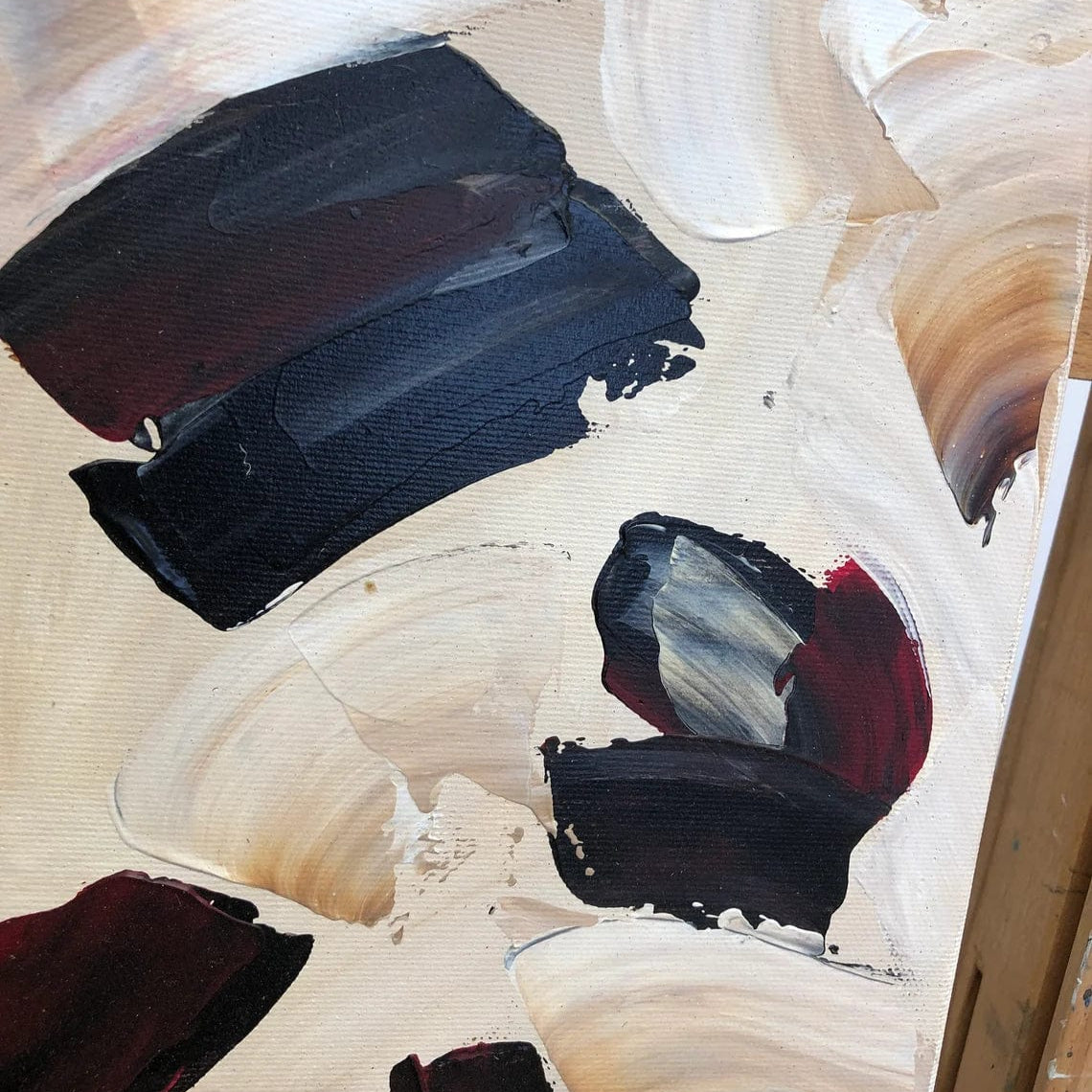 This abstract painting features bold, dark brushstrokes in black and deep red, interspersed with softer, swirling strokes of beige and light brown. The juxtaposition of dark and light creates a striking contrast, adding depth and movement to the composition. The overall effect is a dynamic and thought-provoking piece that invites the viewer to explore its interplay of colors and textures.