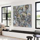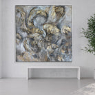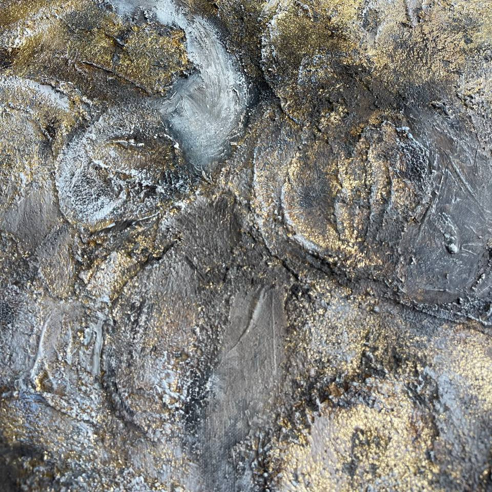In this captivating abstract painting, a harmonious dance unfolds between the luxurious tones of grey and gold. The artist skillfully orchestrates a visual symphony, where shades of grey blend seamlessly with the opulent allure of gold, creating a composition that is both elegant and timeless.