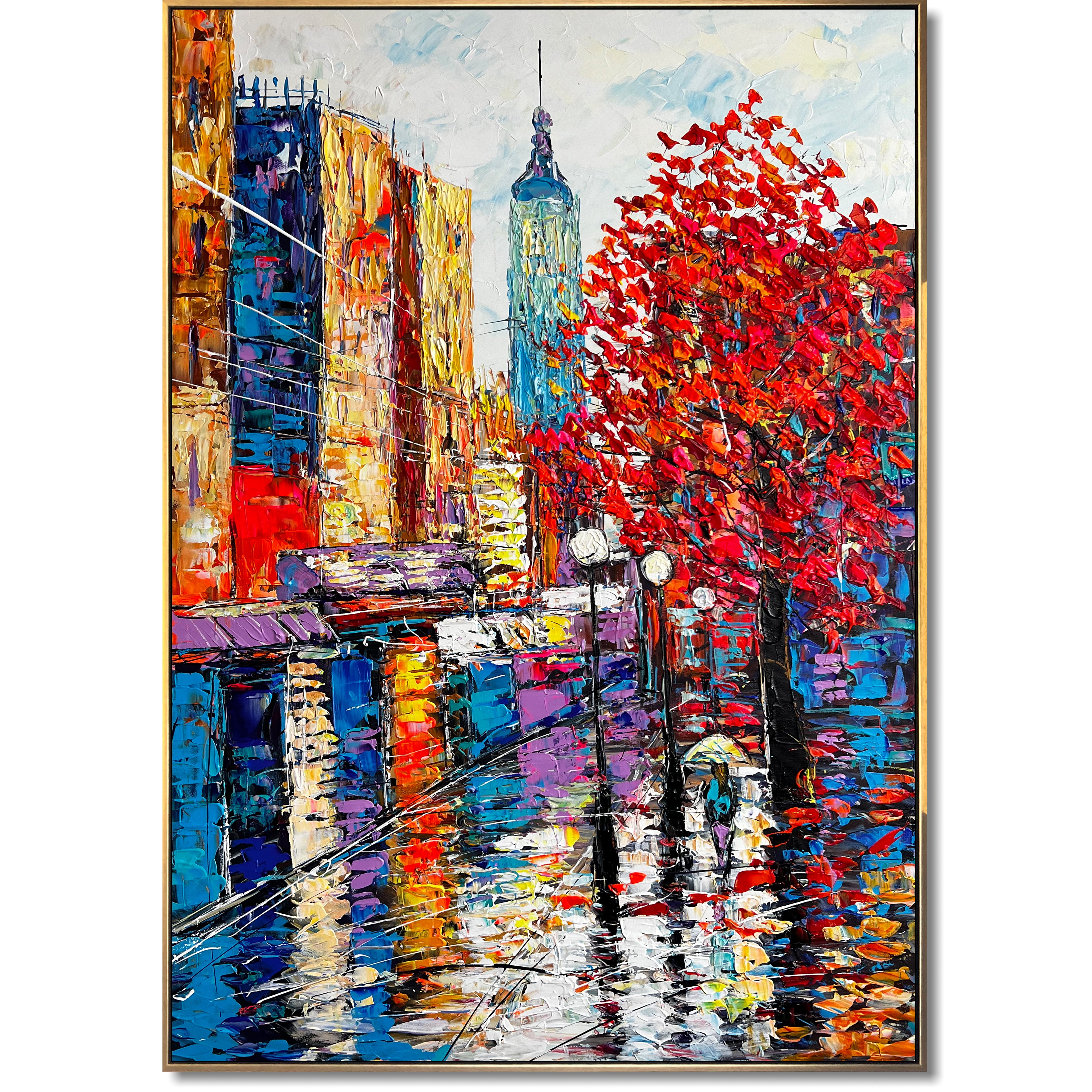 This abstract and colorful painting portrays a dynamic urban landscape, where the left side is dominated by the towering presence of multi-storey buildings. These structures, depicted with vibrant and diverse hues, create a visual symphony of form and color. On the right side, a lively scene unfolds, with trees adorned in warm orange leaves, a textured sidewalk, and graceful streetlights.