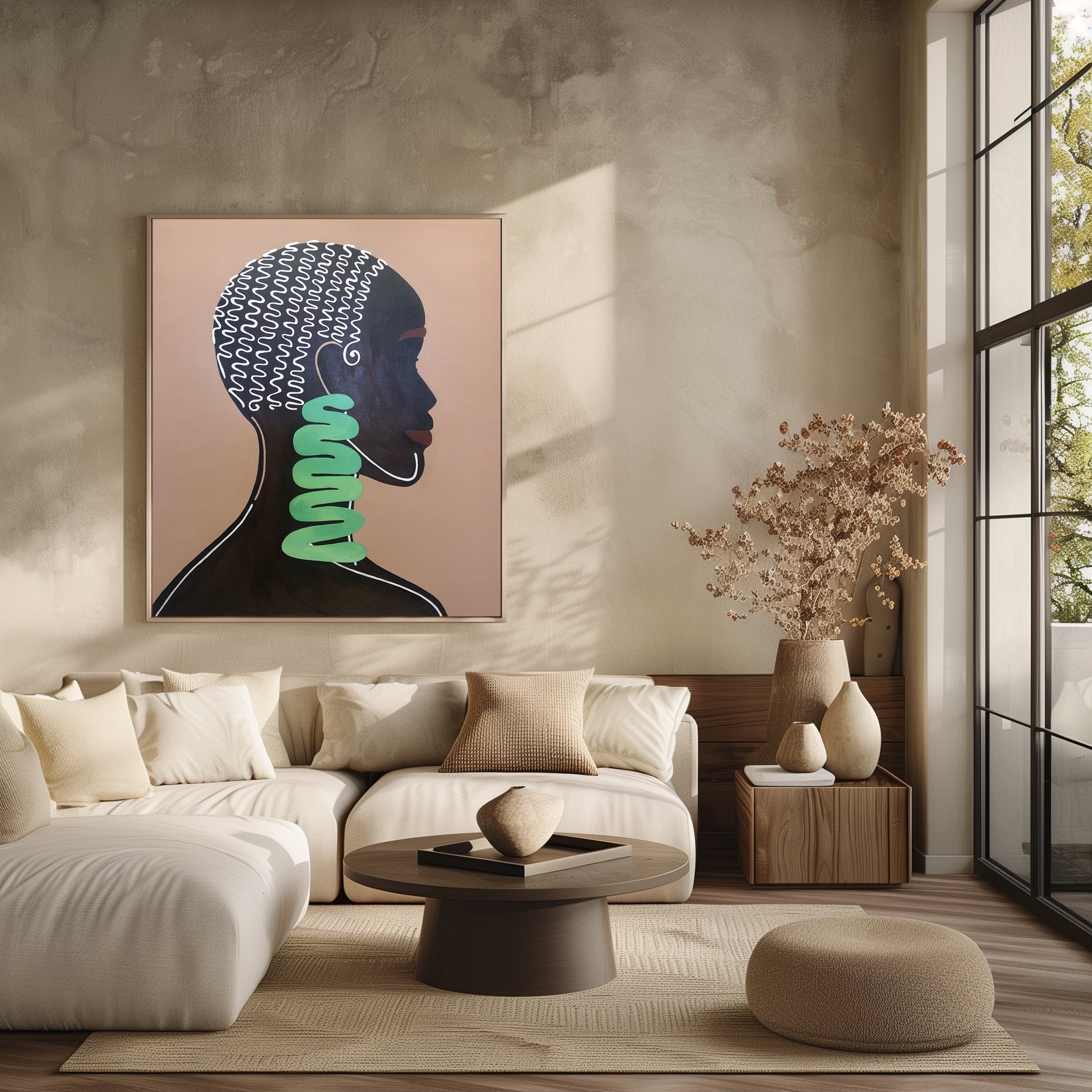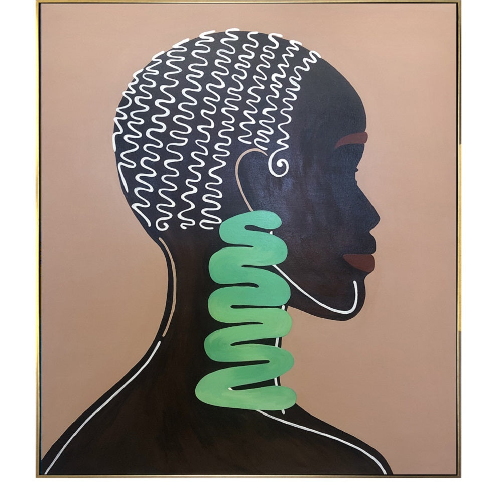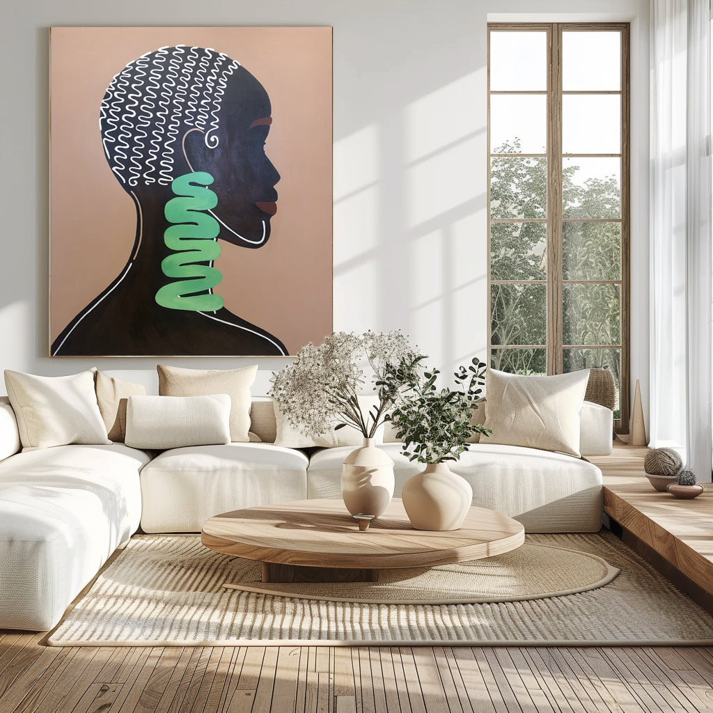 Minimalist Afrocentric portrait in profile—bold black silhouette, cream line art curls and mint-green spiral adornment on warm tan. Hand-painted on canvas, flat colors and clean contours deliver gallery impact and celebrate contemporary African elegance. Ideal for living rooms, bedrooms or offices. Choose stretched or framed, request any size/colors—free visualization. Sleek statement piece for modern interiors. 100% handmade, safe paints, fast worldwide shipping, and 30-day returns.