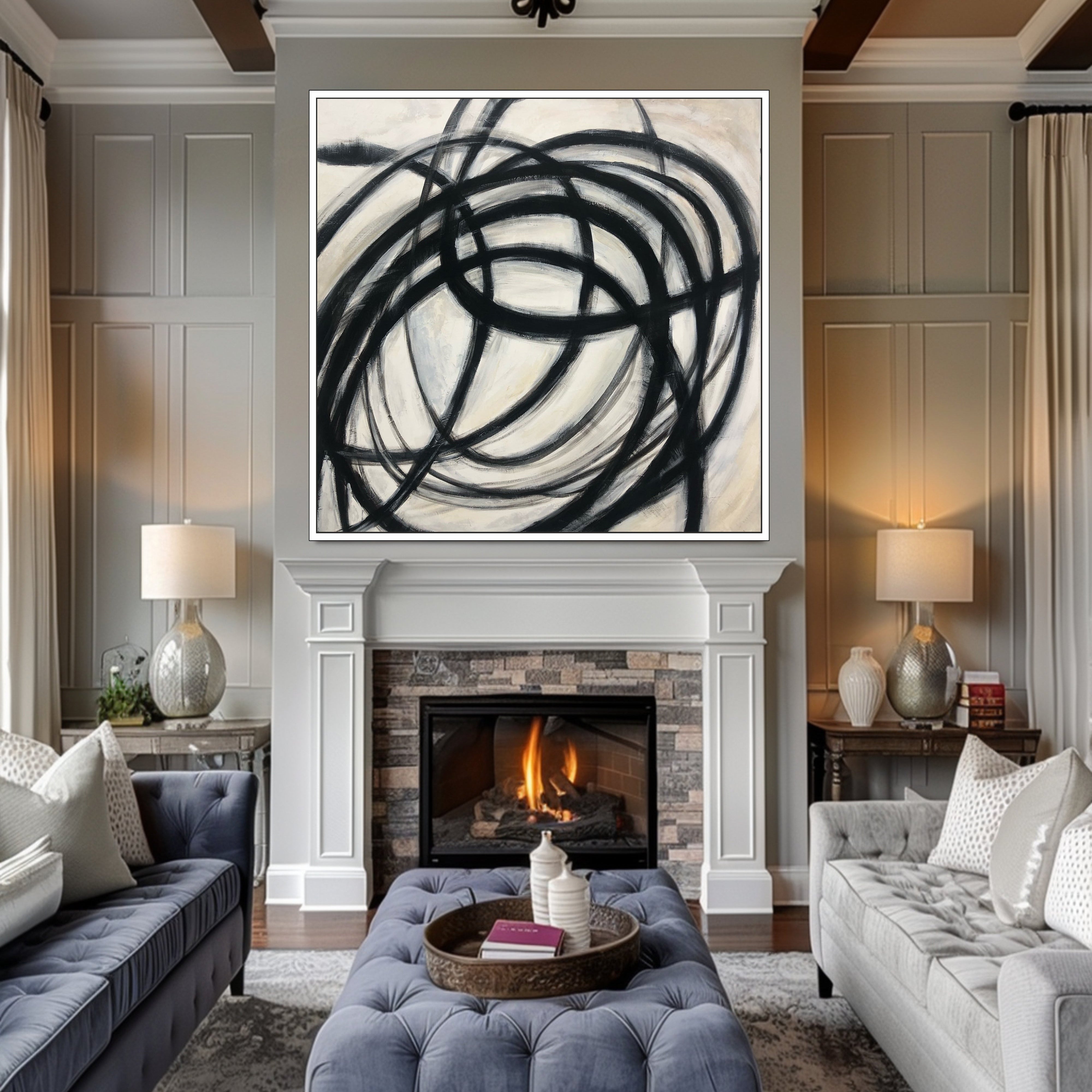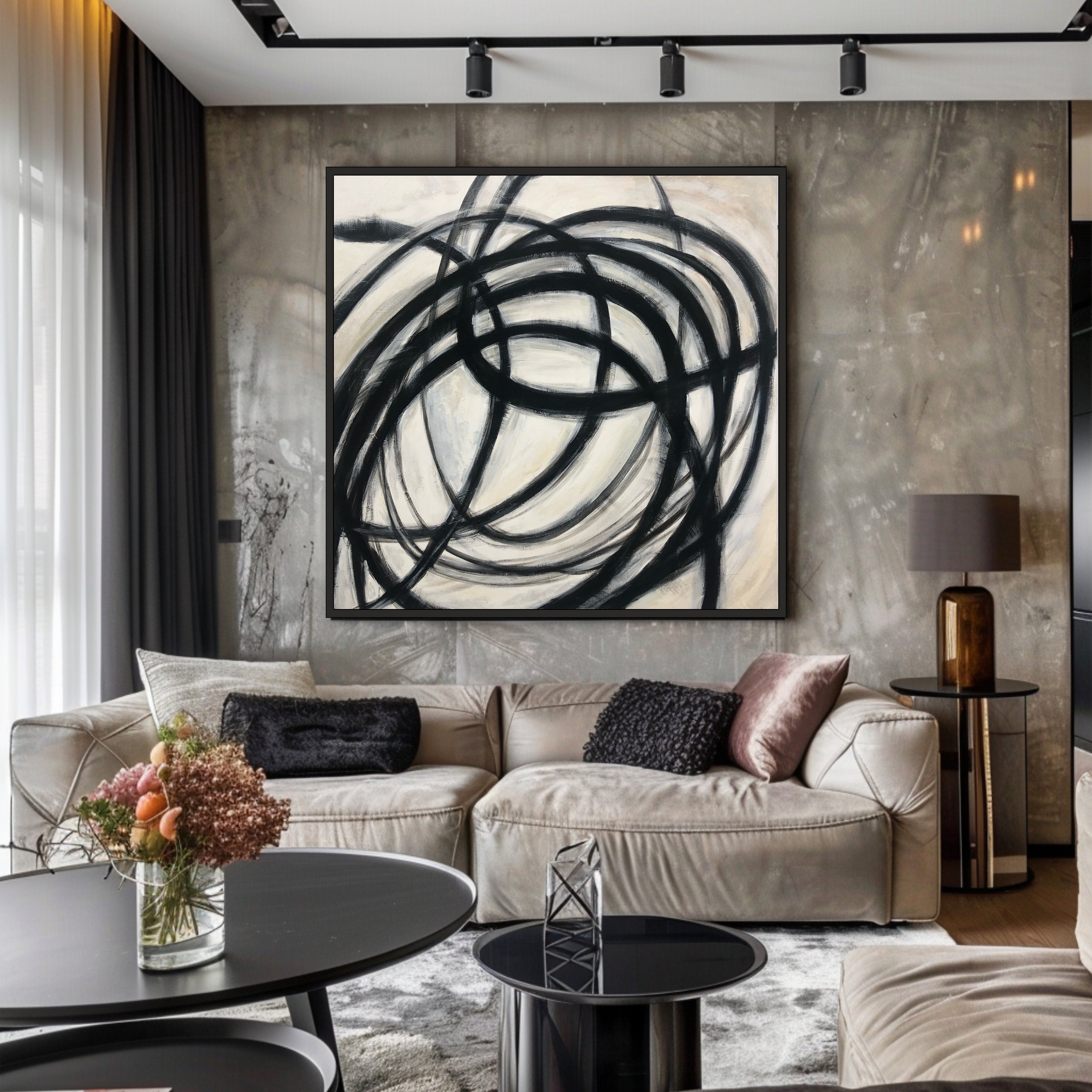 "Whirl of Shadows" features an abstract composition dominated by swirling black lines against a muted background. The dynamic, looping strokes create a sense of motion and depth, evoking the imagery of shadows in a whirlwind. The interplay of light and dark, with the varied thickness and intensity of the lines, adds a layer of complexity and intrigue. This artwork captures the essence of chaos and fluidity, drawing viewers into its mesmerizing, shadowy vortex.