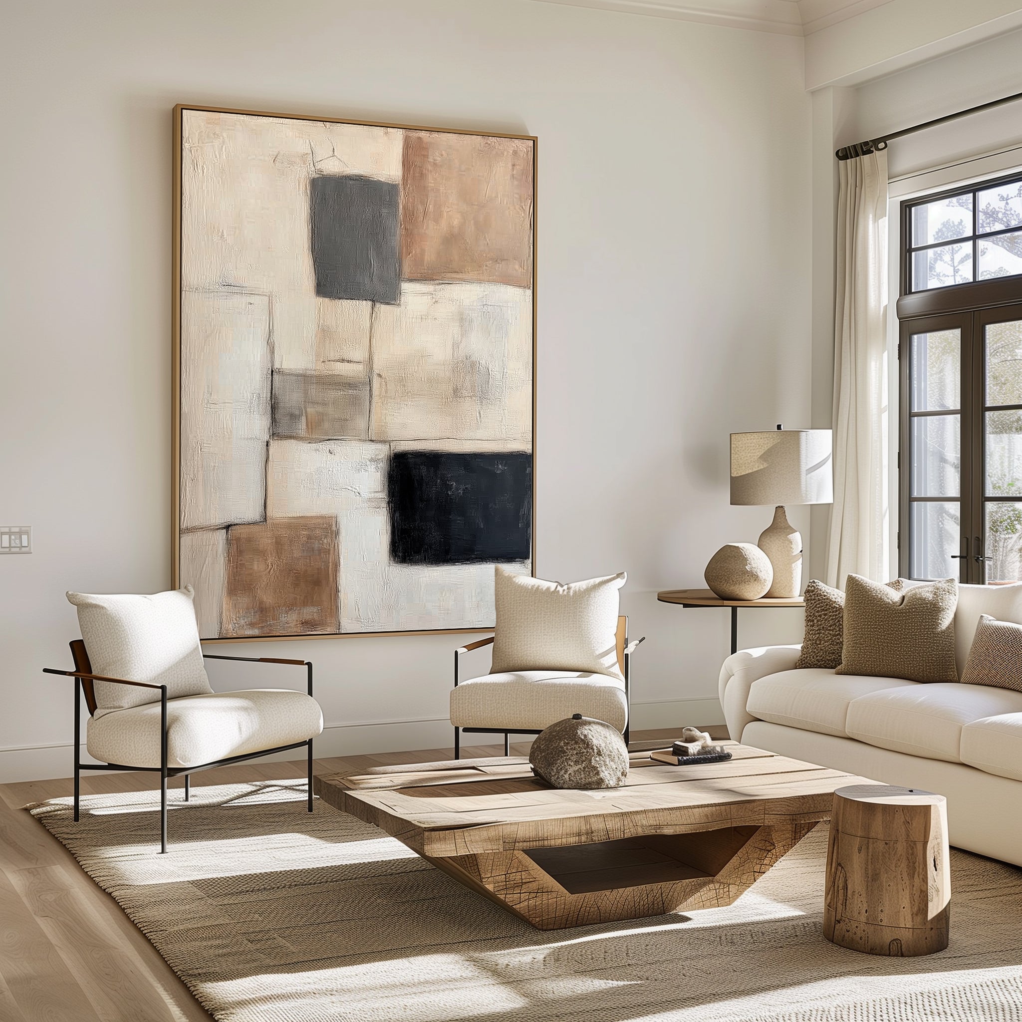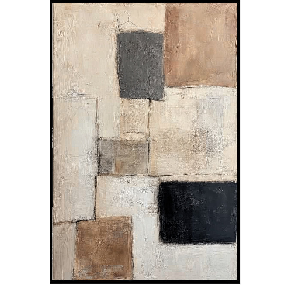 Bring calm sophistication to your space with “Elemental Blocks” – a hand-painted abstract featuring soft beiges, charcoal, and textured blocks. This modern neutral wall art creates an atmosphere of balance and warmth, making it ideal for living rooms, offices, or bedrooms. The minimal yet bold geometry elevates any contemporary interior while the earthy tones maintain a grounded elegance. A perfect addition for those who seek modern art with subtle character.