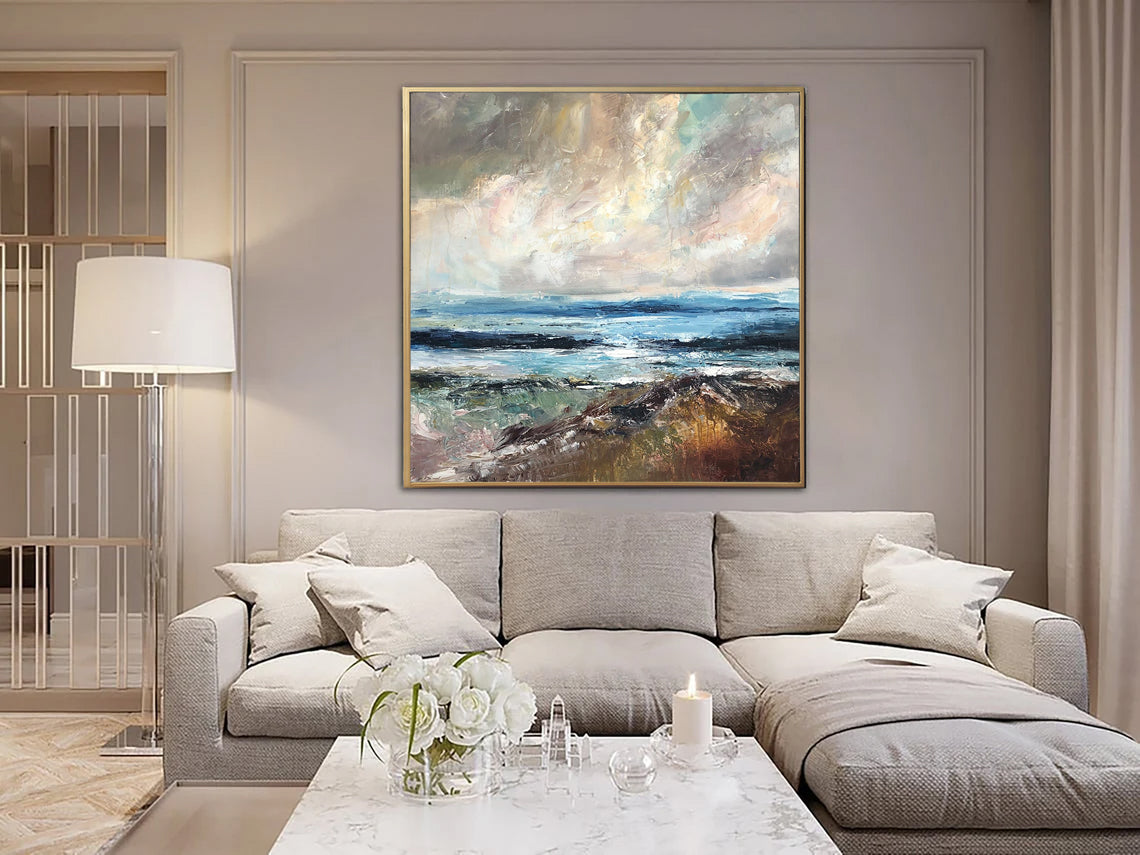 Experience the serene beauty of the coast with 'Ahead of the Storm.' This abstract seascape painting captures the essence of the ocean, with waves gently meeting the shore under a vast sky. The harmonious blend of blues, greens, browns, and hints of pink and grey evoke a sense of calm and tranquility. Perfect for coastal decor, this contemporary piece brings the peaceful allure of the beach into any space. Let the soothing tones and natural beauty of this artwork inspire and relax you every day.