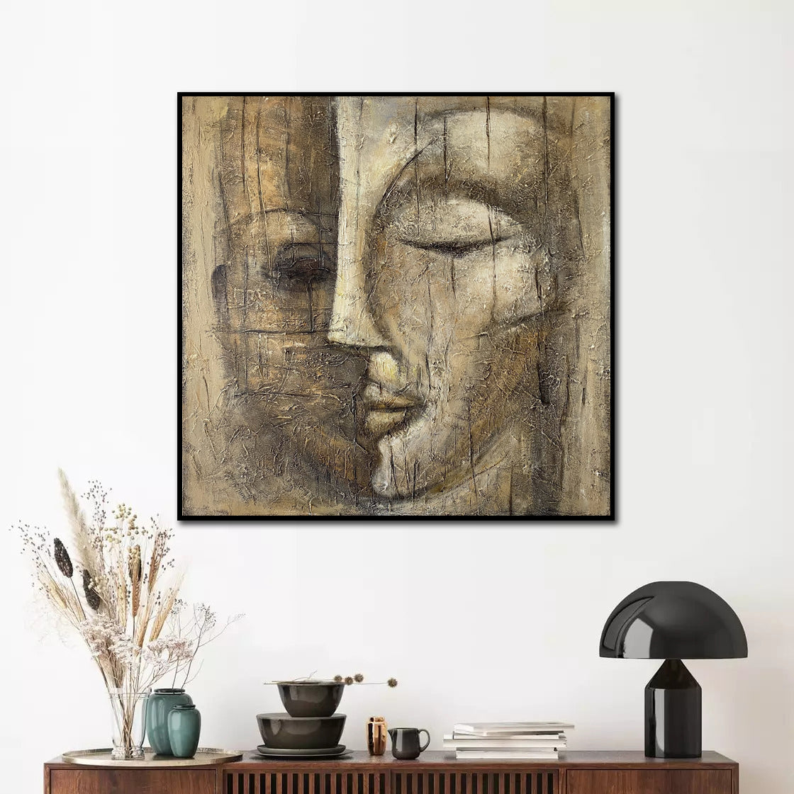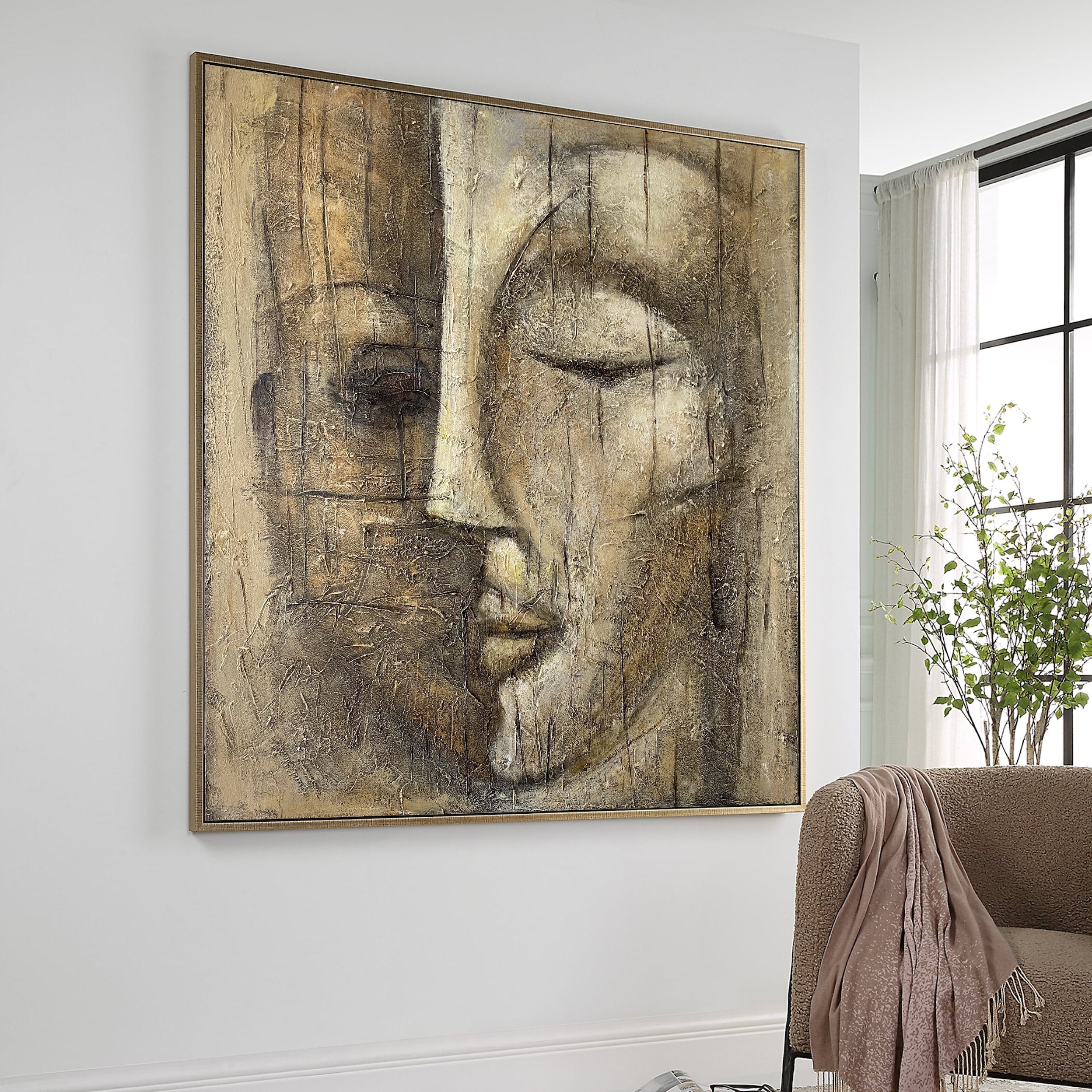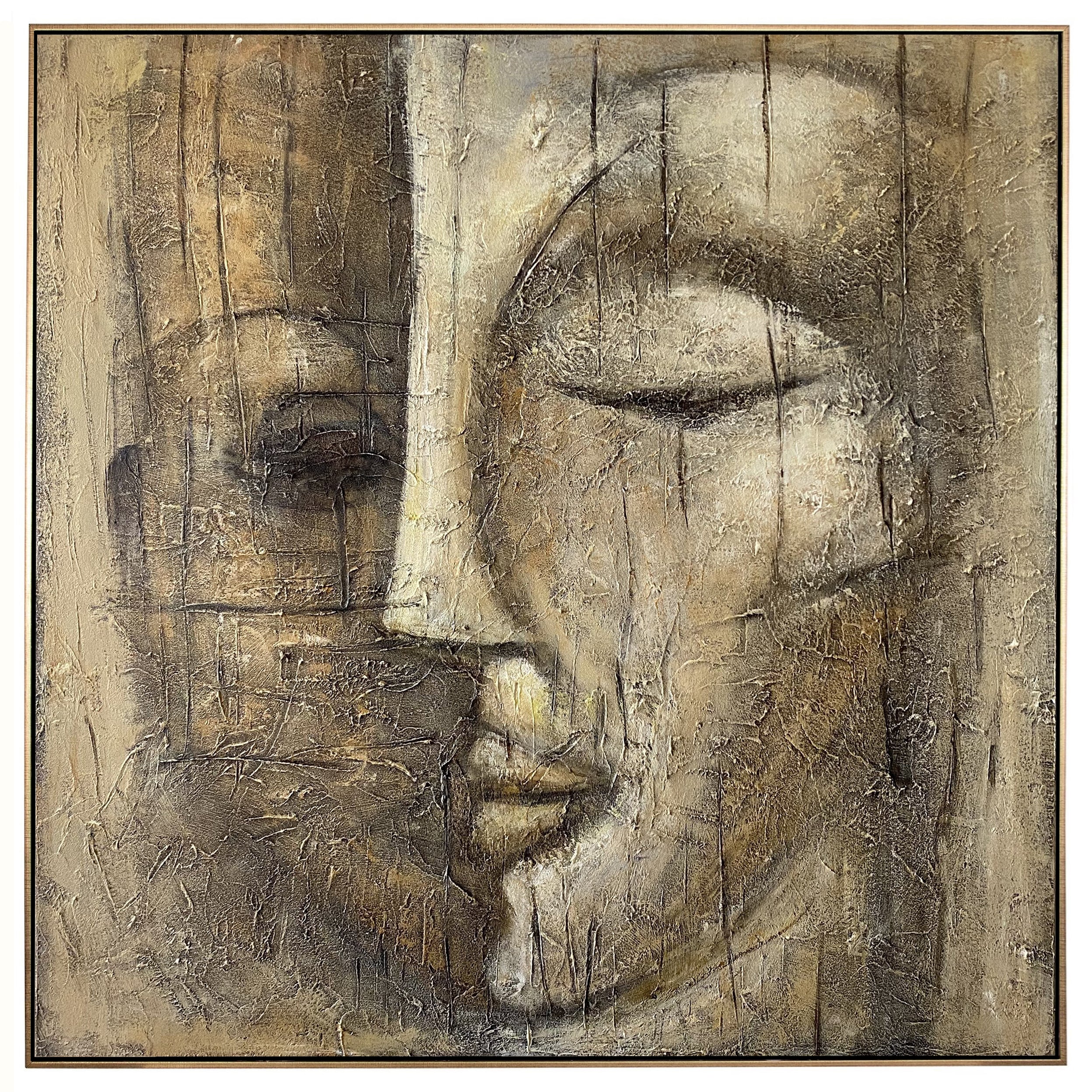 Invite calm into any room with this textured abstract Buddha face. Hand-painted with palette-knife layers, the neutral beige, taupe and umber palette creates a warm, wabi-sabi patina that feels ancient and serene. Perfect for bedrooms, meditation areas, spas and modern Japandi interiors. Available in custom sizes with optional floater frame. Ready to hang when stretched or shipped rolled. Color tweaks welcome—bring quiet elegance and mindful presence to your walls.
