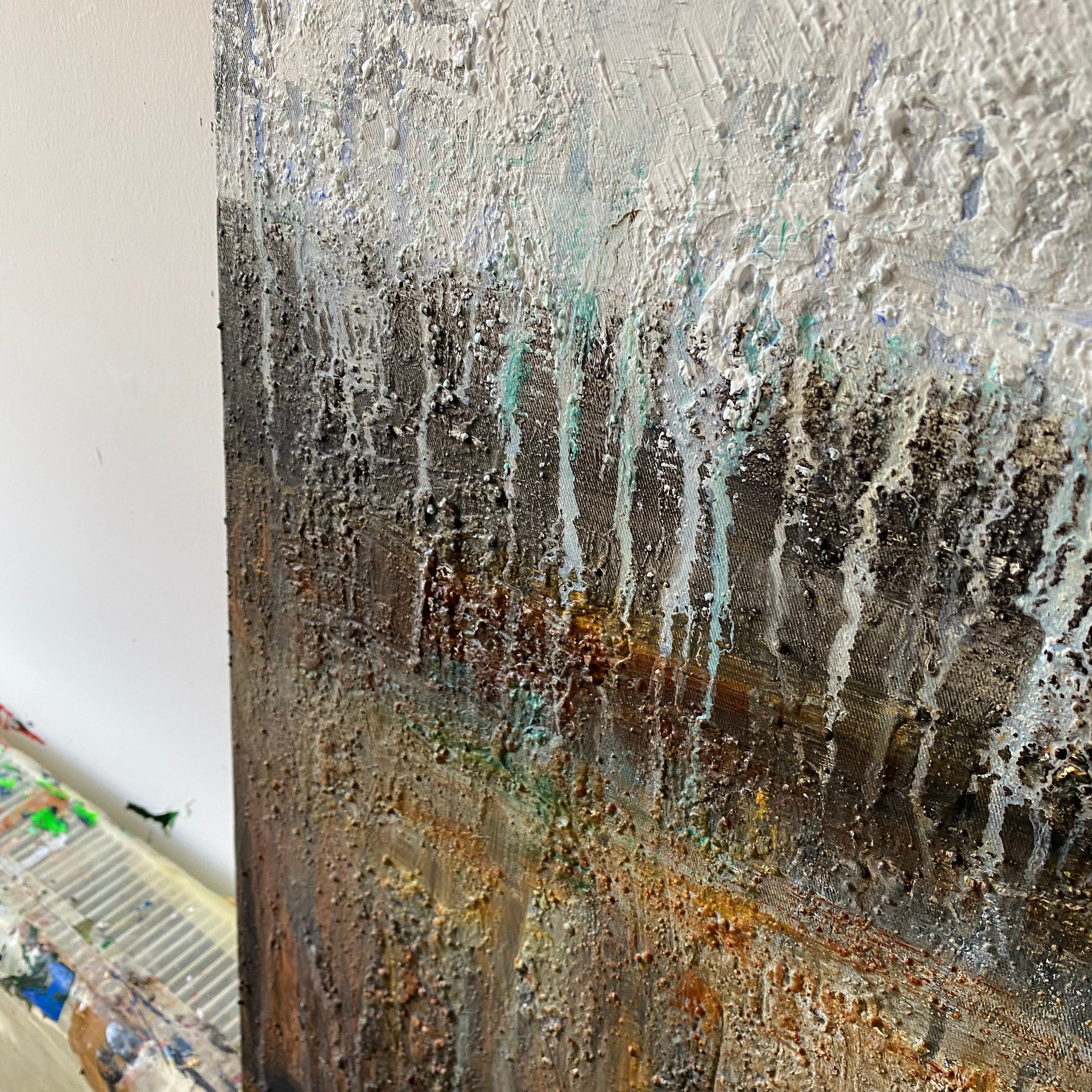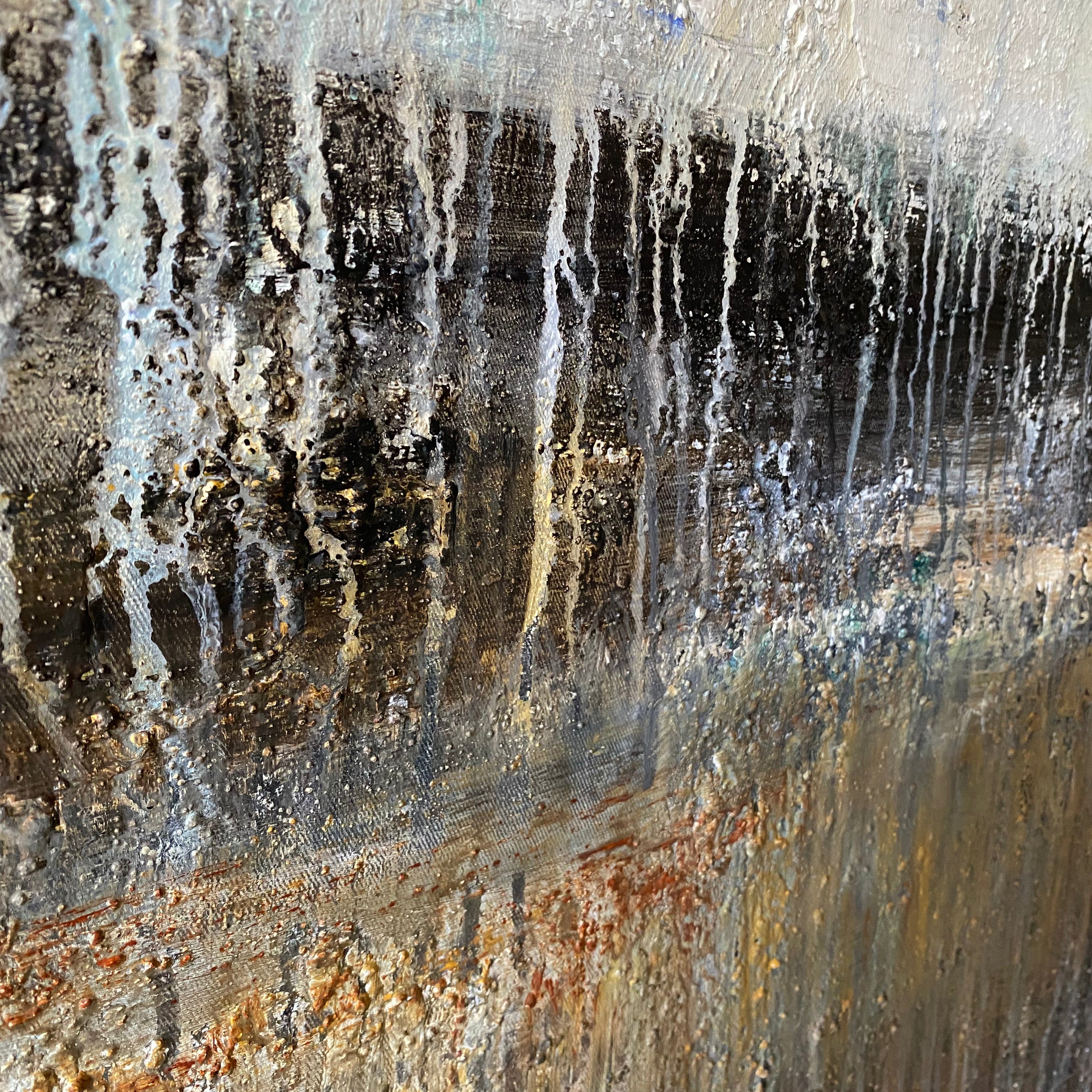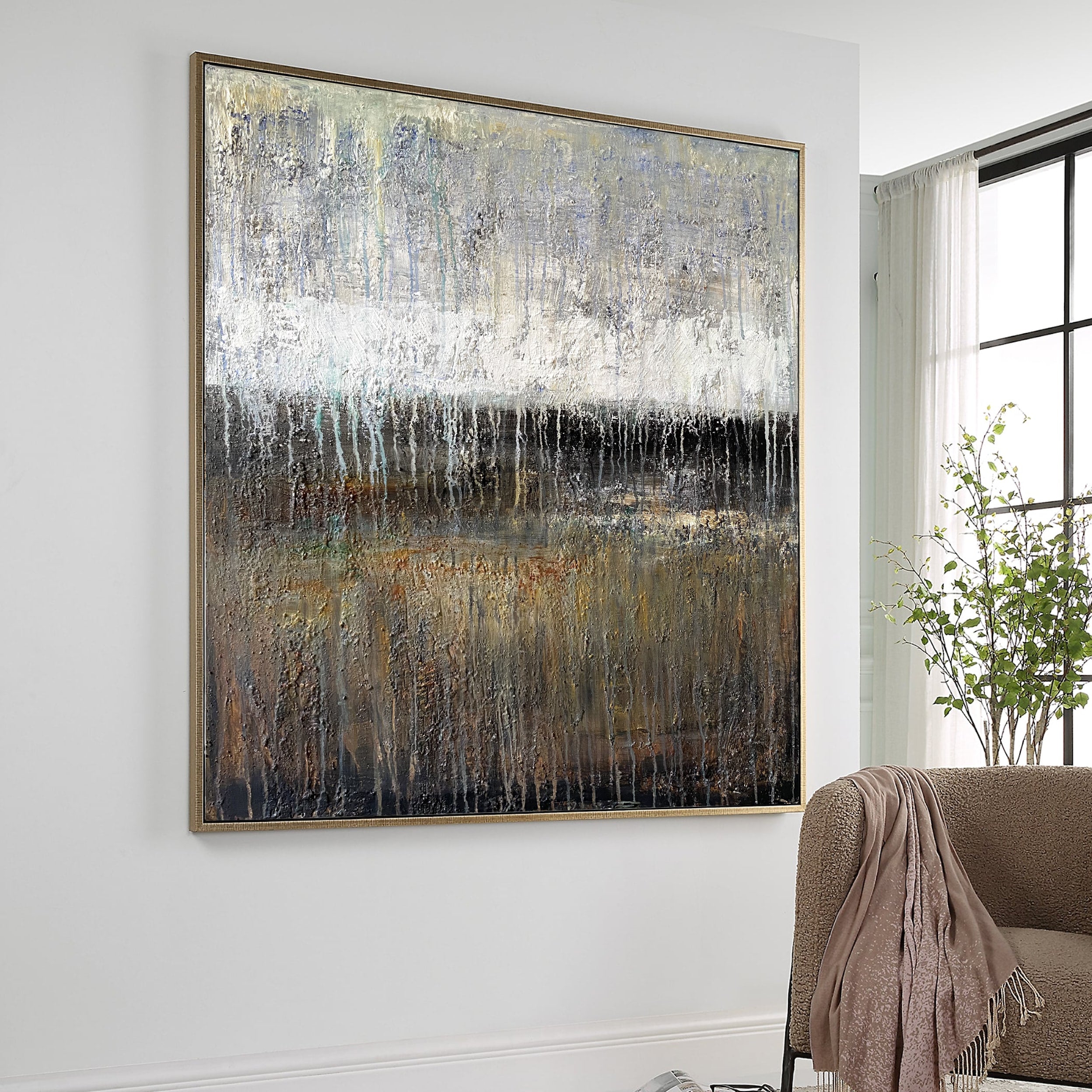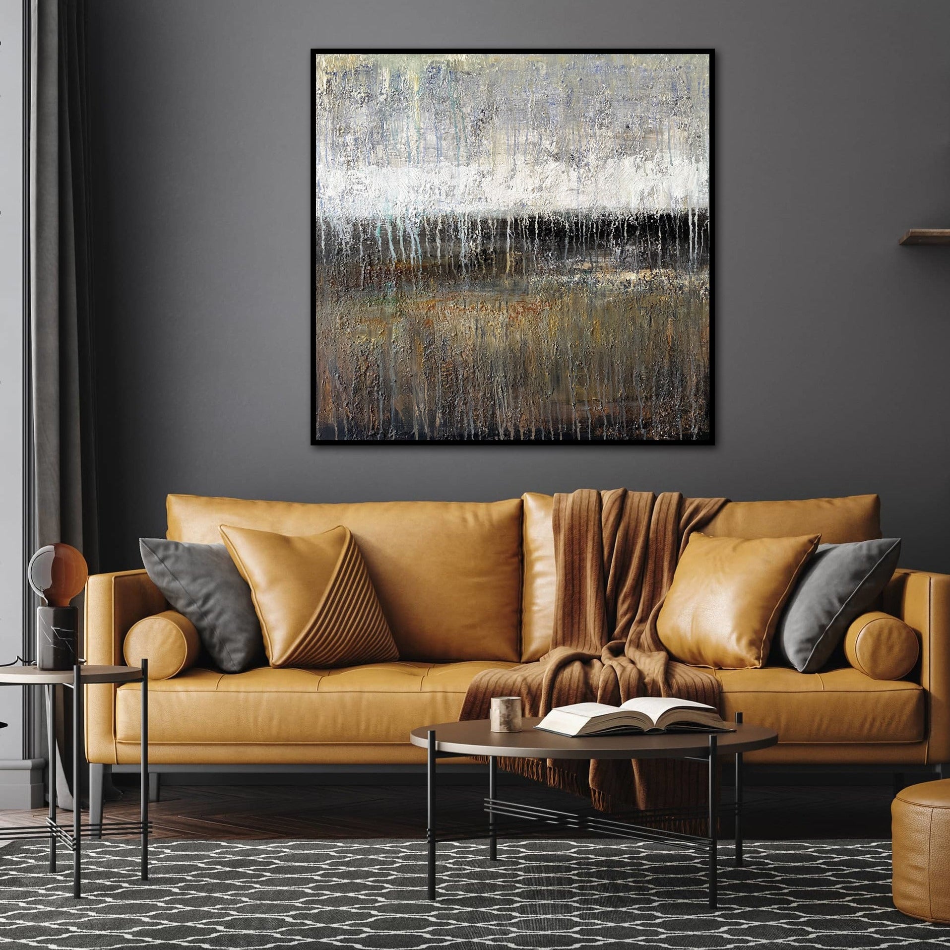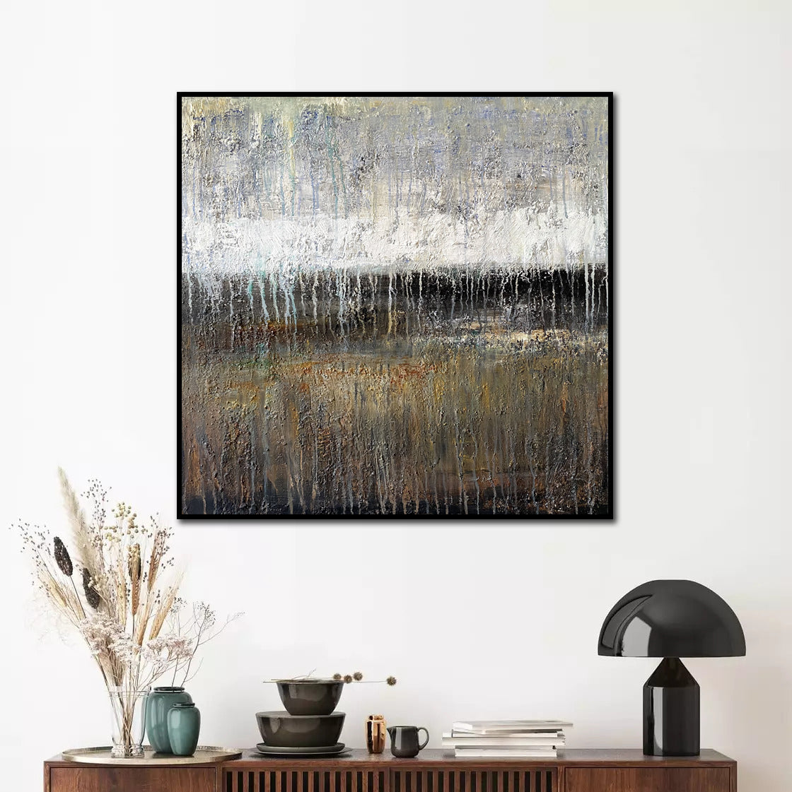 Bring calm drama to your space with this textured abstract landscape. Heavy impasto and soft drips evoke mist over the horizon, blending neutral greys, off-white, charcoal, taupe, rust and touches of teal. The moody, wabi-sabi vibe suits living rooms, bedrooms, offices and modern rustic interiors. Handmade on canvas with custom sizes and an optional gold floater frame. Ready to hang when stretched or shipped rolled. Color tweaks available—elevate your walls with gallery-level impact.