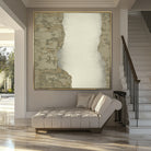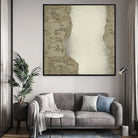 "Minimal Boundaries" is a serene exploration of texture and form, where raw, earthy tones meet open space in perfect balance. The interplay of soft beige, muted browns, and delicate distressing creates an organic, weathered effect—evoking the passage of time and the quiet beauty of natural erosion.