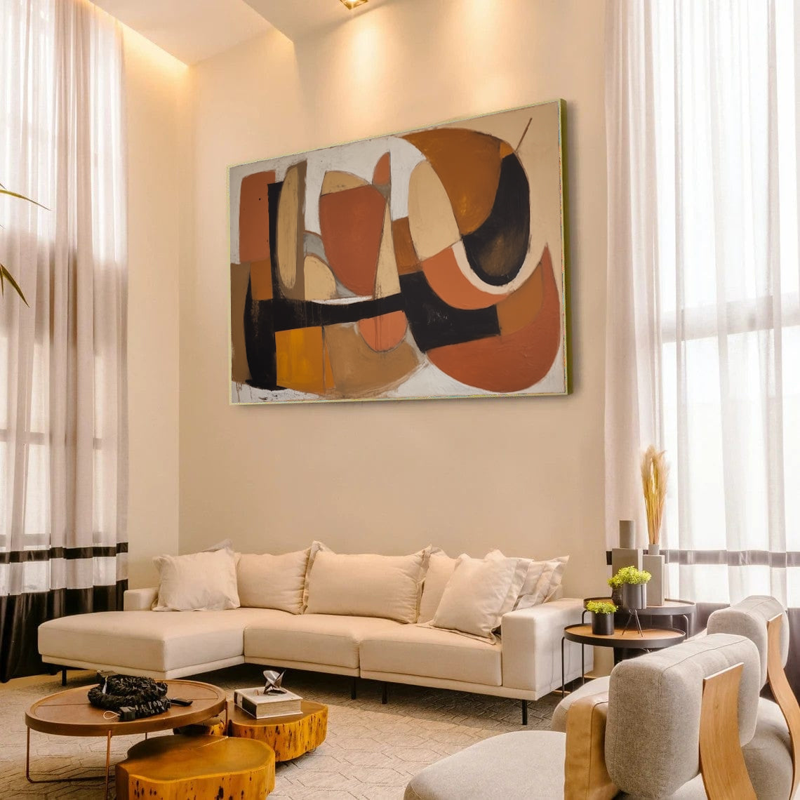 Elevate your space with “Terracotta Geometry,” a bold abstract painting in rich terracotta, mustard, beige, and black. Inspired by midcentury modern design and organic shapes, this artwork blends earth tones with geometric flow to create a warm, grounded atmosphere. Perfect for neutral interiors, boho living rooms, or contemporary offices, it brings texture, movement, and timeless sophistication to any wall. Hand-painted for authentic depth and character.