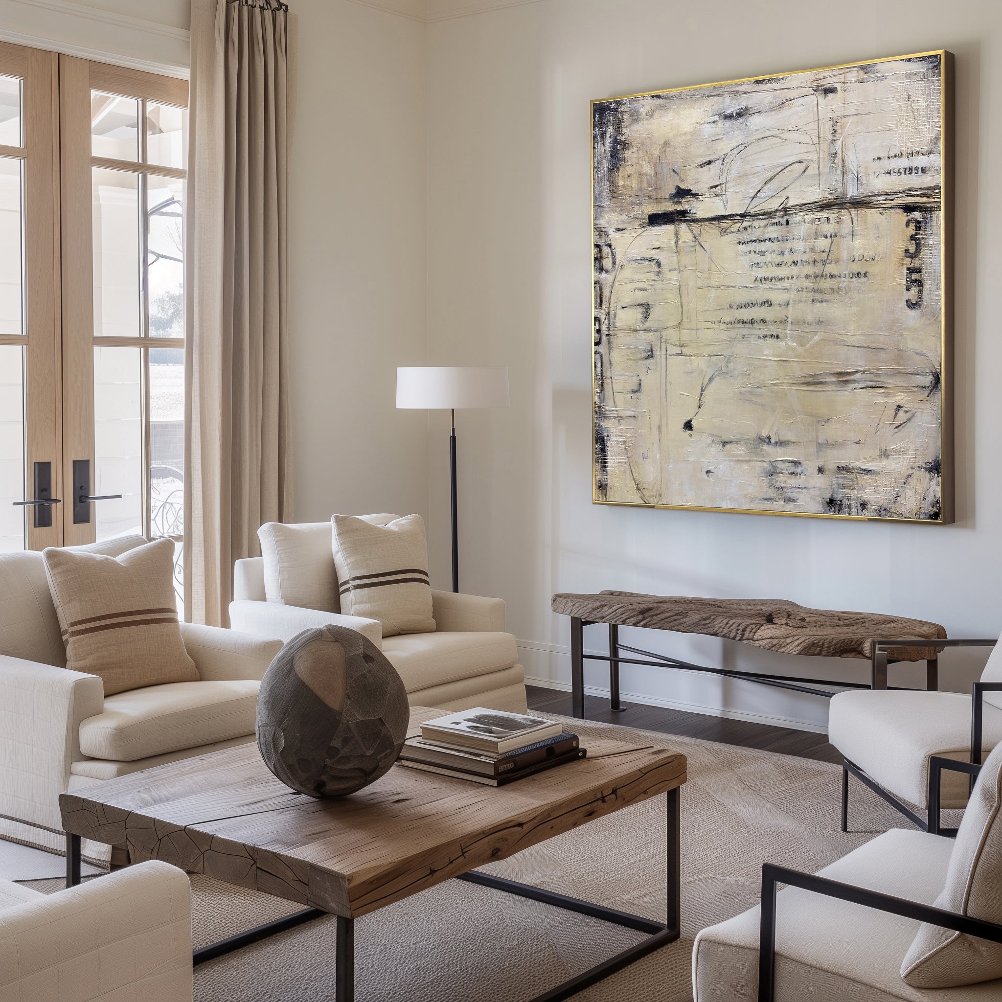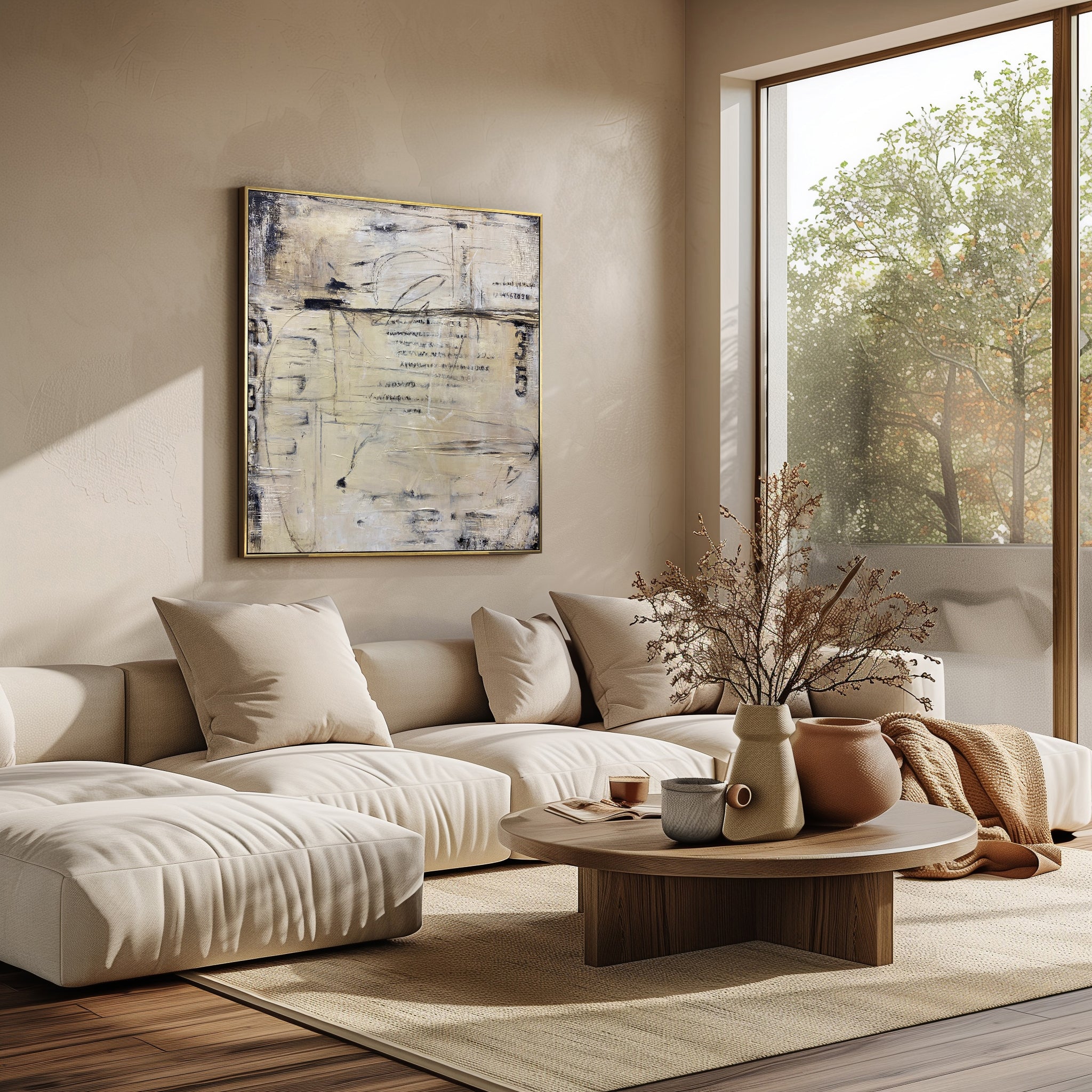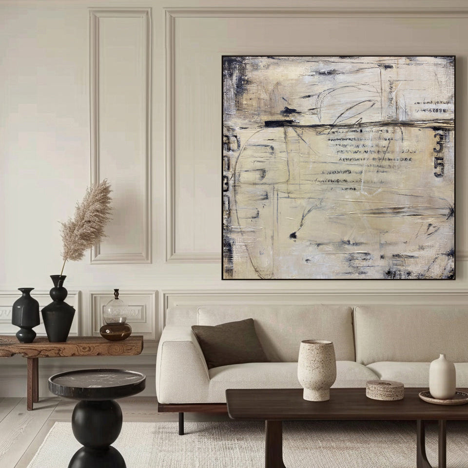 Bring calm sophistication to your interior with "Silent Numbers", a neutral abstract painting crafted in soft beige and charcoal shades. Its layered textures, subtle numeric details, and expressive marks evoke quiet reflection and timeless balance. Perfect for Japandi, Wabi-Sabi, or modern minimalist spaces, this artwork adds warmth and understated elegance to any living room, office, or gallery wall.