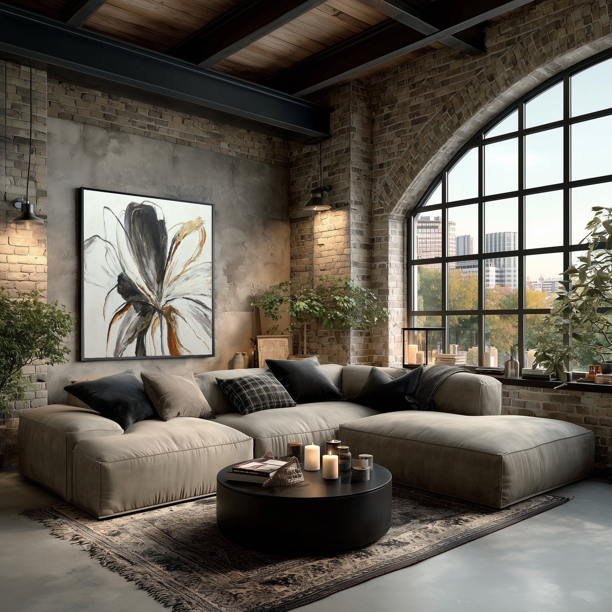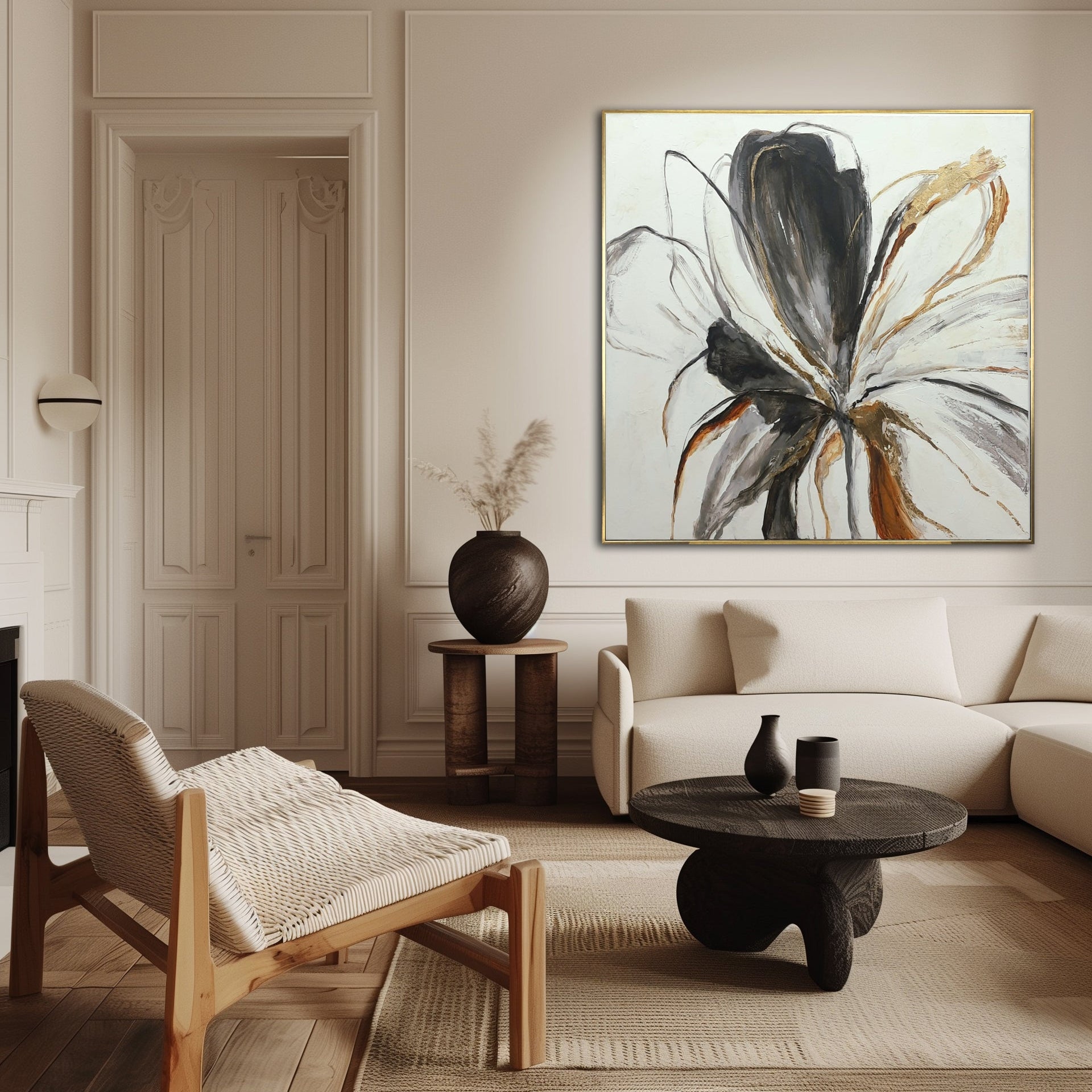 "Golden Bloom" captures the natural elegance of a flower unfurling in shades of beige, brown, and white with refined touches of gold. The textured surface and expressive strokes evoke organic movement and timeless balance, making this piece perfect for Japandi, Wabi-Sabi, or contemporary interiors. Hand-painted on canvas, it adds warmth, sophistication, and a sense of calm artistry to any modern living space.