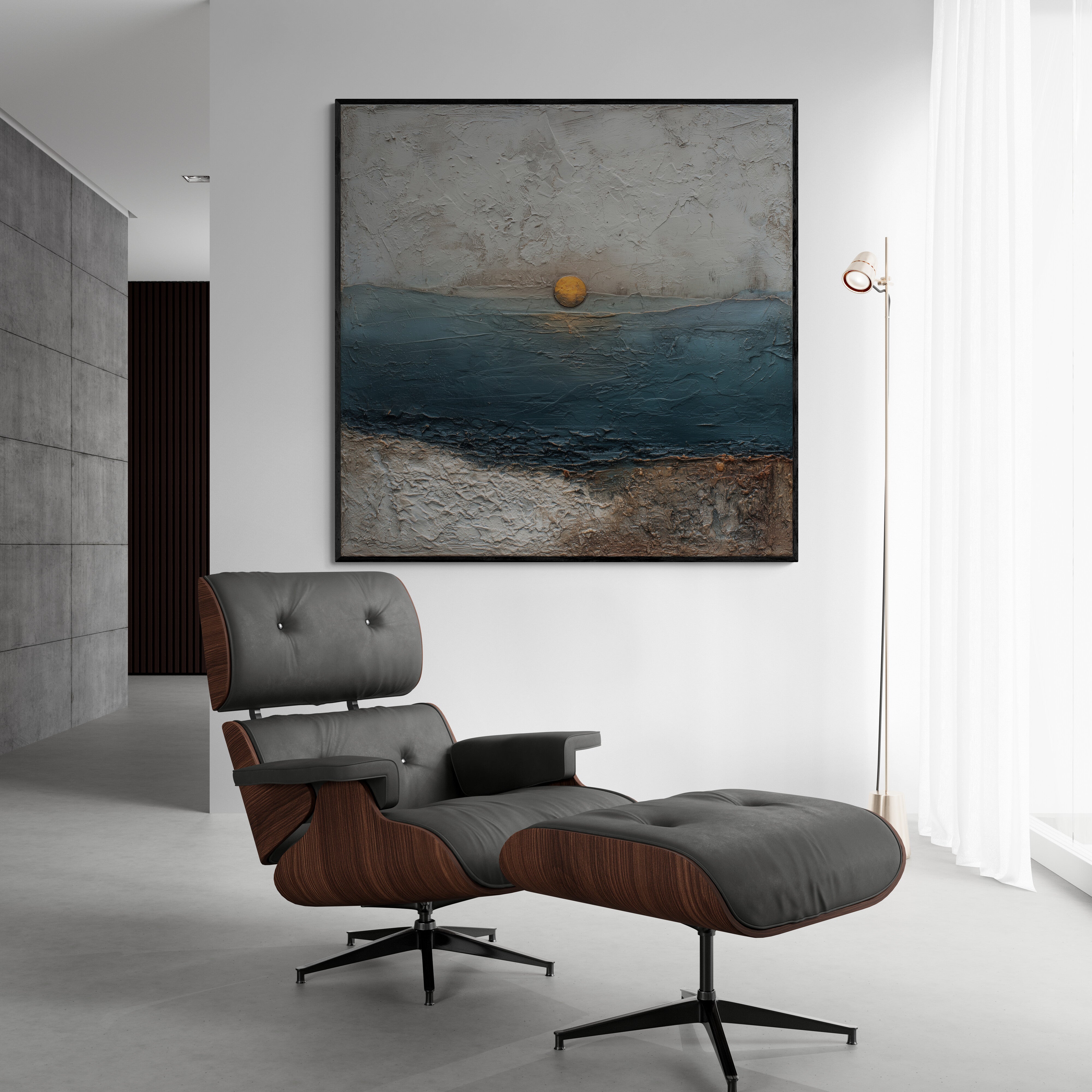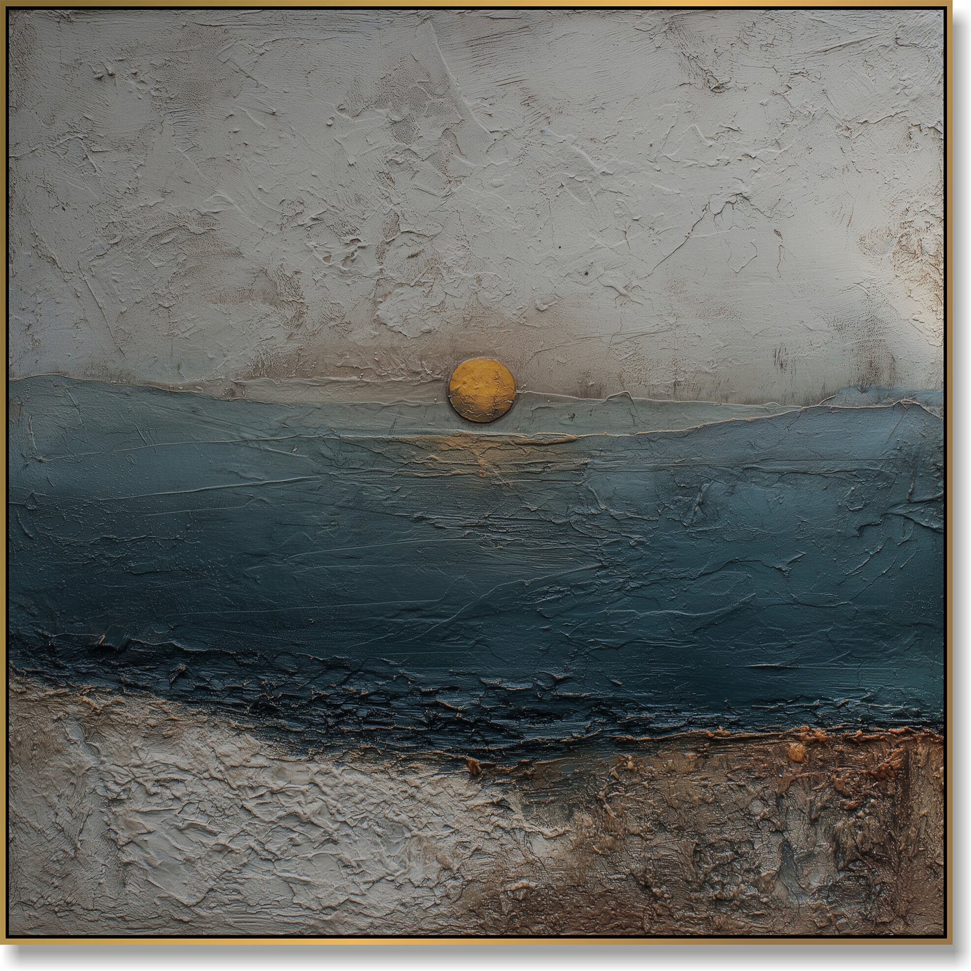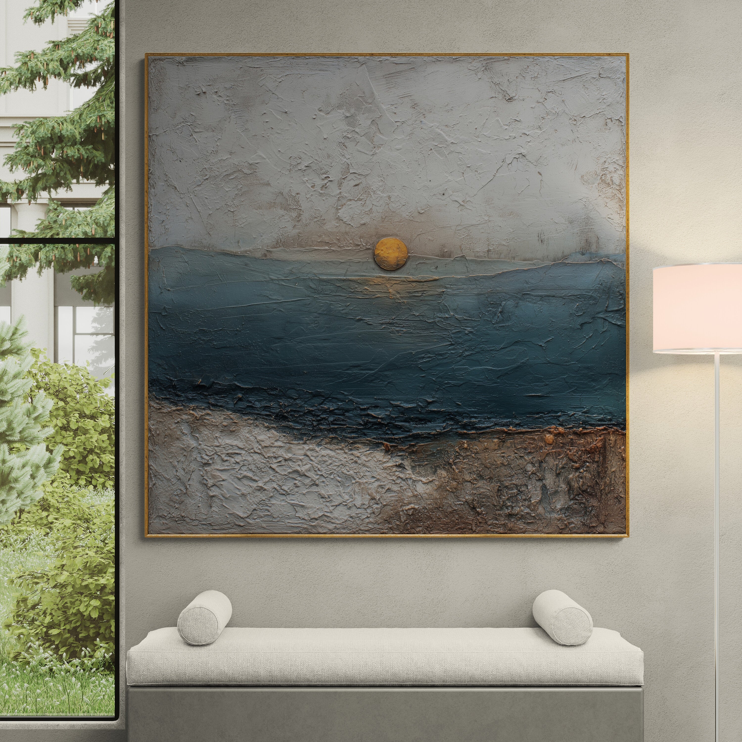 Abstract landscape with layered texture, deep blues, earthy tones, and a subtle golden accent. Calm, modern elegance—elevate your space today.