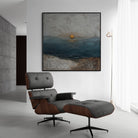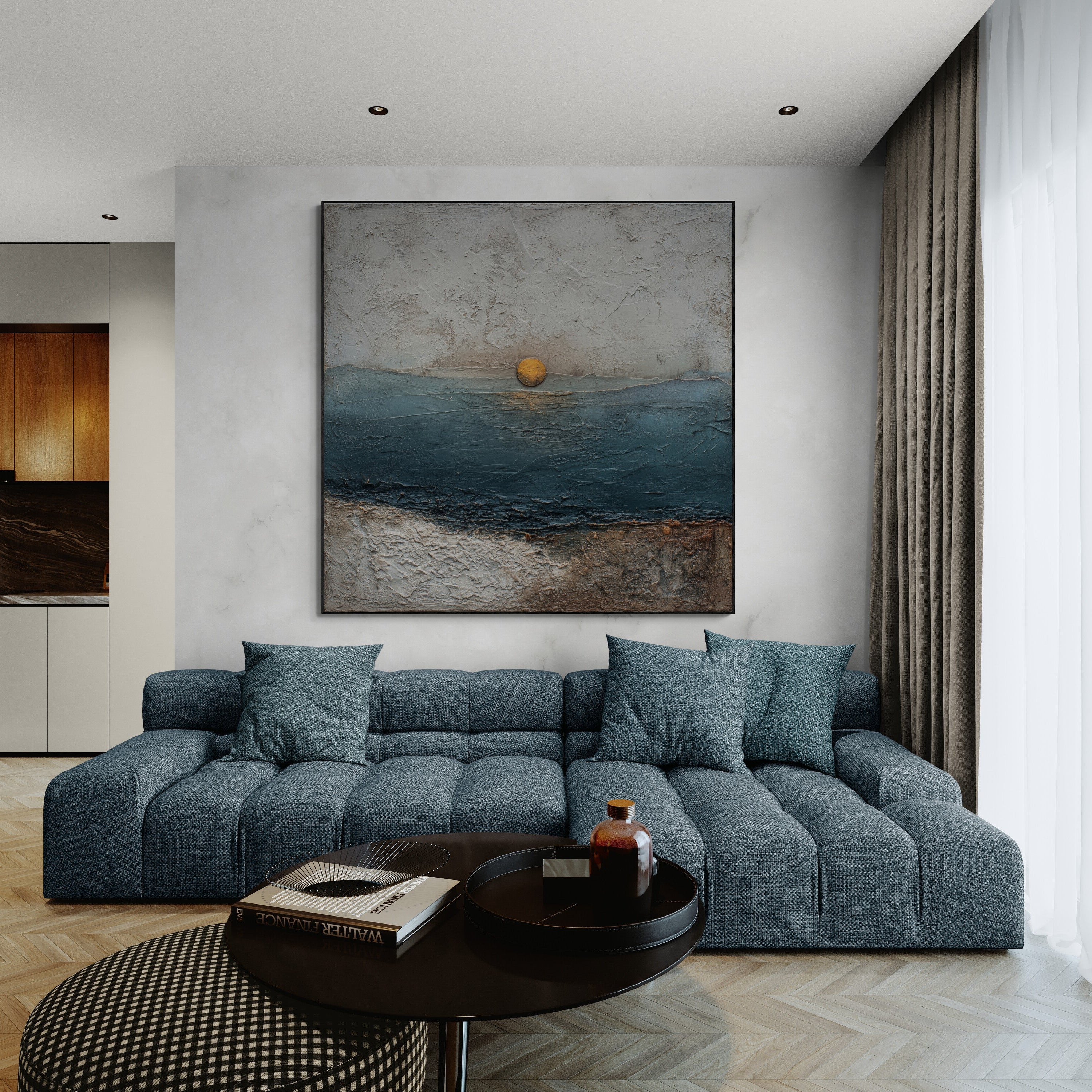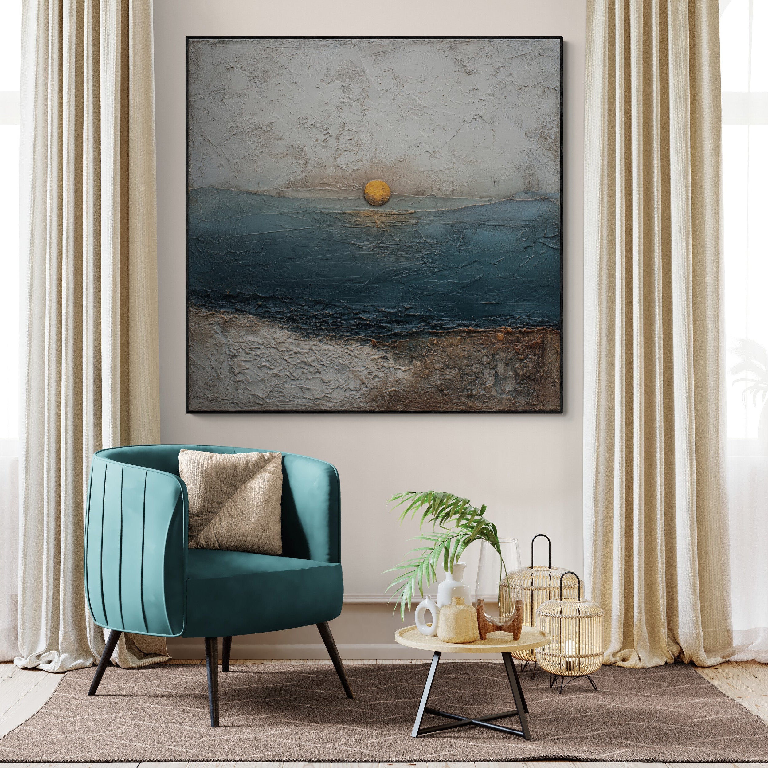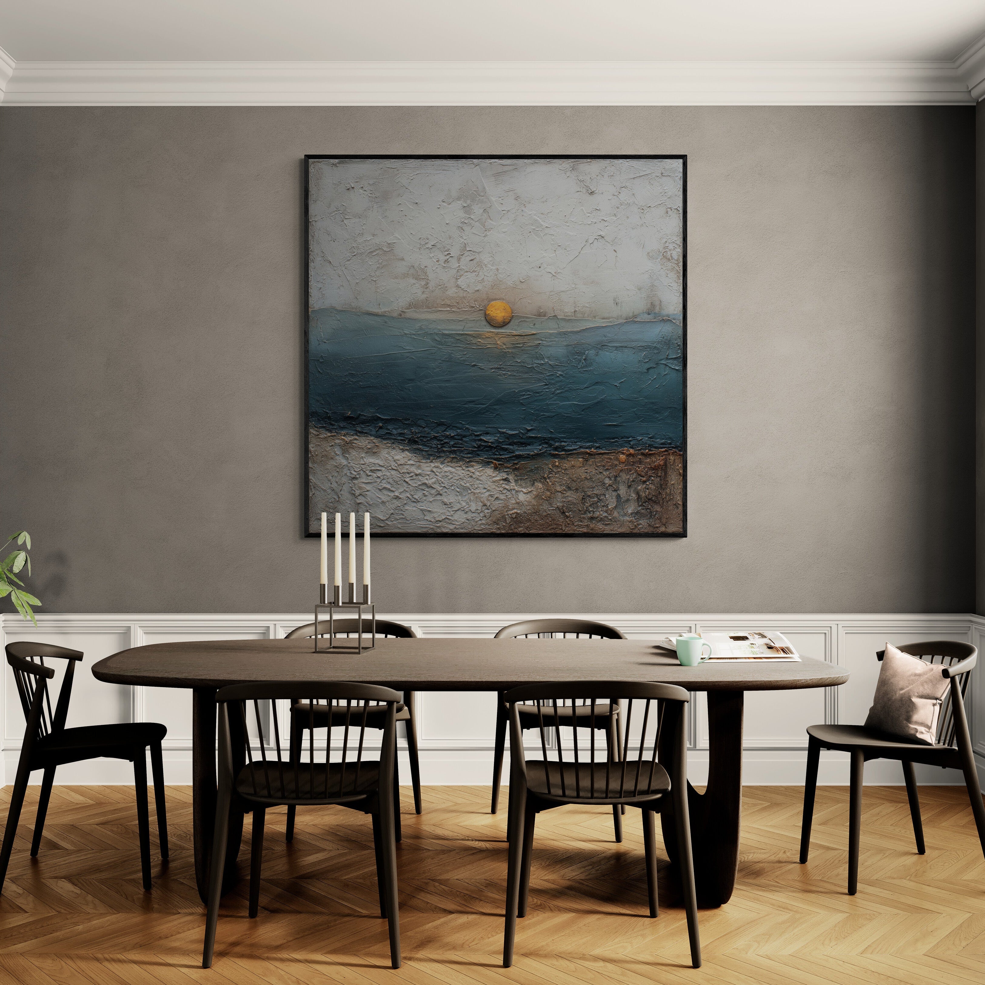 Abstract landscape with layered texture, deep blues, earthy tones, and a subtle golden accent. Calm, modern elegance—elevate your space today.