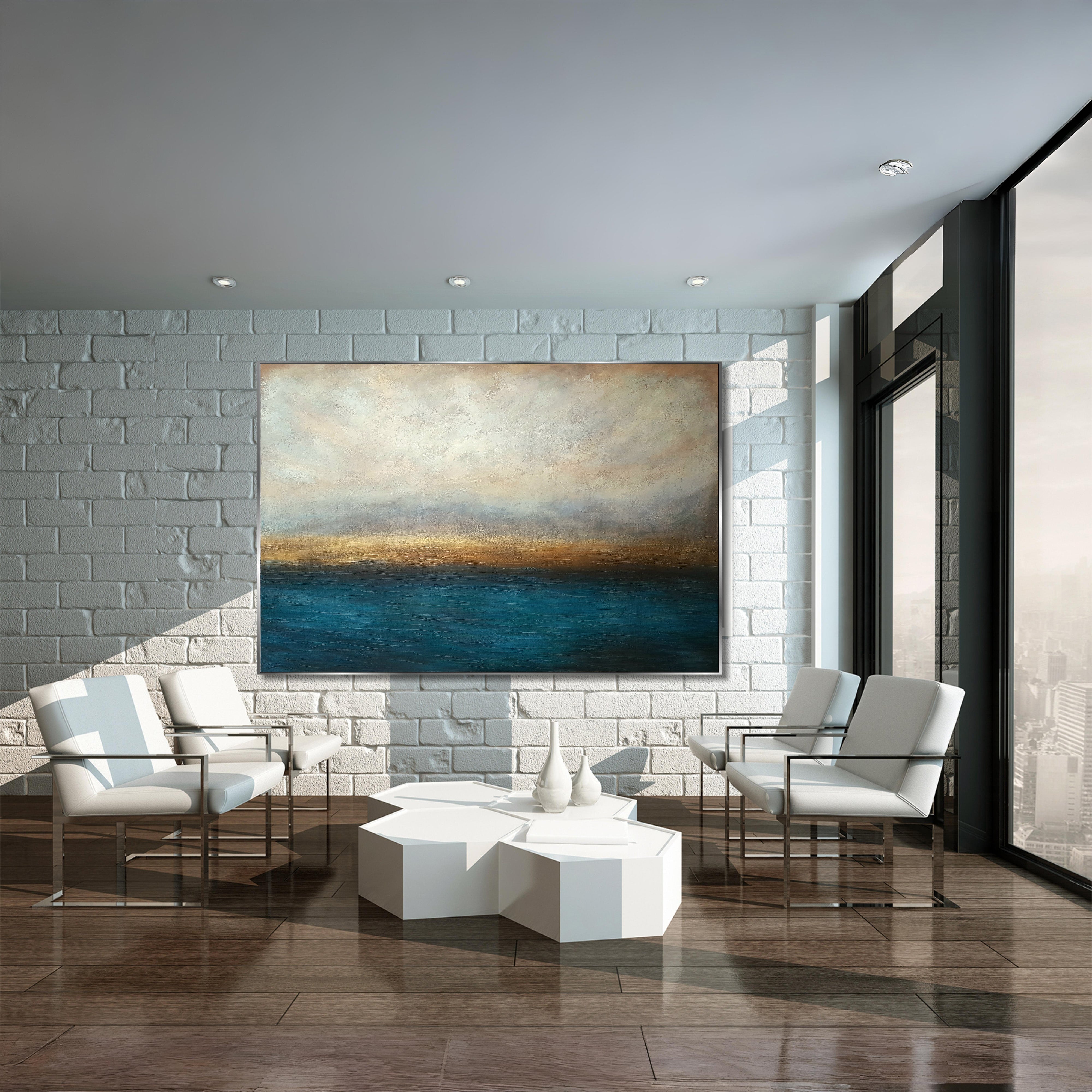 Available in multiple sizes. Ships worldwide, rolled or stretched, with full insurance. A calming horizon for your walls.