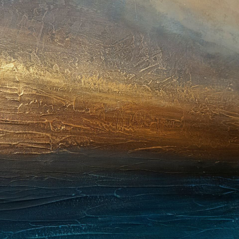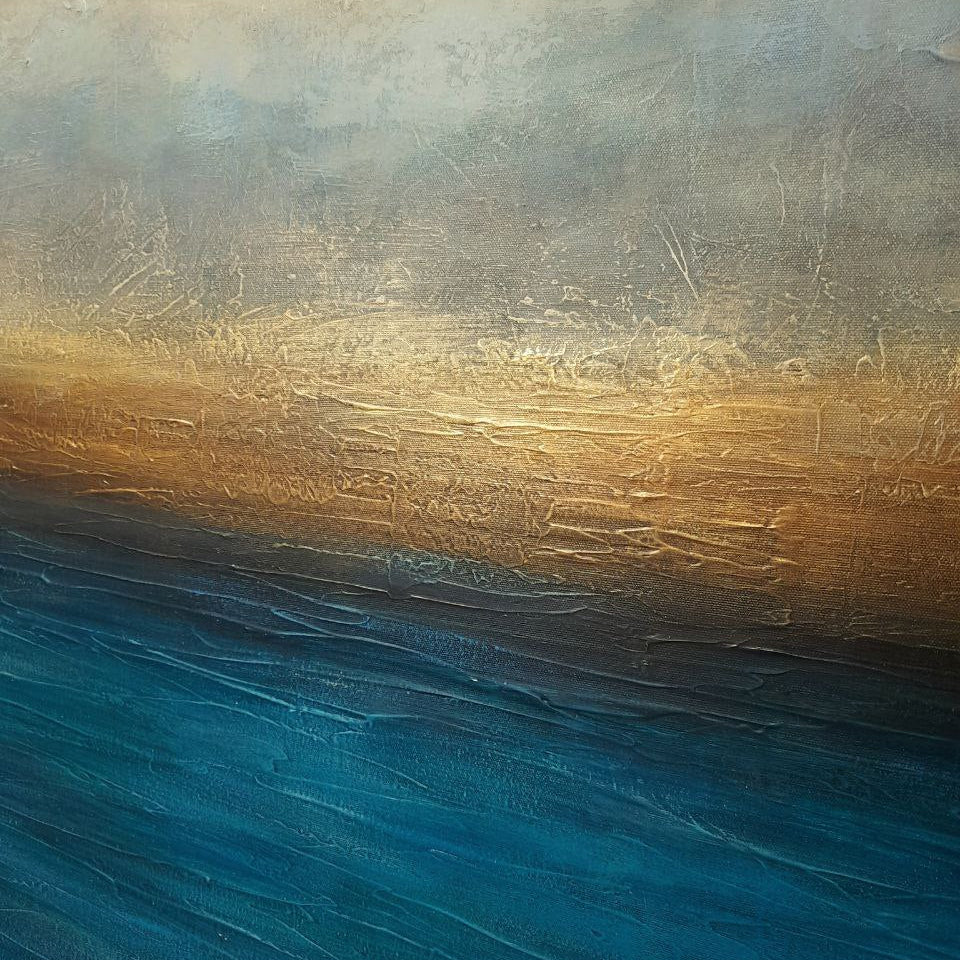 A tranquil blend of ocean blues, misty grays, and warm golden tones—this abstract seascape captures the fleeting moment where sky meets water at dusk. The textured surface adds depth and emotion, making it feel like a memory suspended in time.