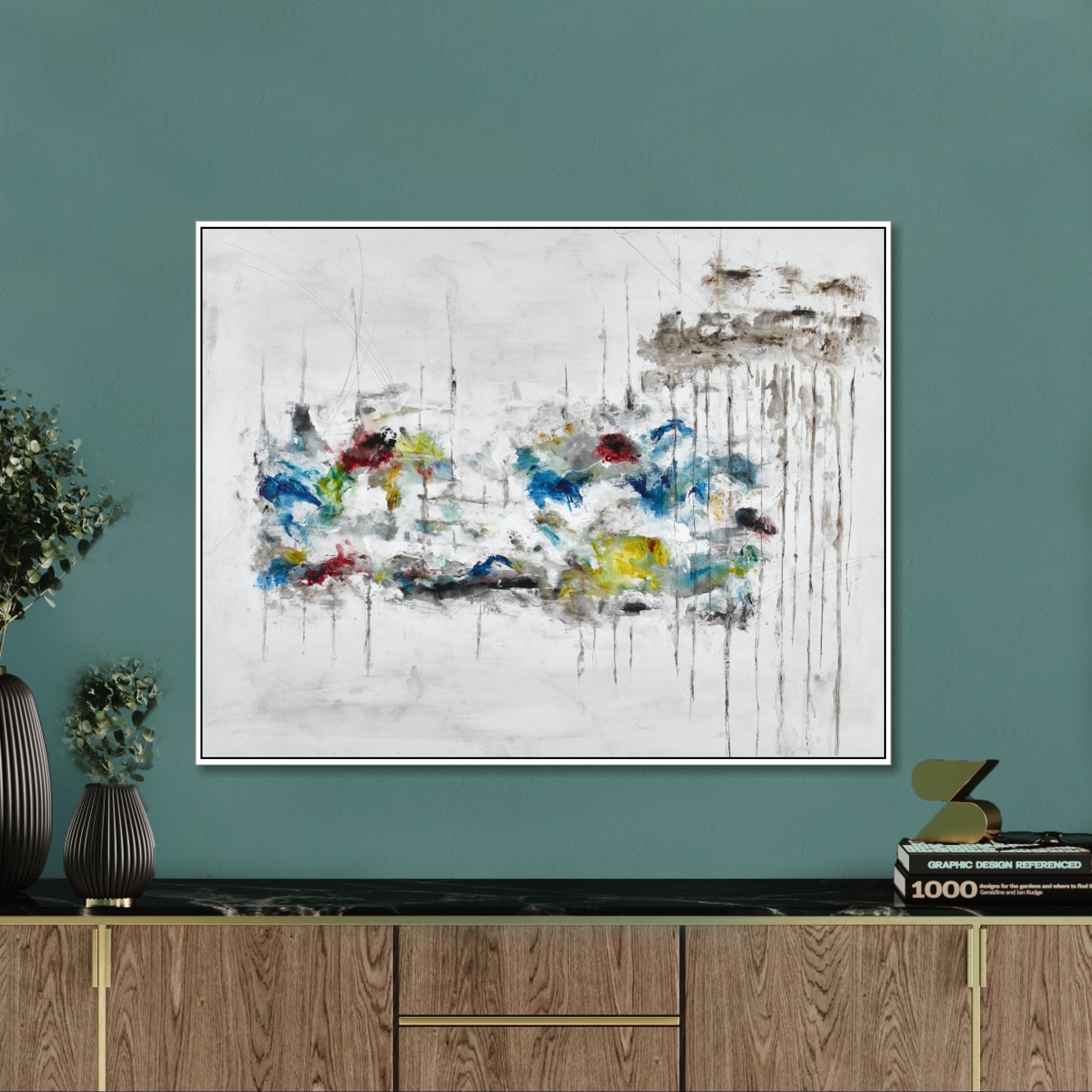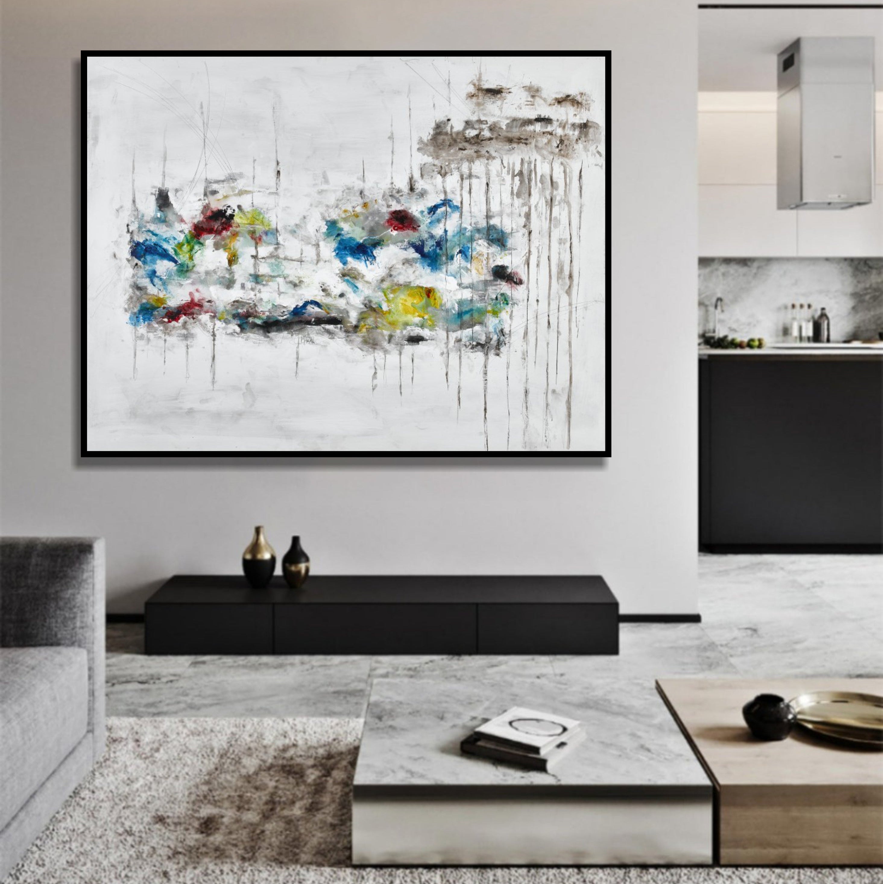 This original abstract oil painting collection is featured with modern artworks where are different variations of white color predominates or is noticeable. White is bright and can create a sense of space or add highlights. Designers use it to make a premise seem larger. Also, it is perfect as a spot to rest the eye in colorful rooms, and add texture to a minimalist interior. The element of white color expresses metal. Wood and glass accents go extraordinarily well with white, while the pieces of black color will balance it out. White shades in abstract art painting are great for kitchens, living rooms, bathrooms, and bedrooms.