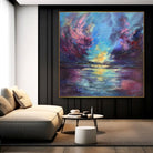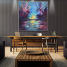 In this captivating color painting, the canvas becomes a portal to an abstract sunset, where the hues of blue and purple converge in a breathtaking display of celestial radiance. The artist's brush, charged with the essence of twilight, has given life to a composition that transcends the ordinary boundaries of the horizon.
