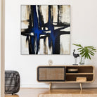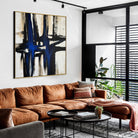 Elevate your space with this modern abstract art piece, featuring minimalist geometric shapes and a striking color palette of black, blue, beige, and white. Perfect for contemporary interiors, this large canvas painting combines subtle elegance with bold accents. Its industrial aesthetics and abstract lines create a sophisticated focal point in any room. Ideal for those seeking to enhance their decor with a blend of modern design and minimalist expression. Transform your home with this unique artwork.