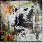 "Bear Roar" is a powerful and dynamic painting that captures the raw strength and primal energy of a roaring bear. The central figure, depicted with meticulous detail and realism, dominates the composition with its open maw and fierce expression, exuding an aura of dominance and power. Surrounding the bear, the background is a vibrant mix of earthy tones and abstract elements, including splashes of green, orange, and graffiti-like text, which add a contemporary and gritty edge to the piece. This painting evokes a sense of awe and respect for the wild, making "Bear Roar" a compelling statement piece that commands attention and admiration.