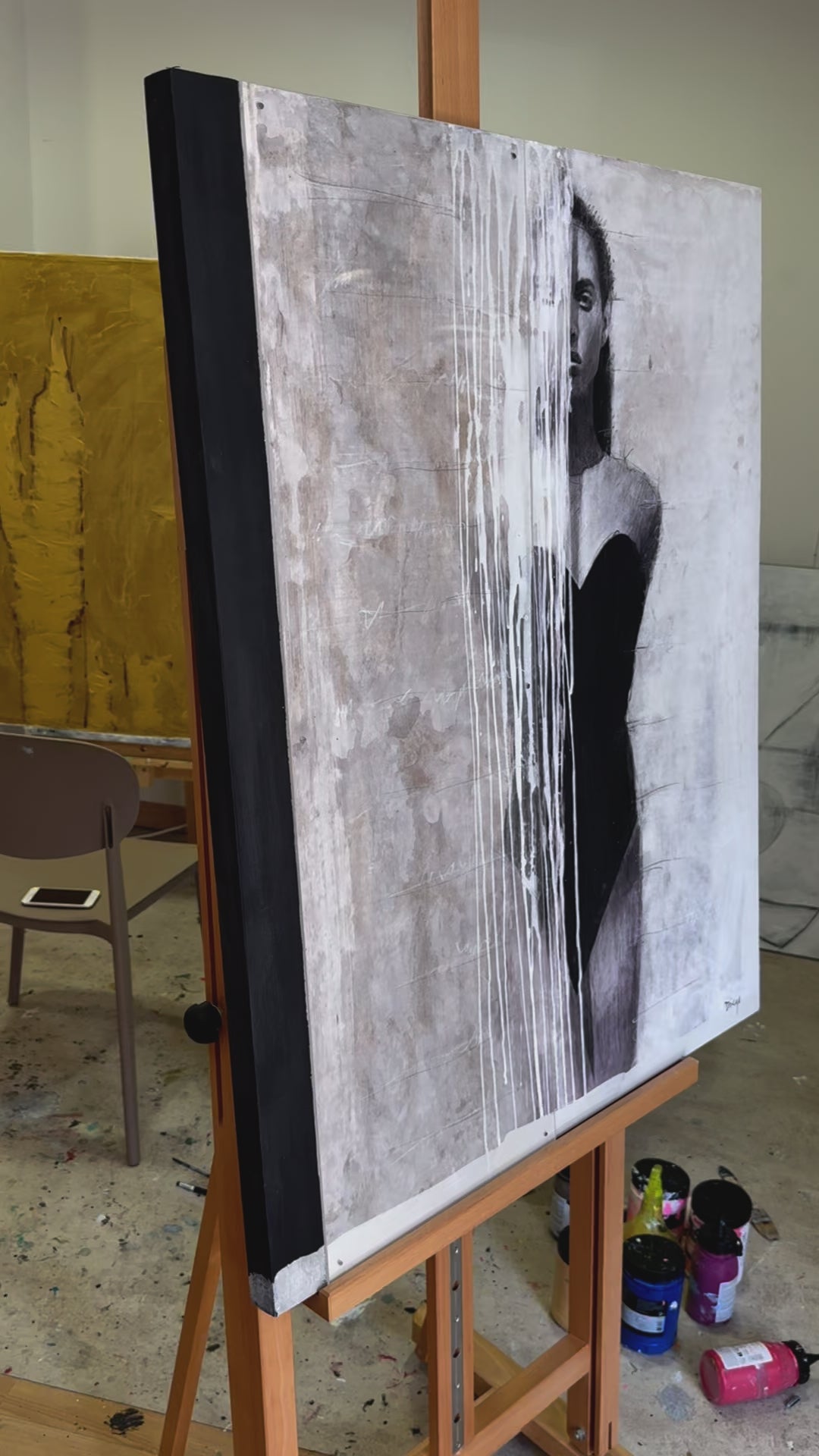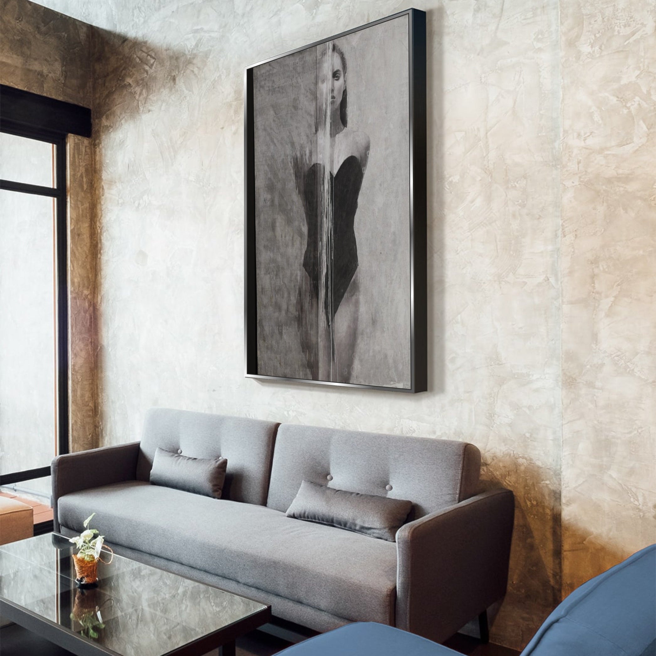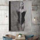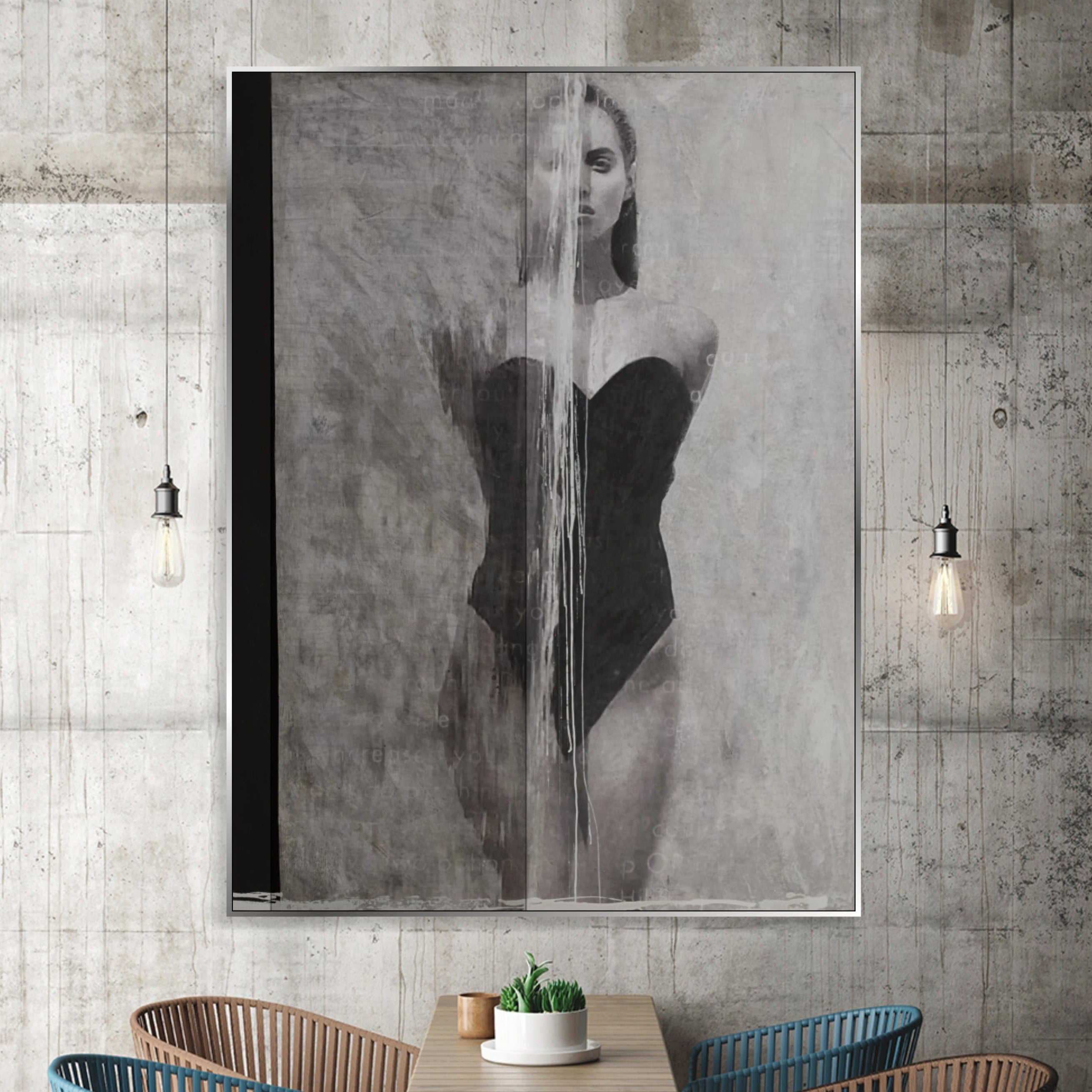 "Silhouette of Grace" presents a striking blend of photorealism and abstract art. It captures a moment of contemplative elegance with its lifelike depiction of a female form, set against a canvas of dripping grays, symbolizing both strength and vulnerability. The grayscale palette exudes a timeless sophistication, making this piece an impactful statement in any modern interior. Each stroke celebrates the beauty of feminine poise, offering a mesmerizing visual narrative that is both intimate and bold.