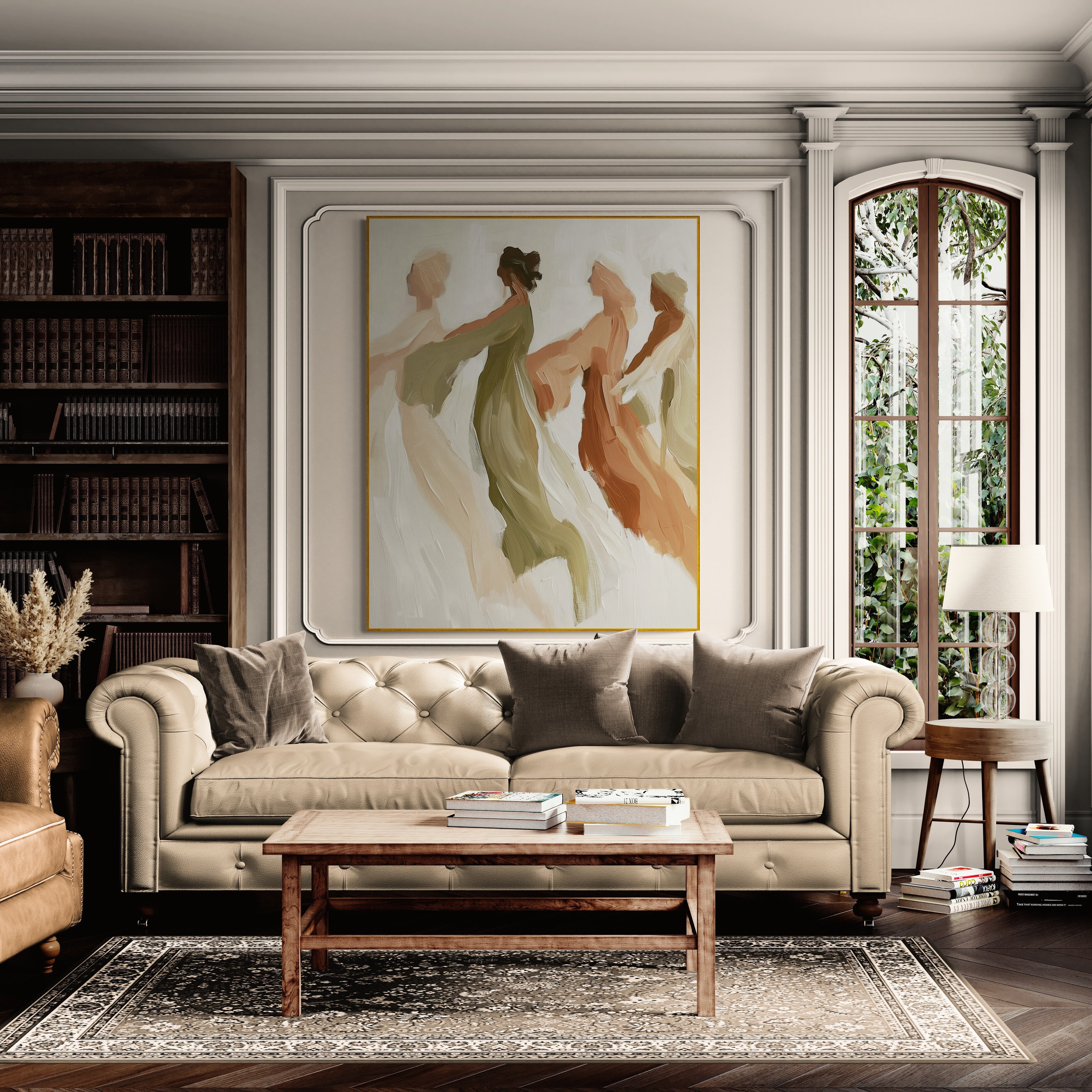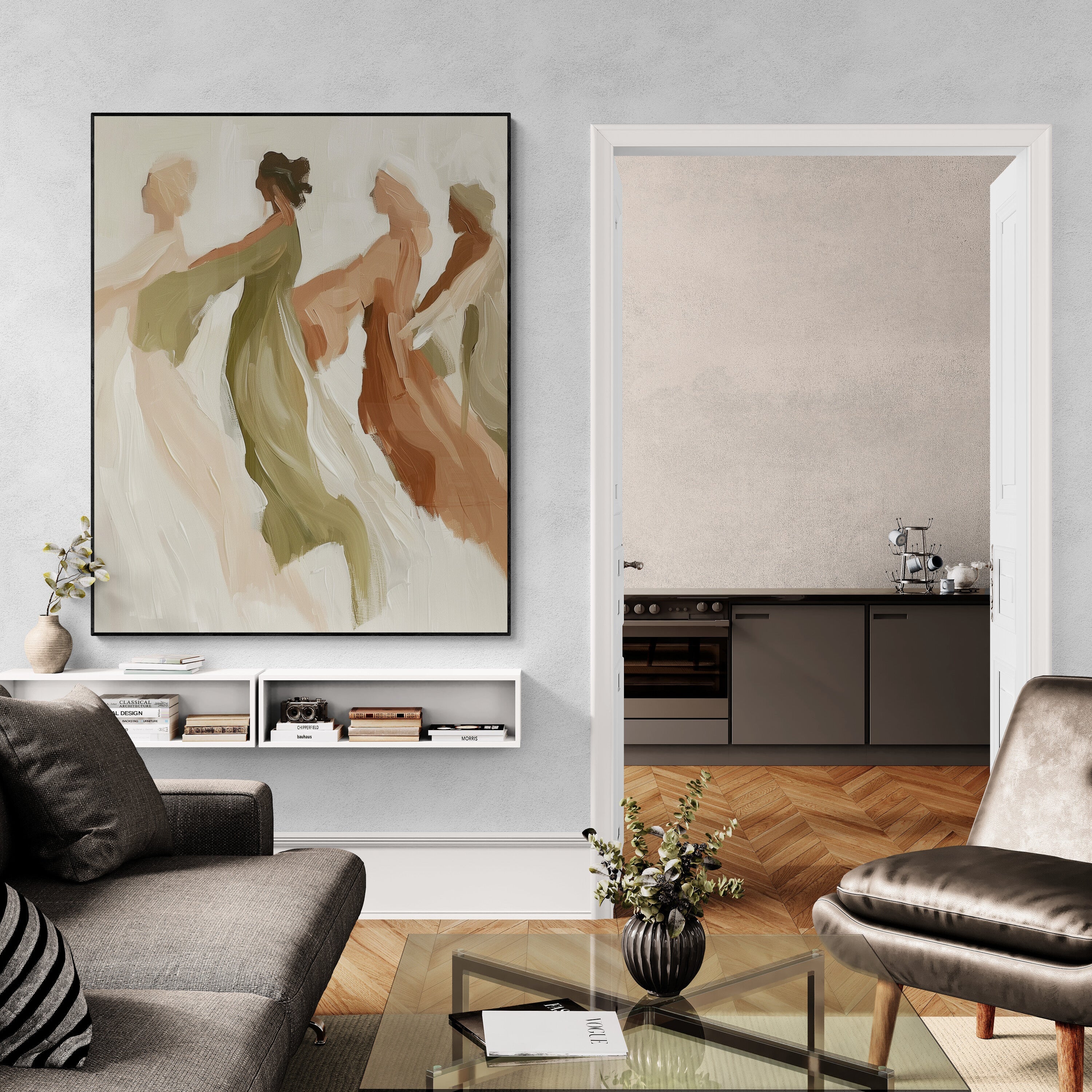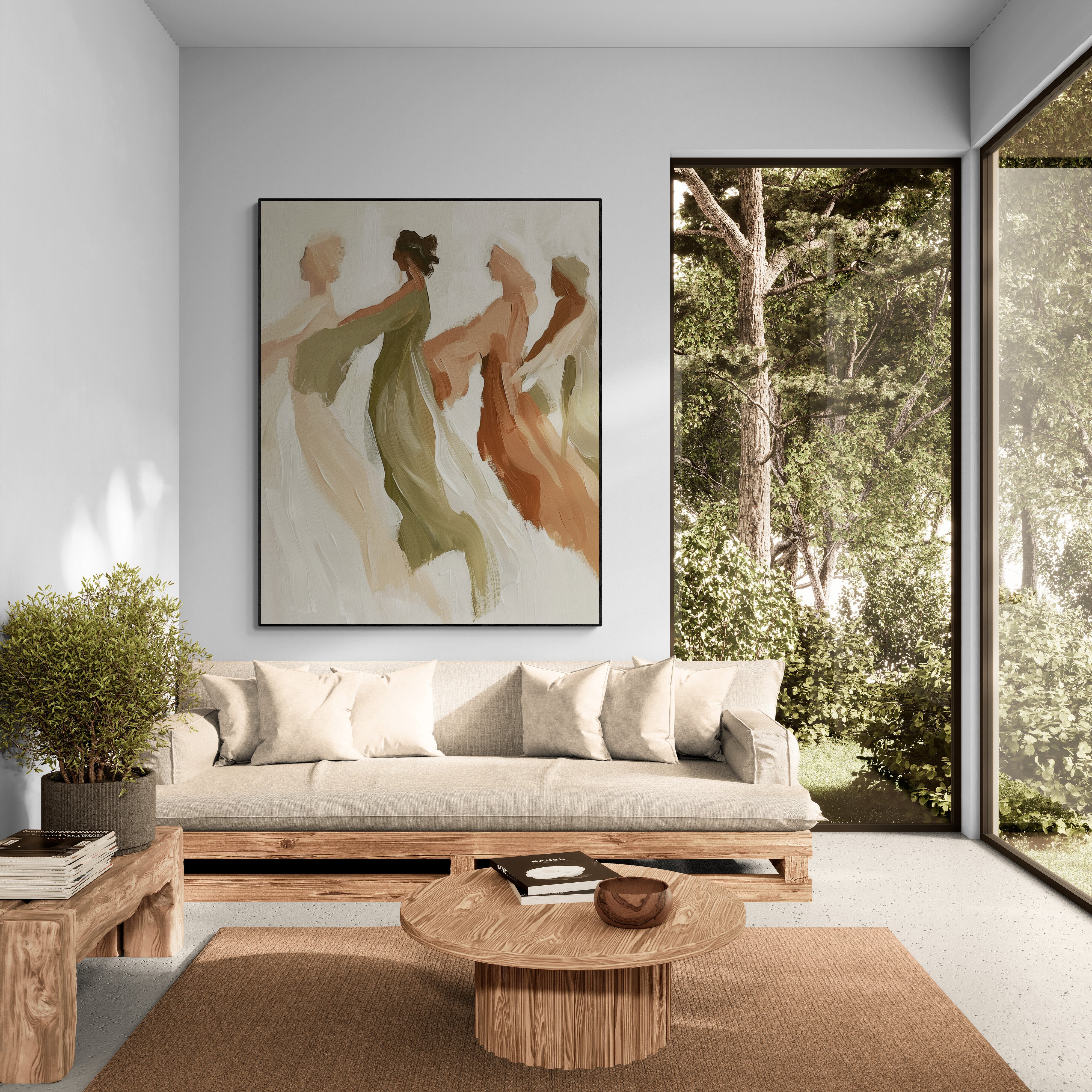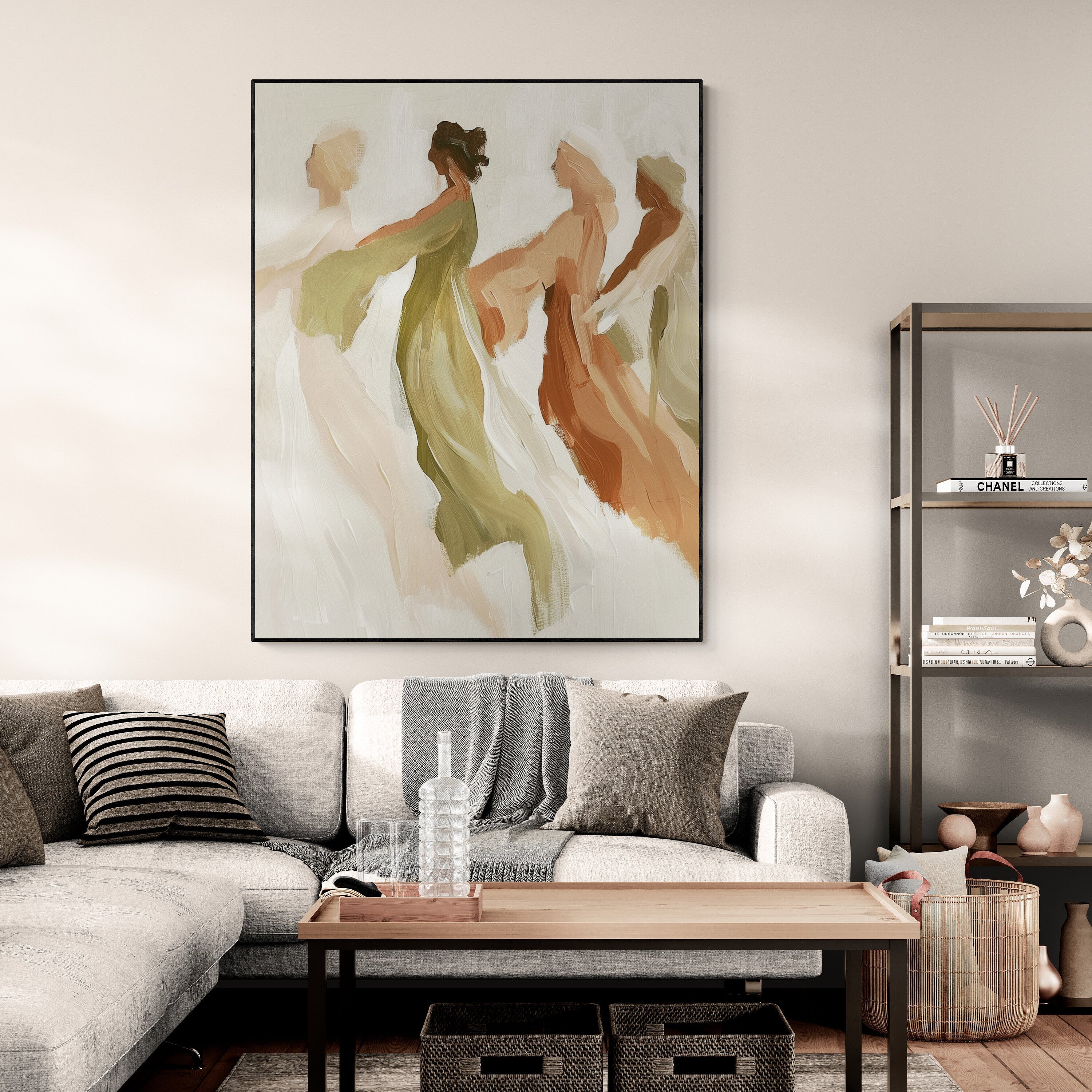 This elegant painting captures the fluid grace of four figures moving in harmony, their forms softly blending into one another like a dance of light and air. With earthy tones of olive, terracotta, and beige, the artist conveys warmth, unity, and timeless femininity. The blurred edges and sweeping brushstrokes evoke a sense of freedom and serenity, as if the figures are caught between dream and reality — a fleeting moment of connection and gentle motion.