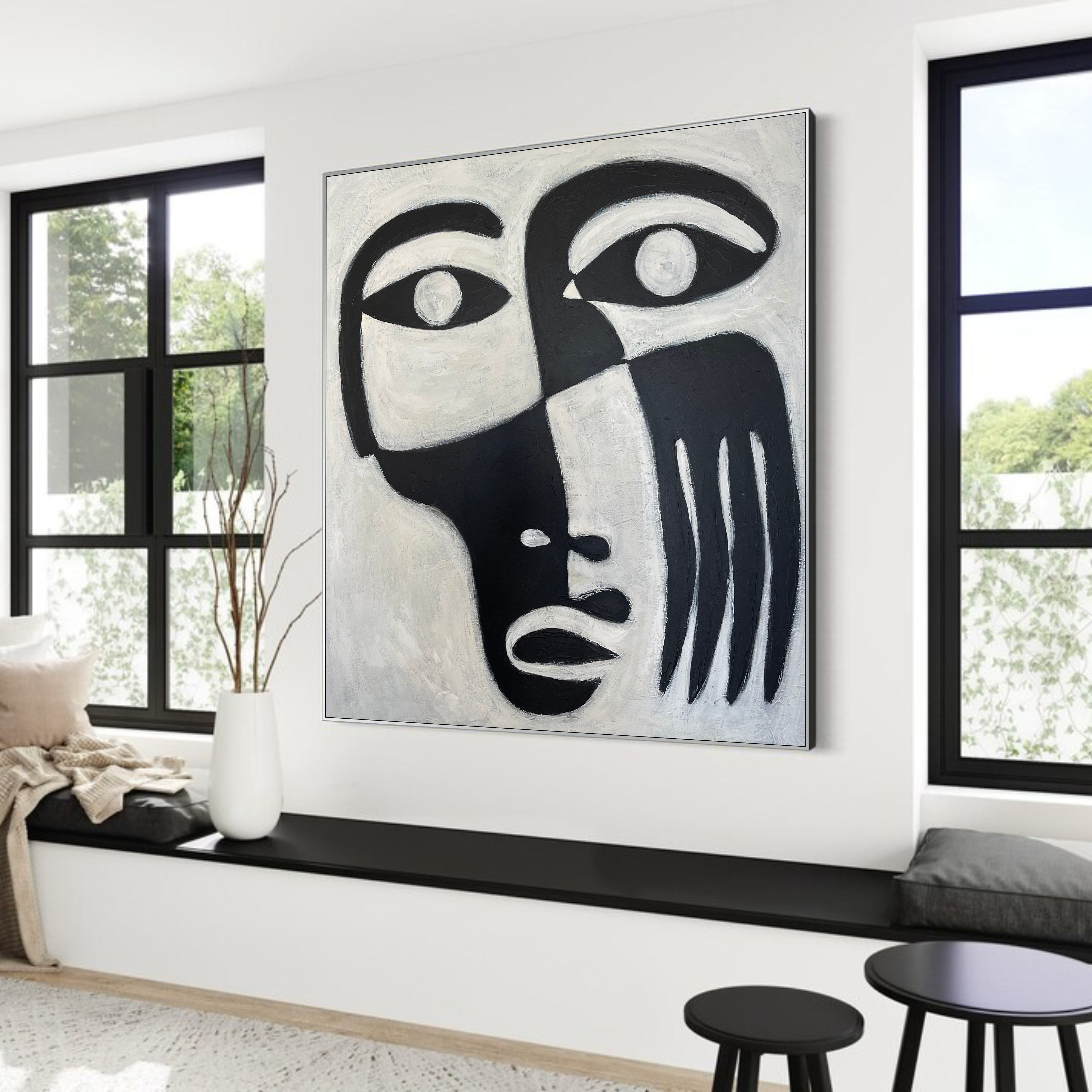 In this captivating black and white painting, an abstract face emerges as a visual symphony of contrasts and contours. The artist employs a monochromatic palette to create a powerful and enigmatic portrayal, capturing the essence of emotion and expression through dynamic abstraction.