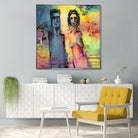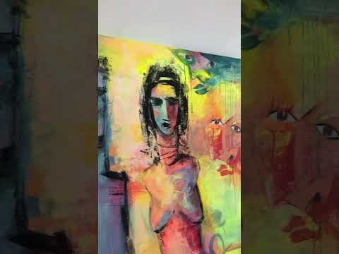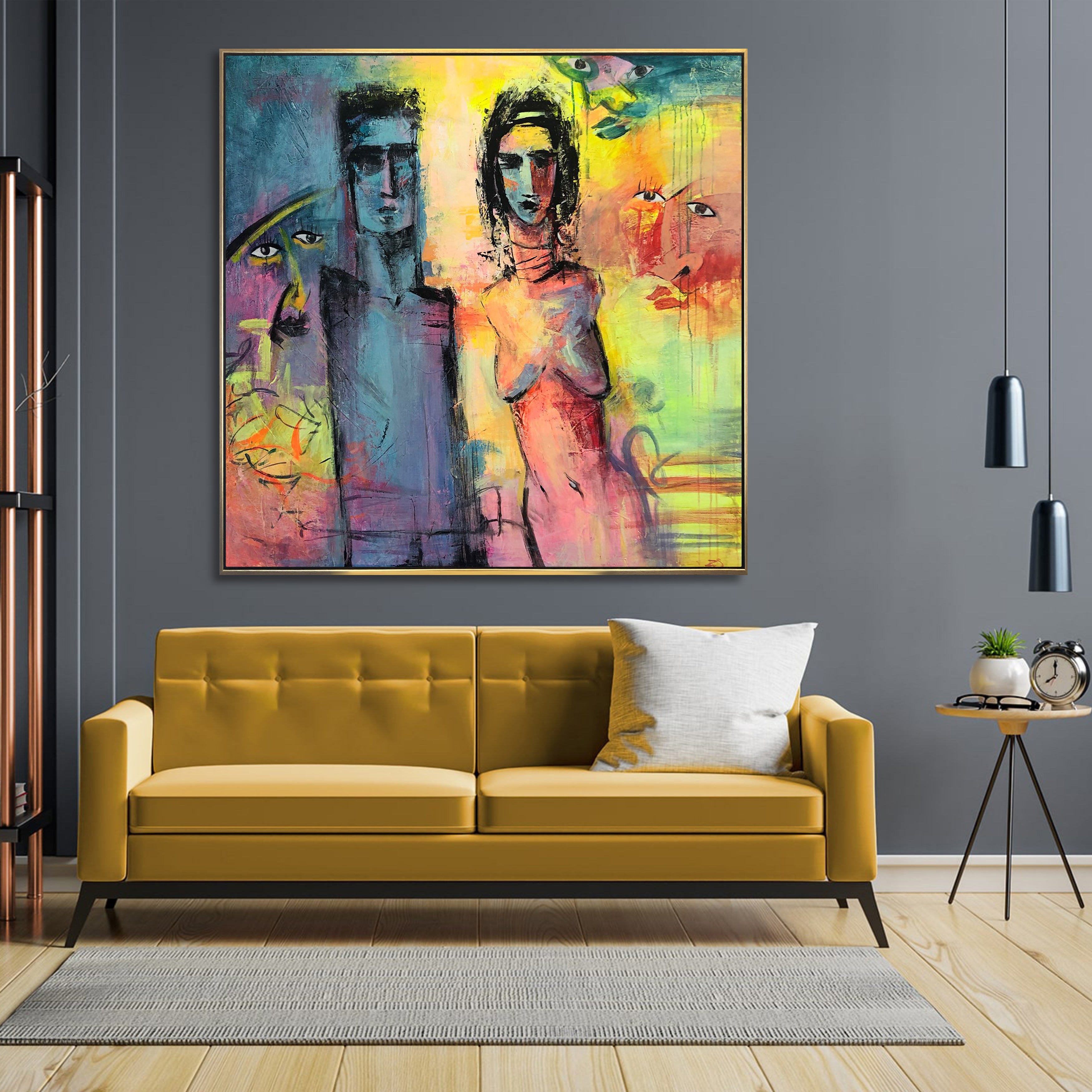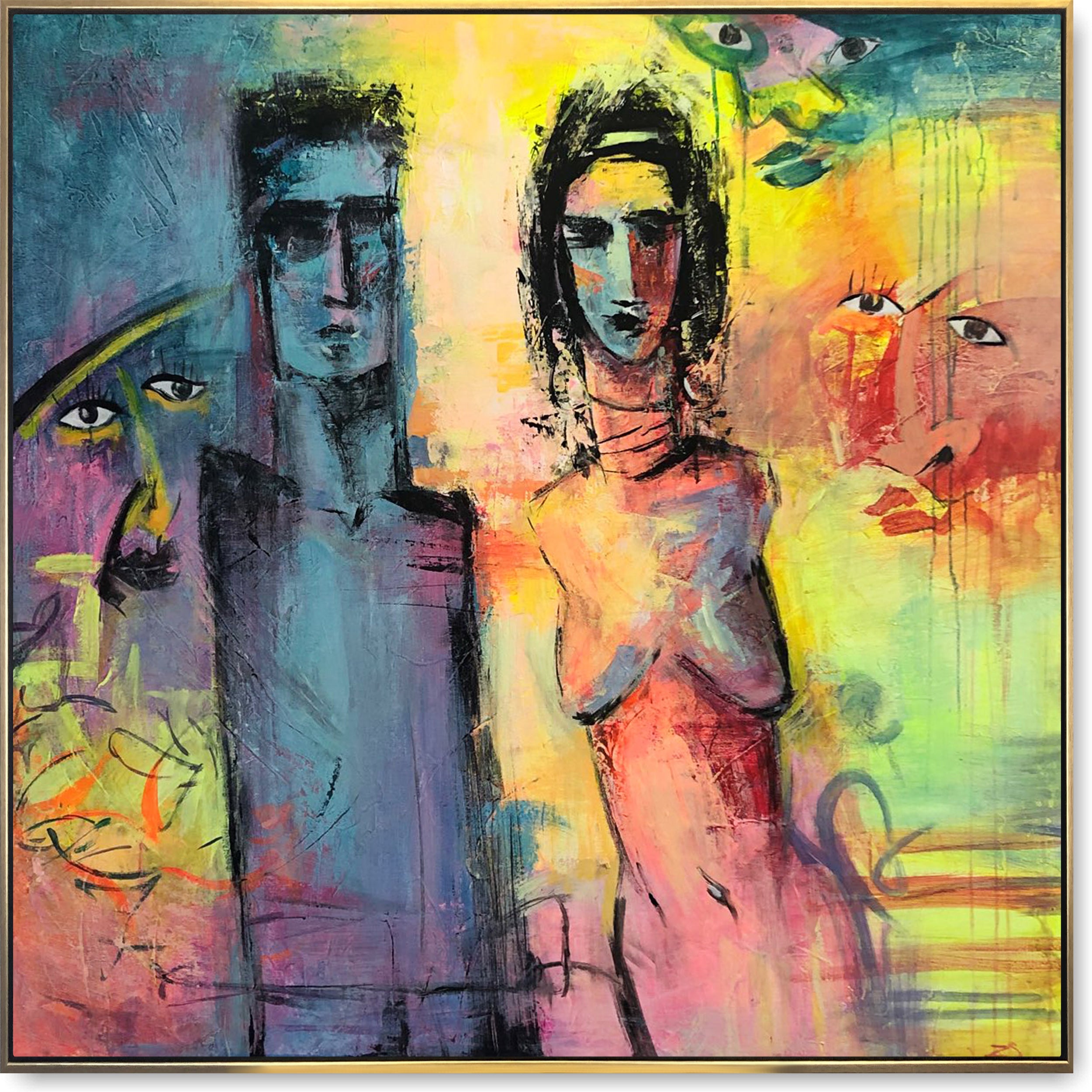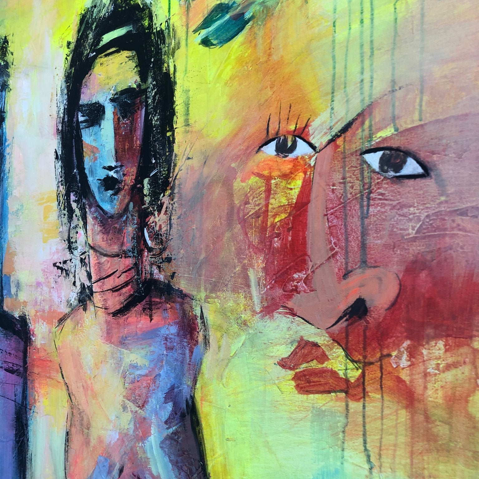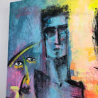 This vibrant painting showcases two elongated, abstract human figures, prominently displayed against a colorful, textured background. The use of bold, expressive brushstrokes and vivid hues creates a dynamic interplay of light and shadow, giving the composition an intense emotional depth. Surrounding the central figures are several fragmented faces and shapes, adding a surreal and mysterious element to the overall piece.