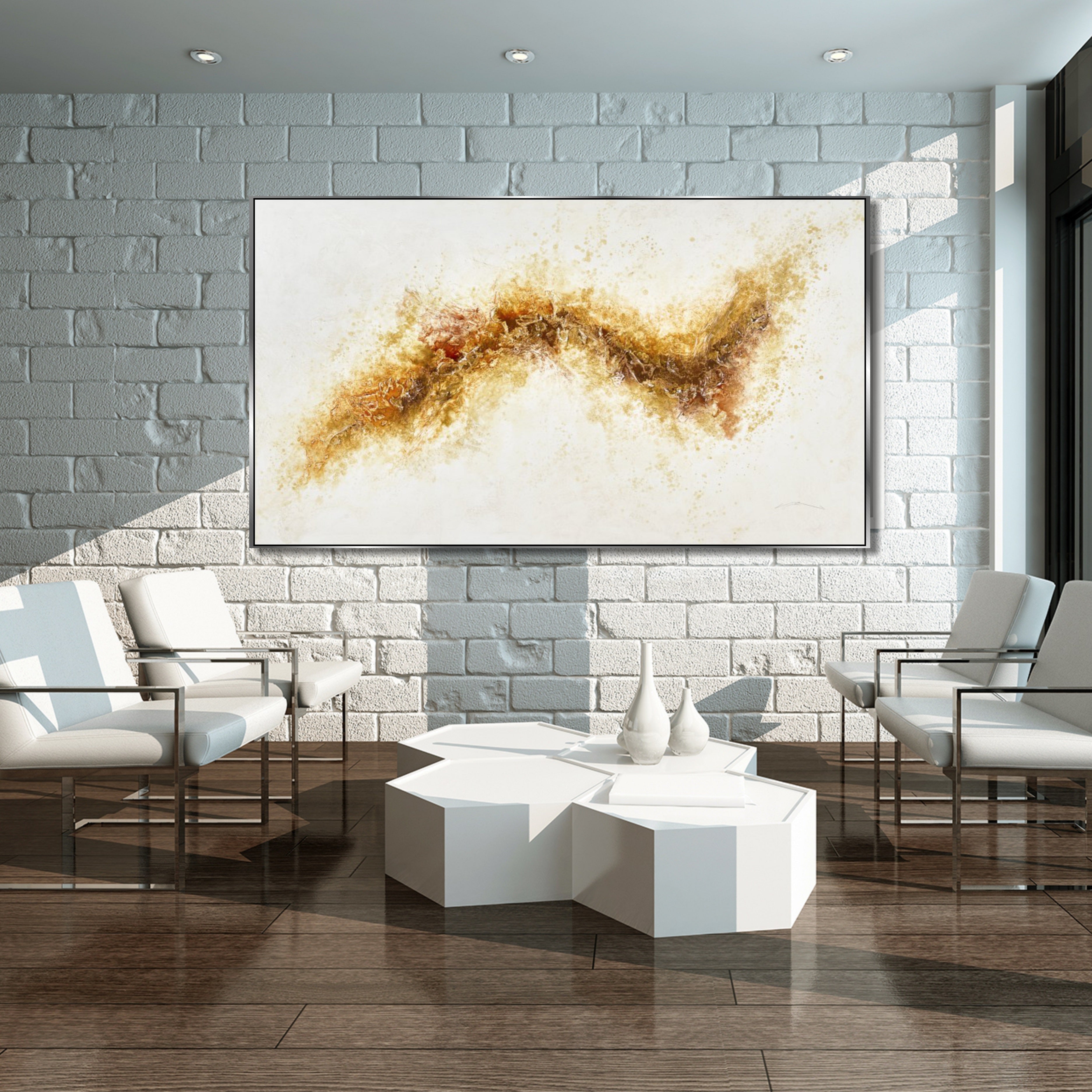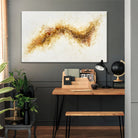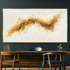 "Golden Nexus" invites a sense of organic elegance with its rich, earthy tones and textured gold center, embodying a natural fusion. The abstract form appears almost alive, evoking the beauty of natural elements colliding. Ideal for a luxurious space, this painting brings warmth and a sophisticated ambiance to any room.