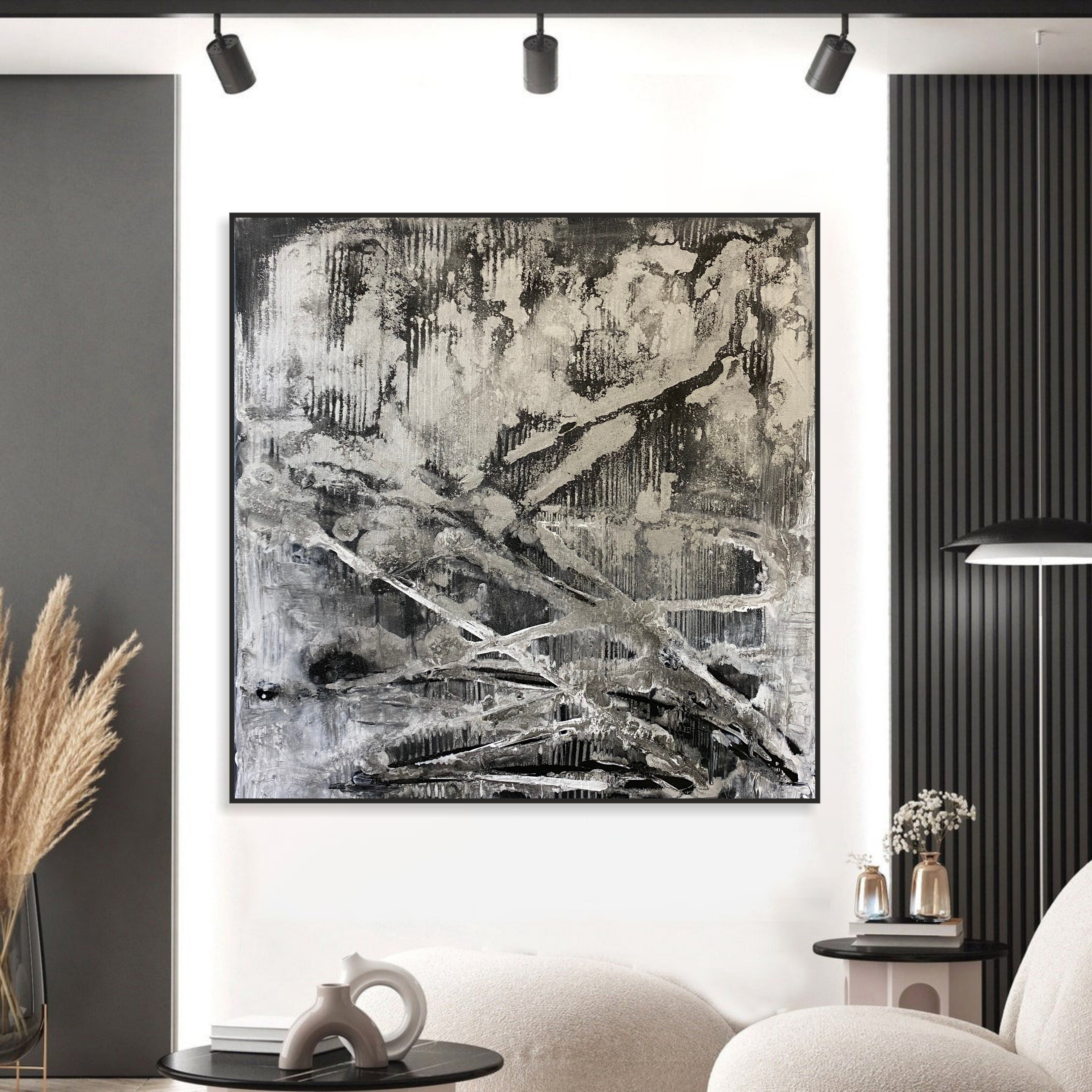 "CHAOTIC ENERGY" is a captivating abstract composition on canvas, featuring layers of swirling greys that evoke a sense of dynamic movement and intensity. With its modern textured surface and monochrome palette, this minimalist artwork exudes raw energy and complexity. A striking addition to any space, it offers a unique interpretation of chaos and order, inviting viewers to explore the depths of its mesmerizing abstraction.