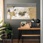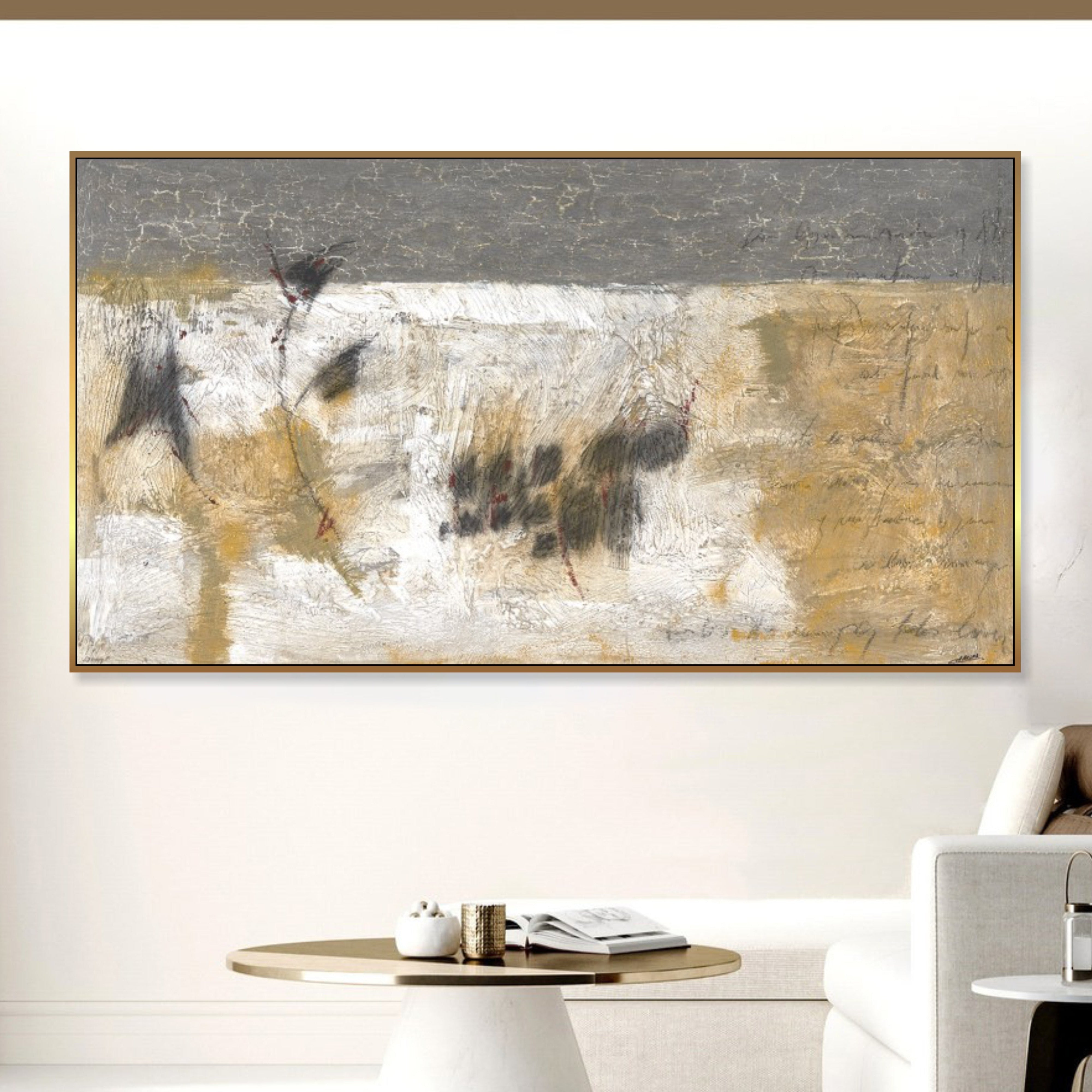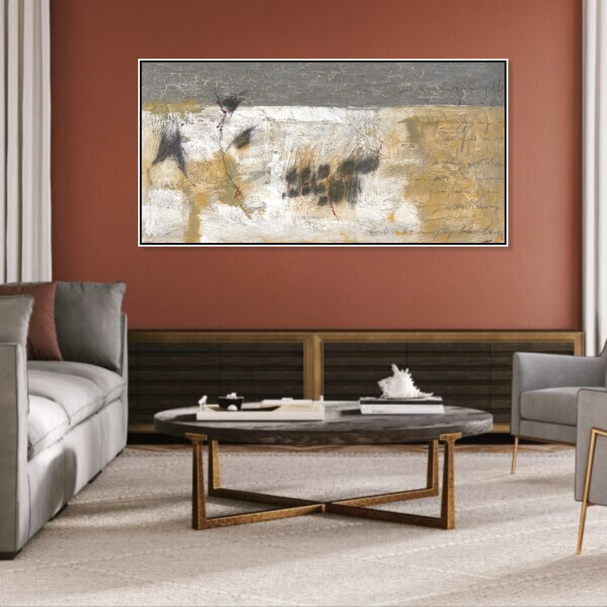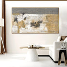 'Elegant Hues' is a serene and elegant abstract piece that speaks in subtle textures and soothing earth tones. Gold whispers alongside white and beige, grounded by bold grey and black strokes. A perfect harmony of color and form, this painting evokes a sense of calm and sophistication for any modern space. Ideal for collectors who appreciate the beauty in minimalist designs.