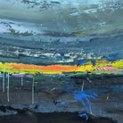 This abstract painting evokes the mood of a dramatic evening sky, with deep blues and greys dominating the canvas. A vibrant strip of yellow and orange near the horizon contrasts sharply with the darker tones, suggesting the last light of a setting sun. The textured brushstrokes and layered colors add depth and intensity to the scene, creating a powerful visual impact. A minimal white frame enhances the artwork's bold and striking composition, emphasizing its dynamic and atmospheric qualities.