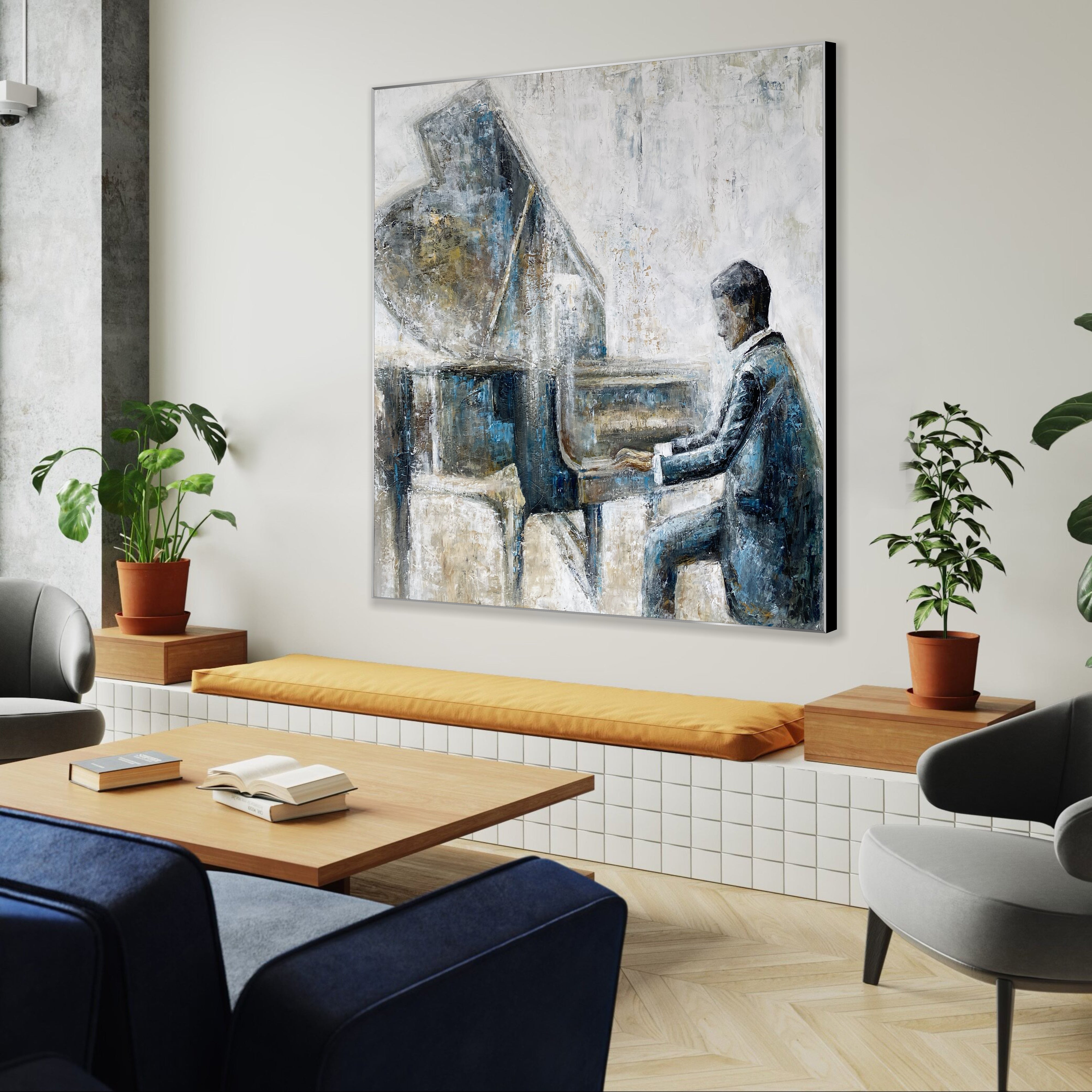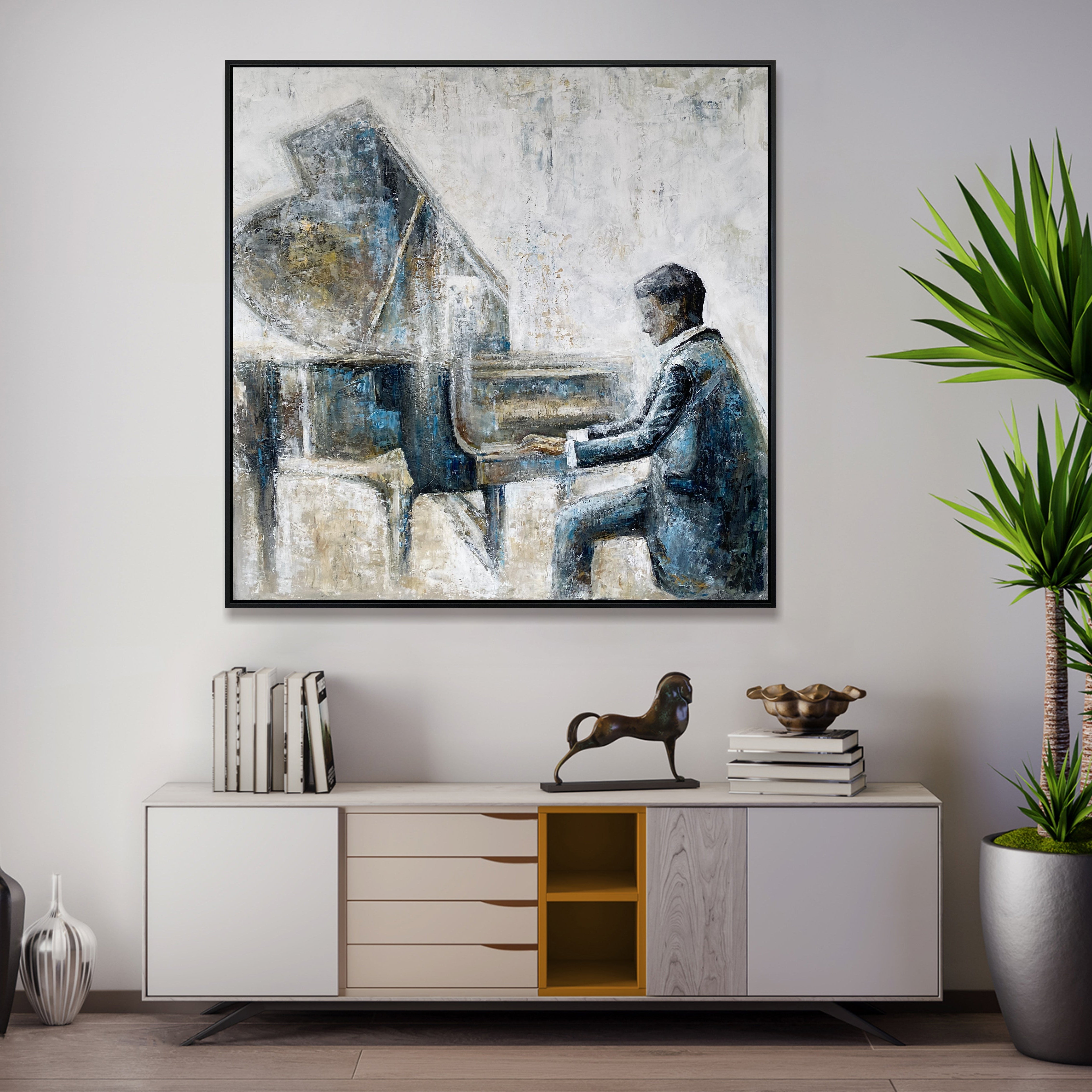 Immerse your space in the elegance of music with this stunning abstract pianist painting. Featuring a textured grand piano and a refined jazz musician, this impressionist artwork captures the essence of timeless melodies. Painted in soothing blue, gold, and neutral tones, it’s perfect for a music room, office, or sophisticated living space. A unique gift for musicians and art lovers, this hand-painted modern artwork exudes charm and artistic depth.