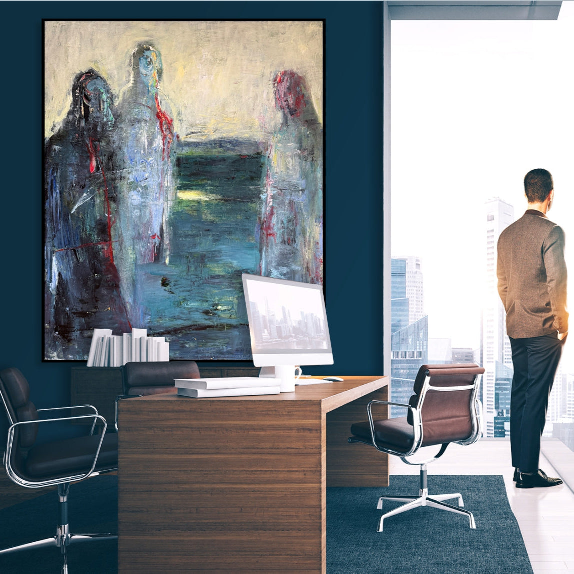 This captivating abstract expressionist painting, "Ethereal Reflections, " features human-like figures shrouded in an enigmatic, moody landscape. The artist's use of dark tones, including blue, black, and red, combined with textured mixed media techniques, creates a sense of depth and emotion. Perfect for adding a touch of contemporary sophistication to any gallery wall, this modern painting explores themes of human emotions and mystical presence. Ideal for art lovers seeking unique, thought-provoking pieces.