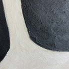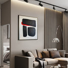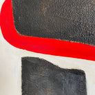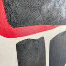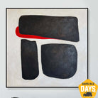 This minimalist painting features three bold, black shapes set against a stark white background, with a striking red accent peeking out from behind one of the forms. The simplicity of the geometric shapes and the limited color palette create a powerful visual impact, emphasizing the contrast between the elements. The composition's clean lines and strong colors give it a modern and abstract feel, making it a compelling piece for contemporary art lovers.