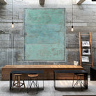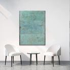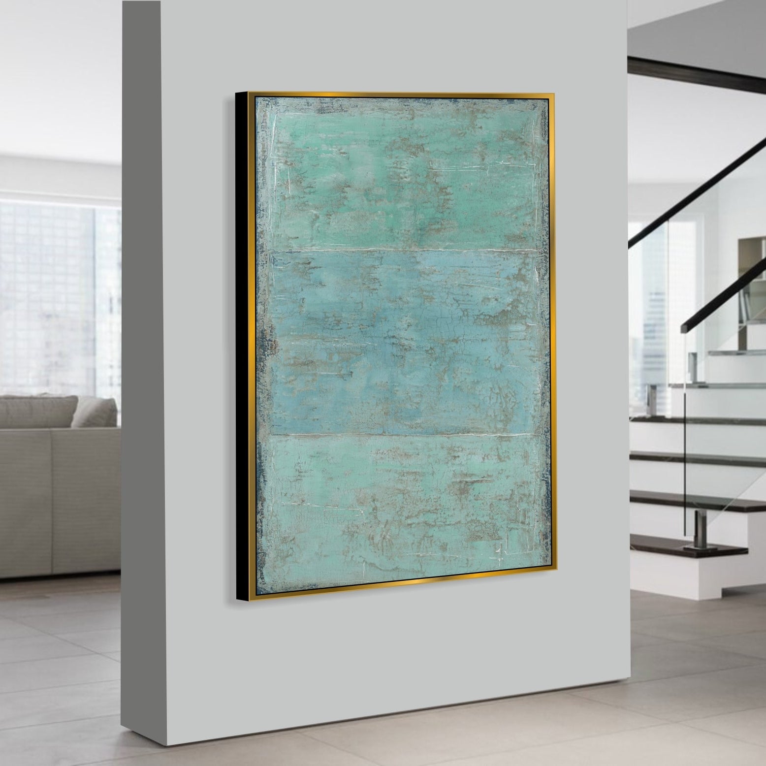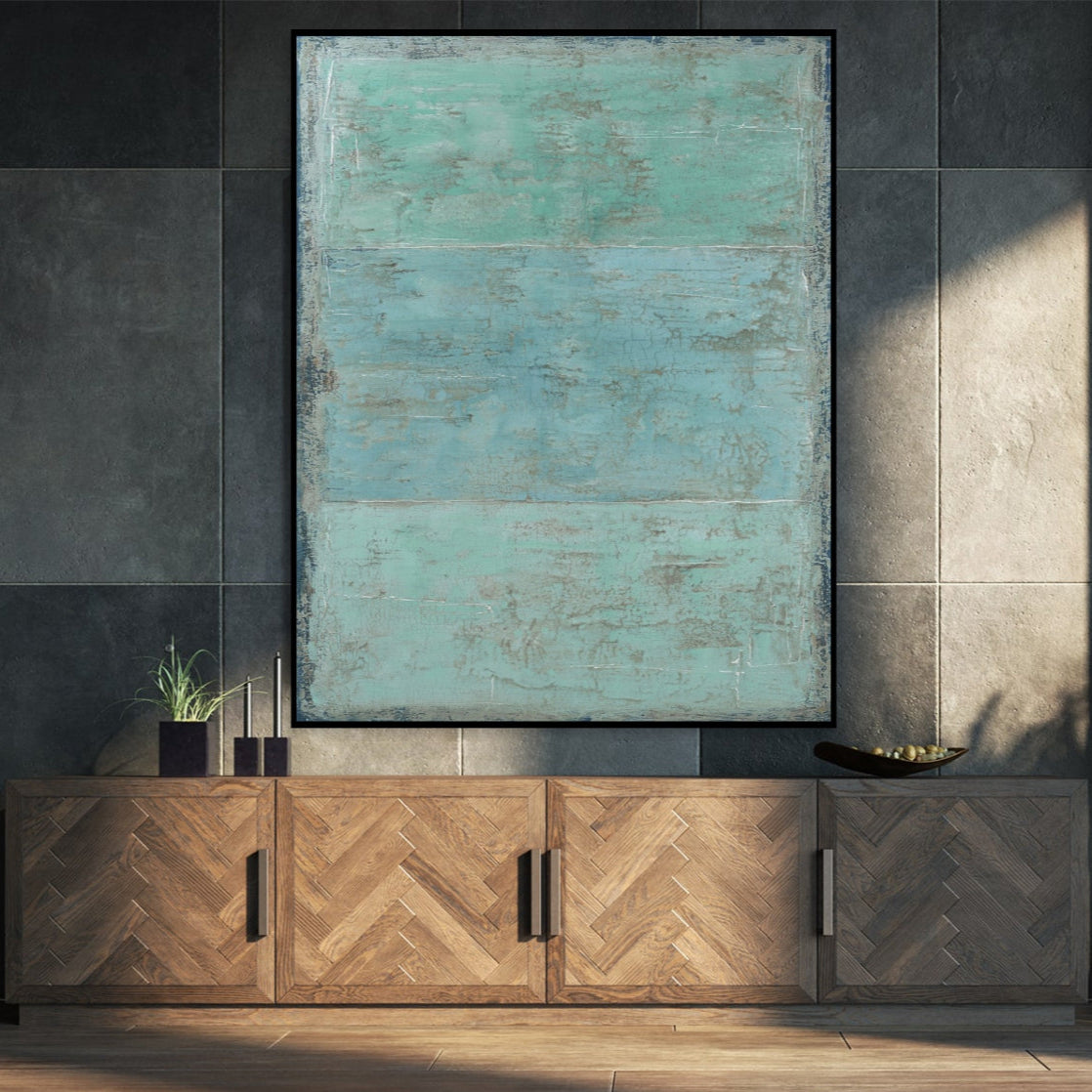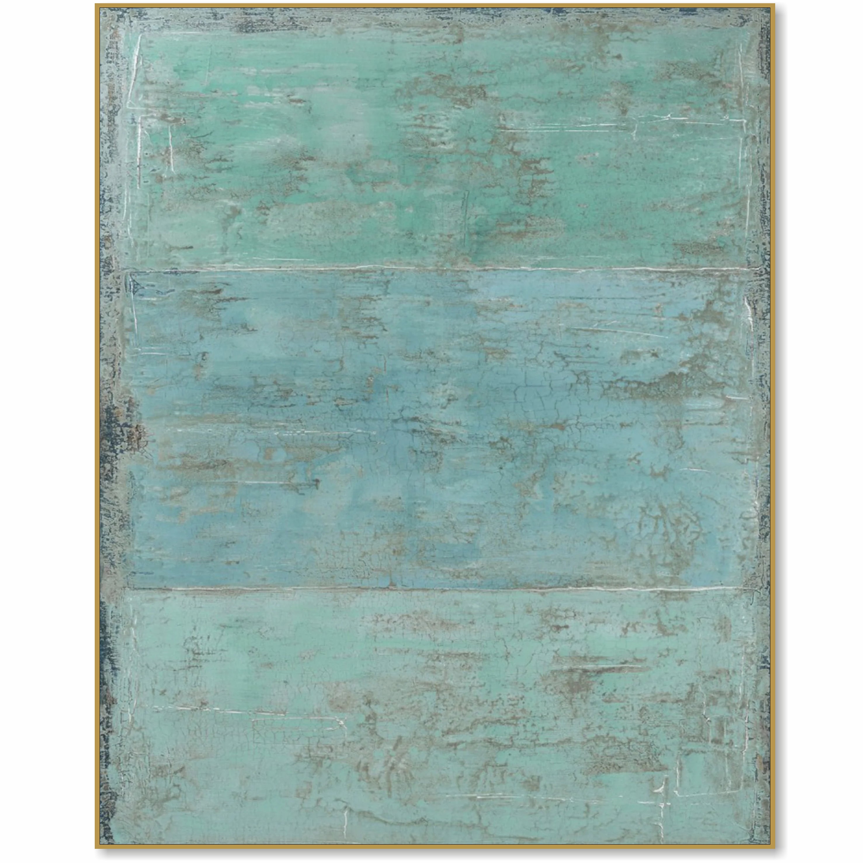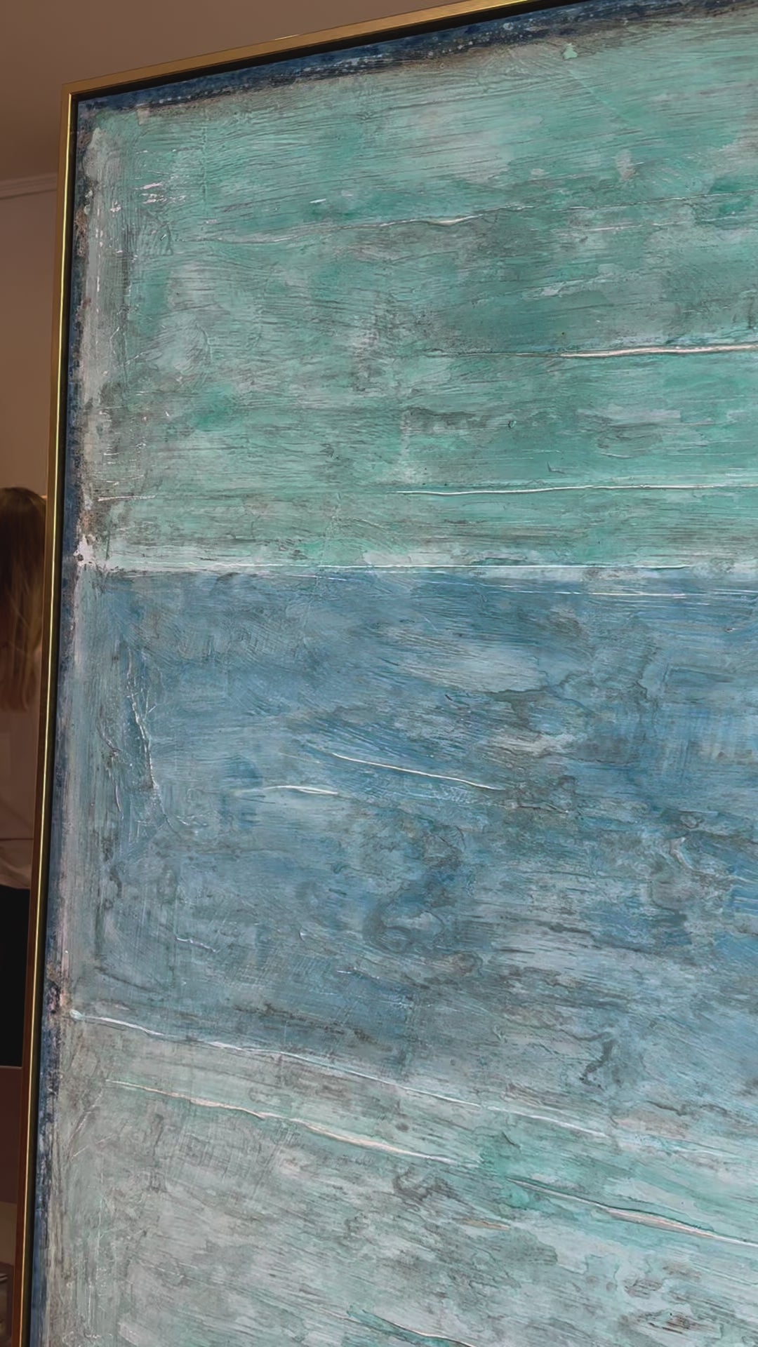 Step into the serene world of 'Oceanic Layers,' where the tranquil depths of the ocean come to life in textured layers. This minimalist piece captures the essence of the sea with its rich aquamarine, turquoise, and seafoam green hues, interspersed with navy blue. The cracked paint effect adds a tactile dimension, inviting closer inspection. It's a soothing escape into abstract art, ideal for those seeking a calming influence in their living space or a touch of minimalist elegance.