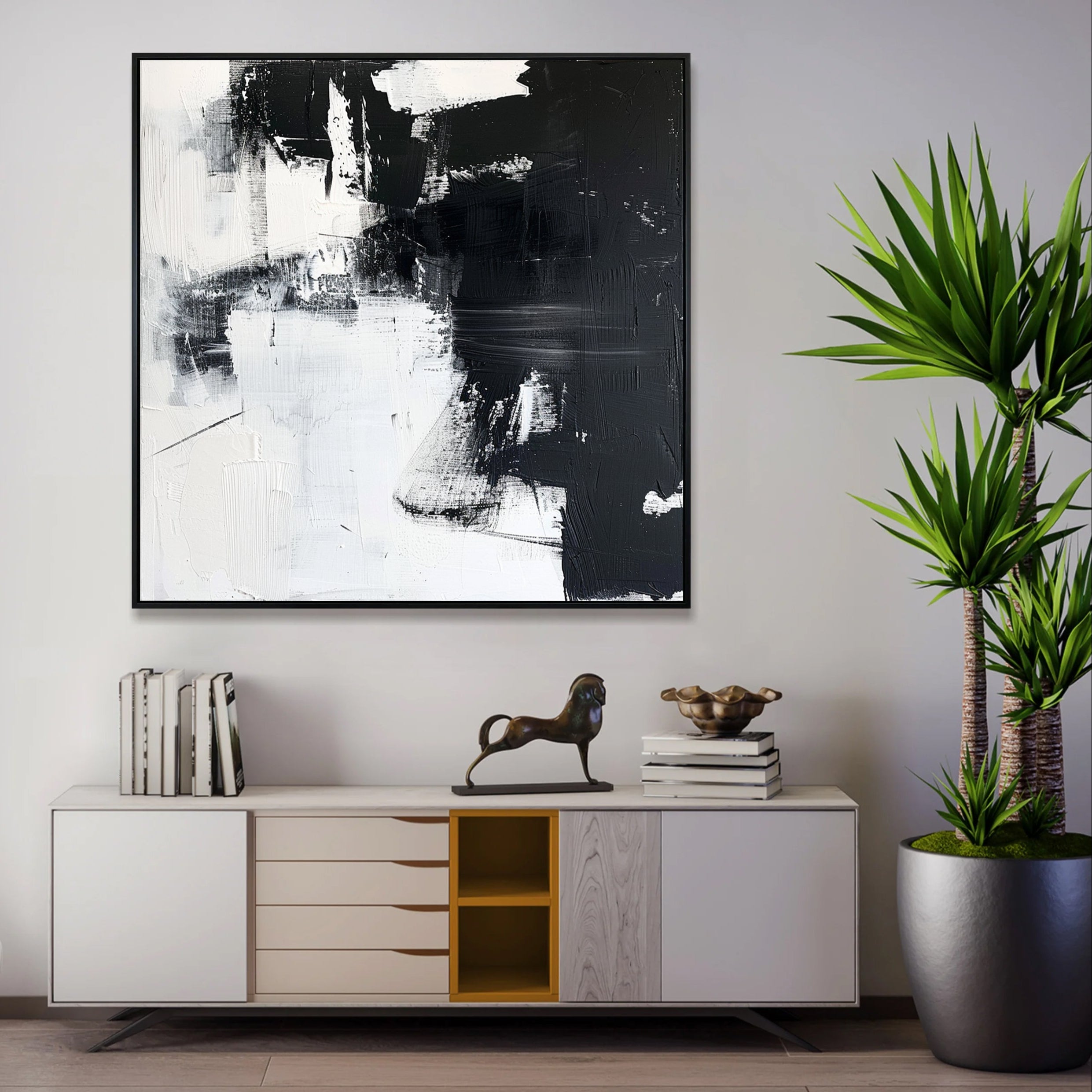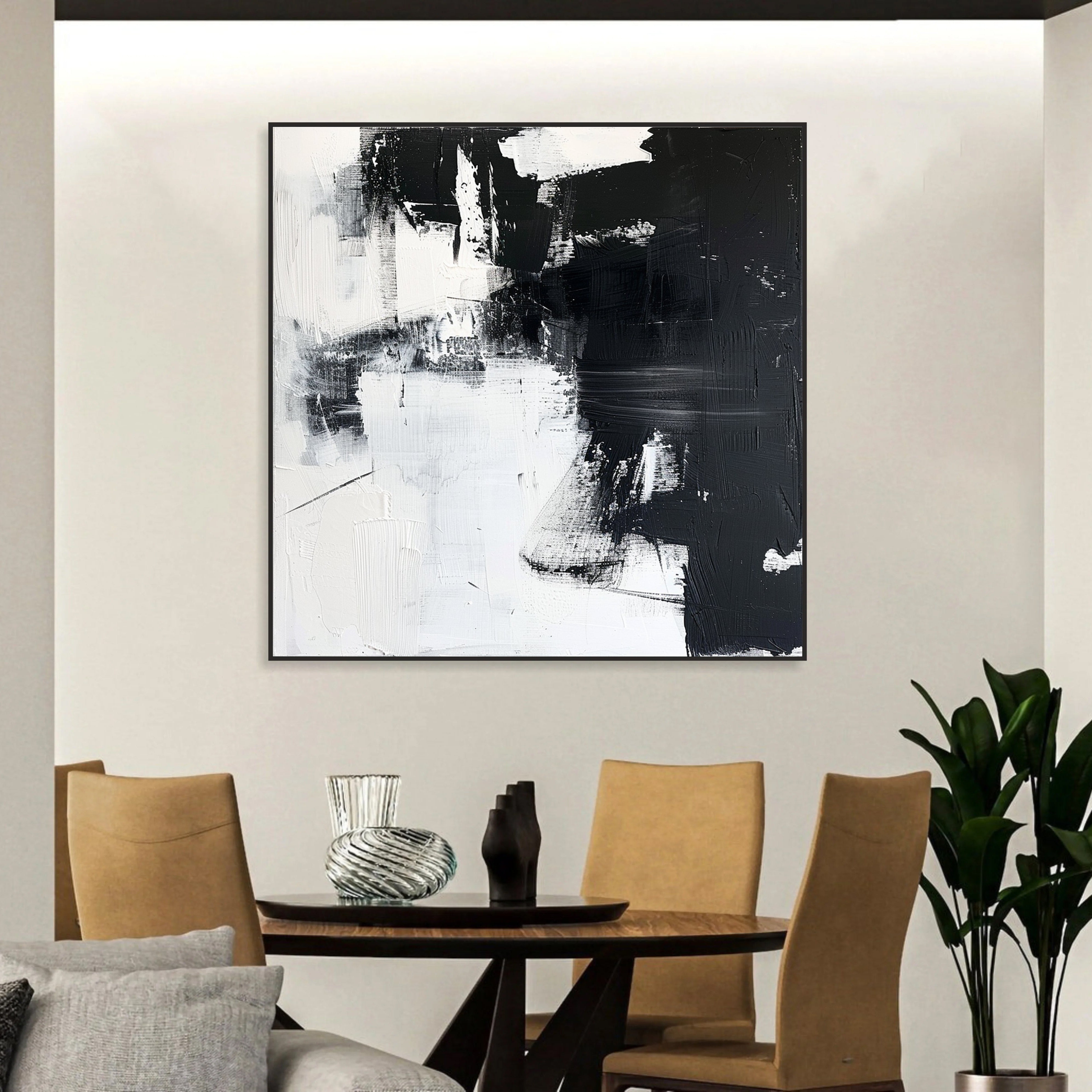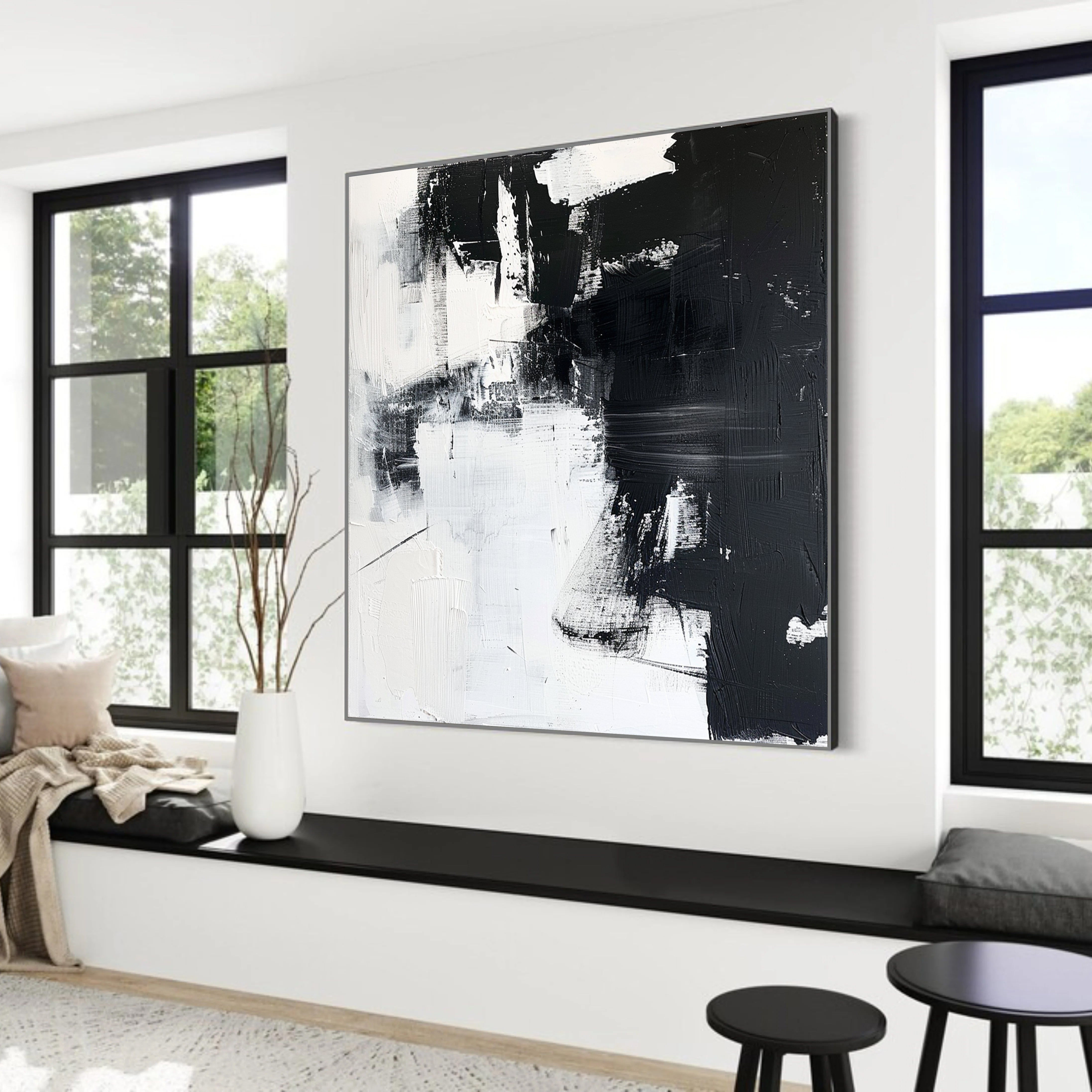 Make a bold statement with this black and white abstract painting. Featuring rich texture and expressive brushwork, it's perfect for modern, minimalist, or monochrome interiors. The contrast of light and dark creates depth and movement, making it ideal for living rooms, offices, or galleries. Elevate your decor with a sophisticated, gallery-style piece that exudes balance and power. Ready to hang and impress—this is modern art with timeless impact.