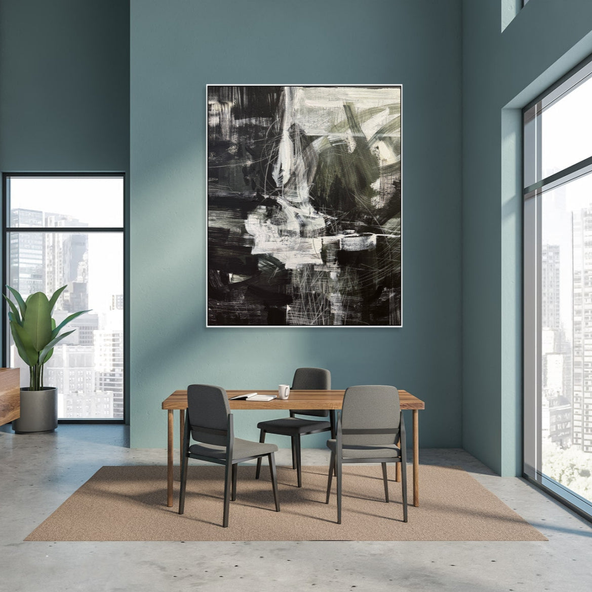 Add a touch of modern sophistication to your space with 'Black and White Dynamic, ' a captivating piece of abstract art that features bold brush strokes and textured layers in a monochrome palette of black, white, and subtle hints of gray and green. This expressionist painting embodies minimalist design, making it a perfect addition to contemporary decor. The dynamic strokes and textured surface create a sense of movement and depth, making this artwork a statement piece for any room. Ideal for those who appreciate the beauty of abstract expressionism and the power of monochrome art, 'Black and White Dynamic' will enhance your home or office decor with its bold yet refined presence.