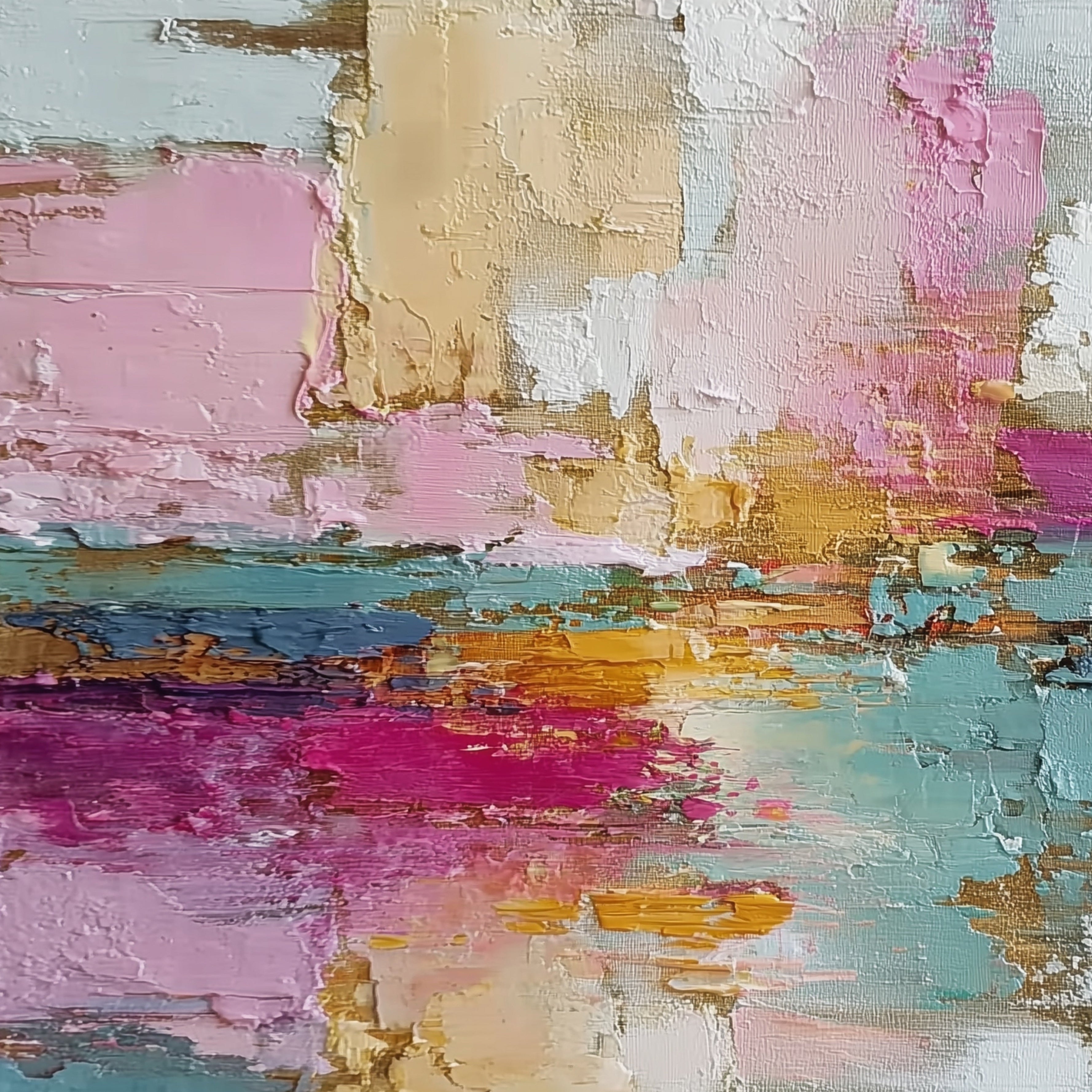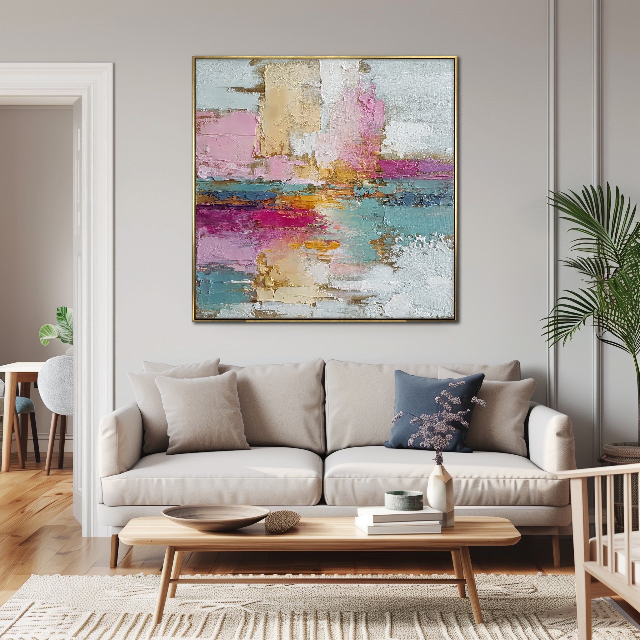 Bring a touch of elegance and modern artistry into your space with Eternal Sunrise, a stunning abstract textured canvas painting. Featuring a harmonious blend of soft pink, blush, golden beige, turquoise blue, and vibrant magenta, this artwork captures the essence of dreamy reflections and emotional depth. Hand-painted with rich texture and palette knife strokes, it creates a sense of movement and light, making it a perfect centerpiece for contemporary living rooms, bedrooms, or office interiors. Ideal for art lovers seeking unique wall décor, this modern abstract painting adds warmth, sophistication, and timeless charm to any space.
