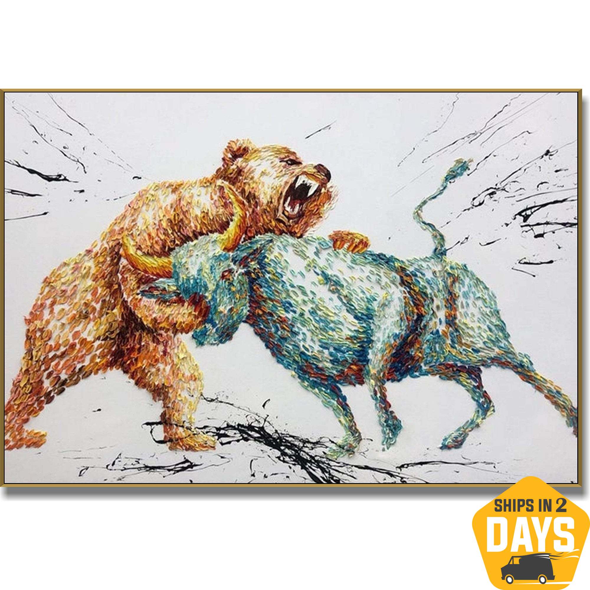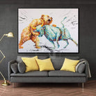 The performance at the stock market is changing from one to the other phase and bull and bear paintings are dedicated to all, who are following the situation. The tension at the stock markets and suspense are recreated at this abstract wall painting, showing the most popular animals of the investing world. This animal painting will look good at the walls of the living room or office.