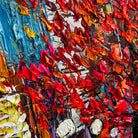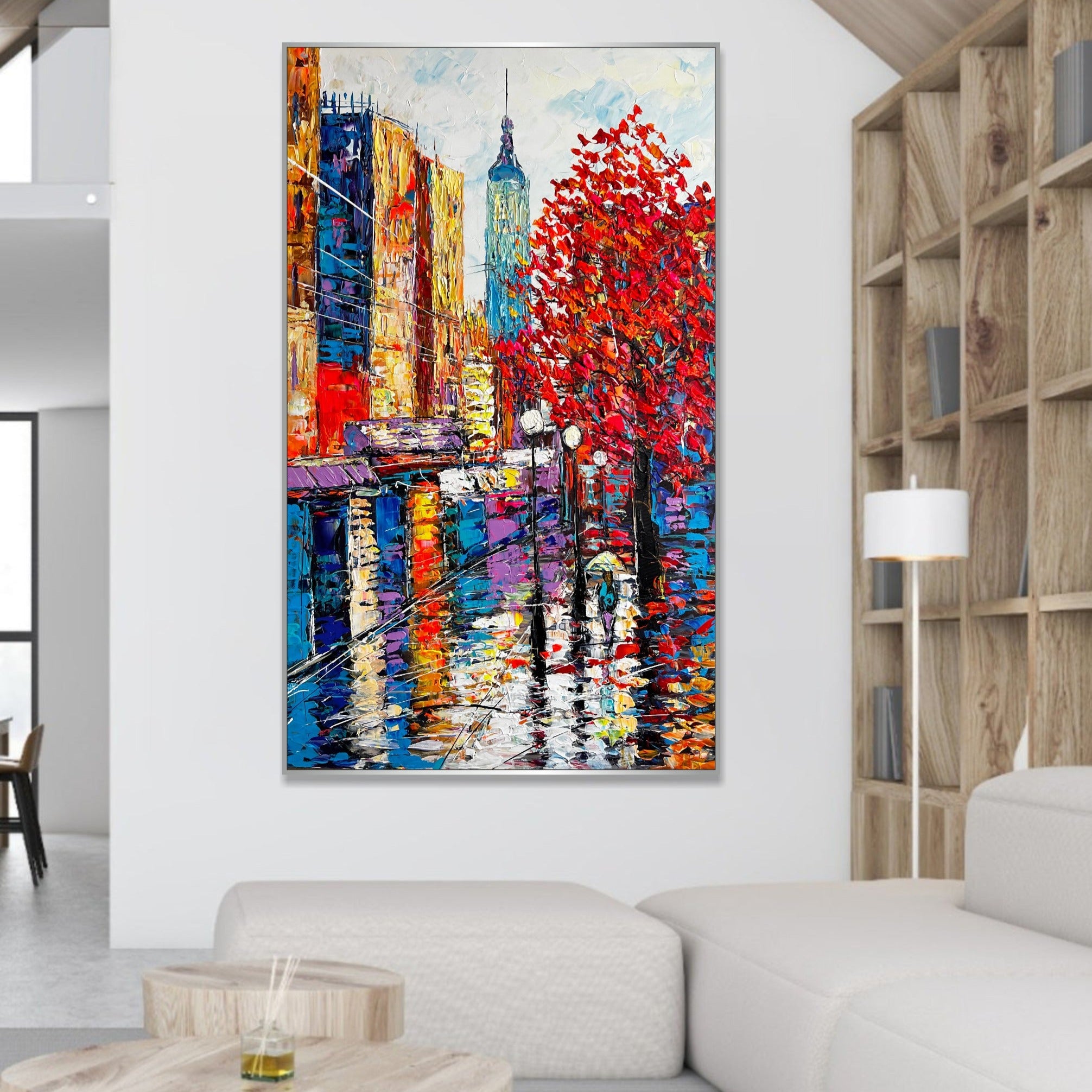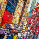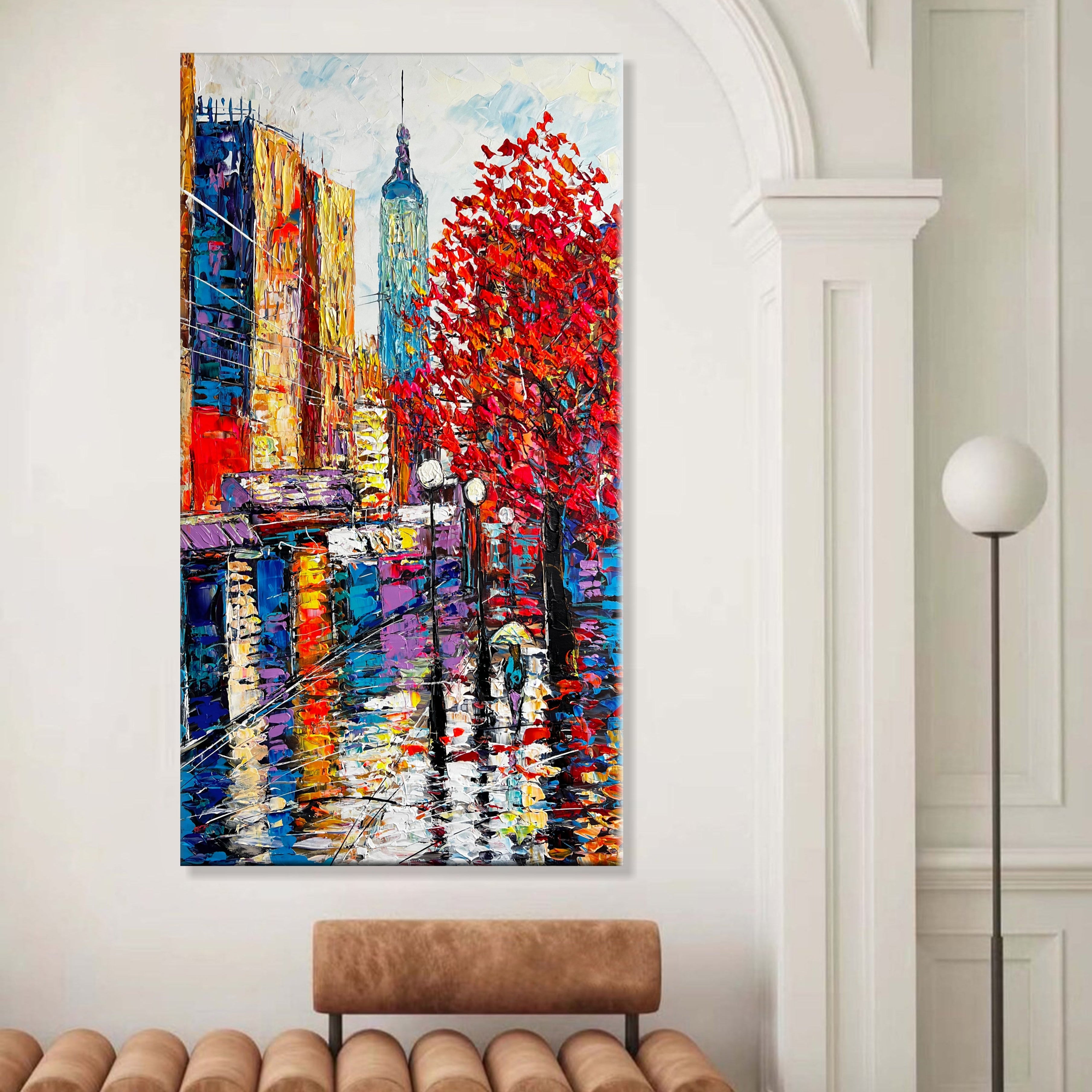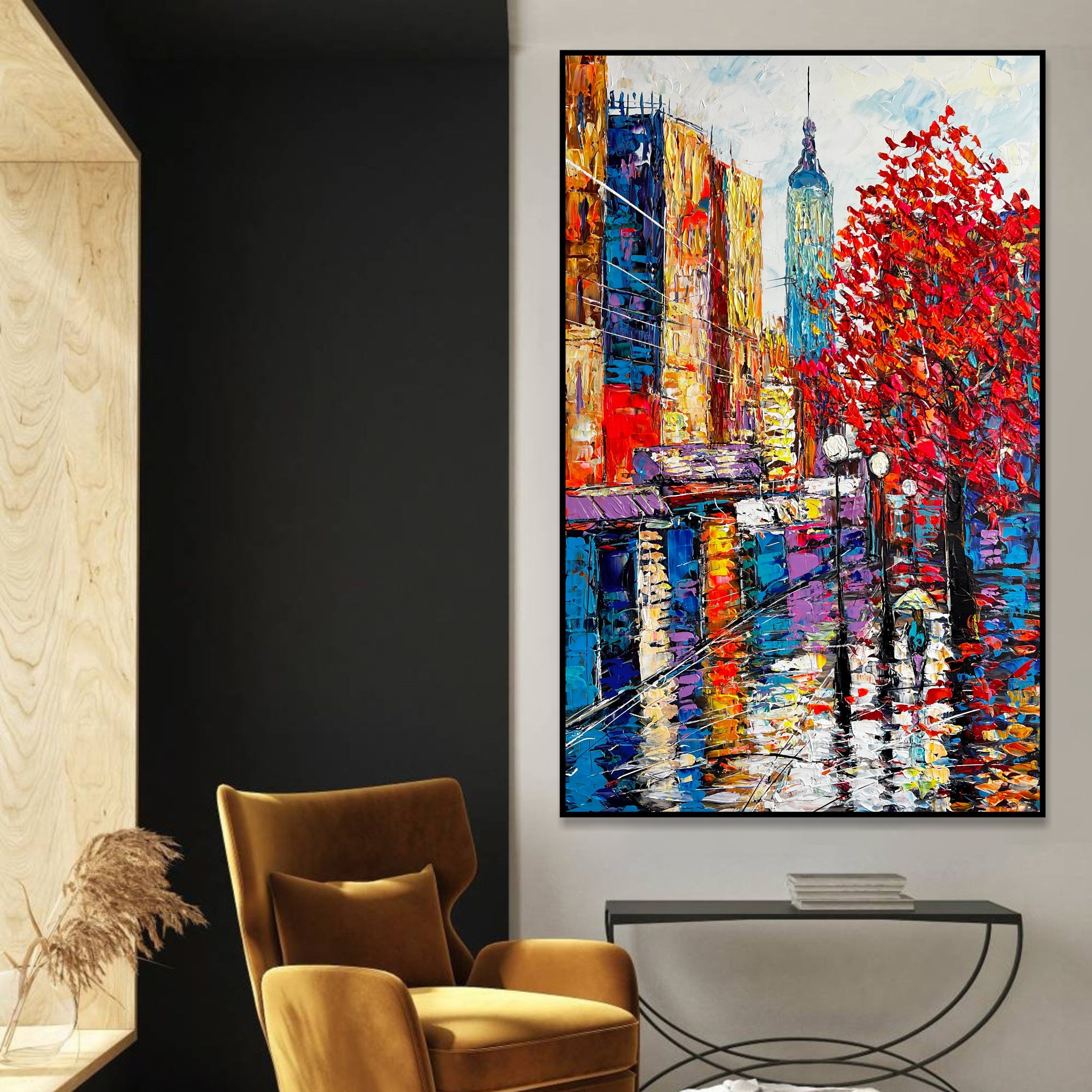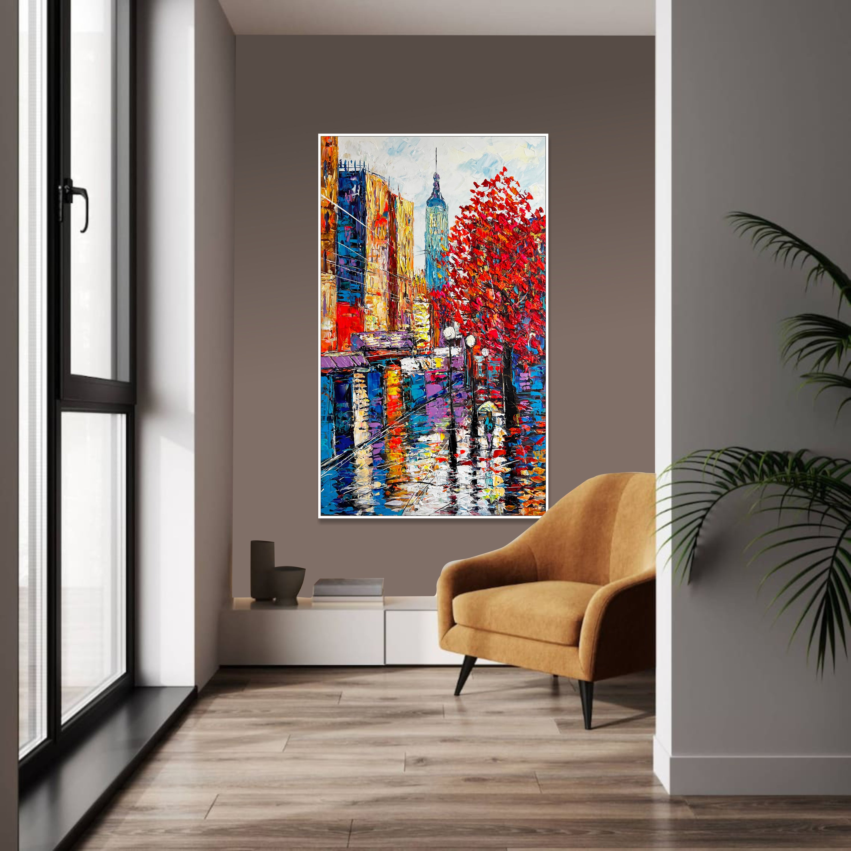 This abstract and colorful painting portrays a dynamic urban landscape, where the left side is dominated by the towering presence of multi-storey buildings. These structures, depicted with vibrant and diverse hues, create a visual symphony of form and color. On the right side, a lively scene unfolds, with trees adorned in warm orange leaves, a textured sidewalk, and graceful streetlights.