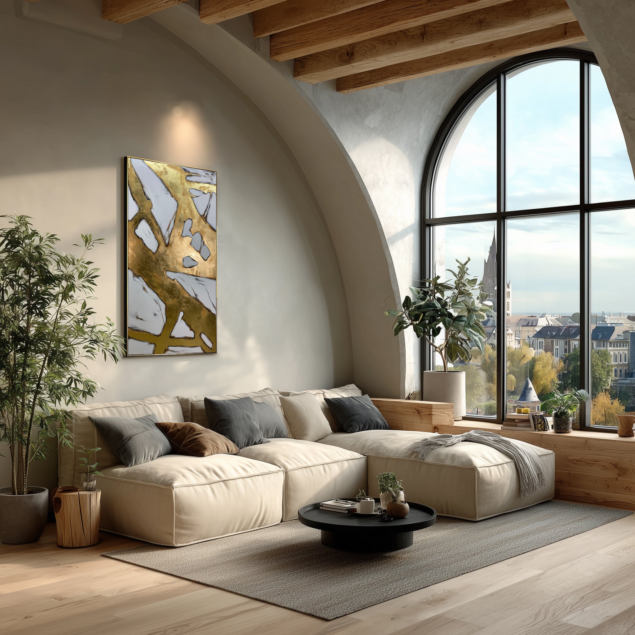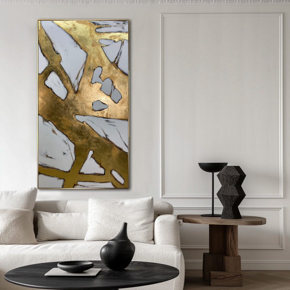 Elevate your space with this stunning abstract gold painting featuring bold geometric shapes and metallic textures. Hand-painted with rich gold tones and contrasting grey, this contemporary piece adds a touch of luxury and sophistication to any room. The fractured geometric design creates a modern, elegant feel, perfect for minimalist or contemporary interiors. Ideal for living rooms, bedrooms, or offices, this striking artwork brings a bold and refined statement to your home decor.
