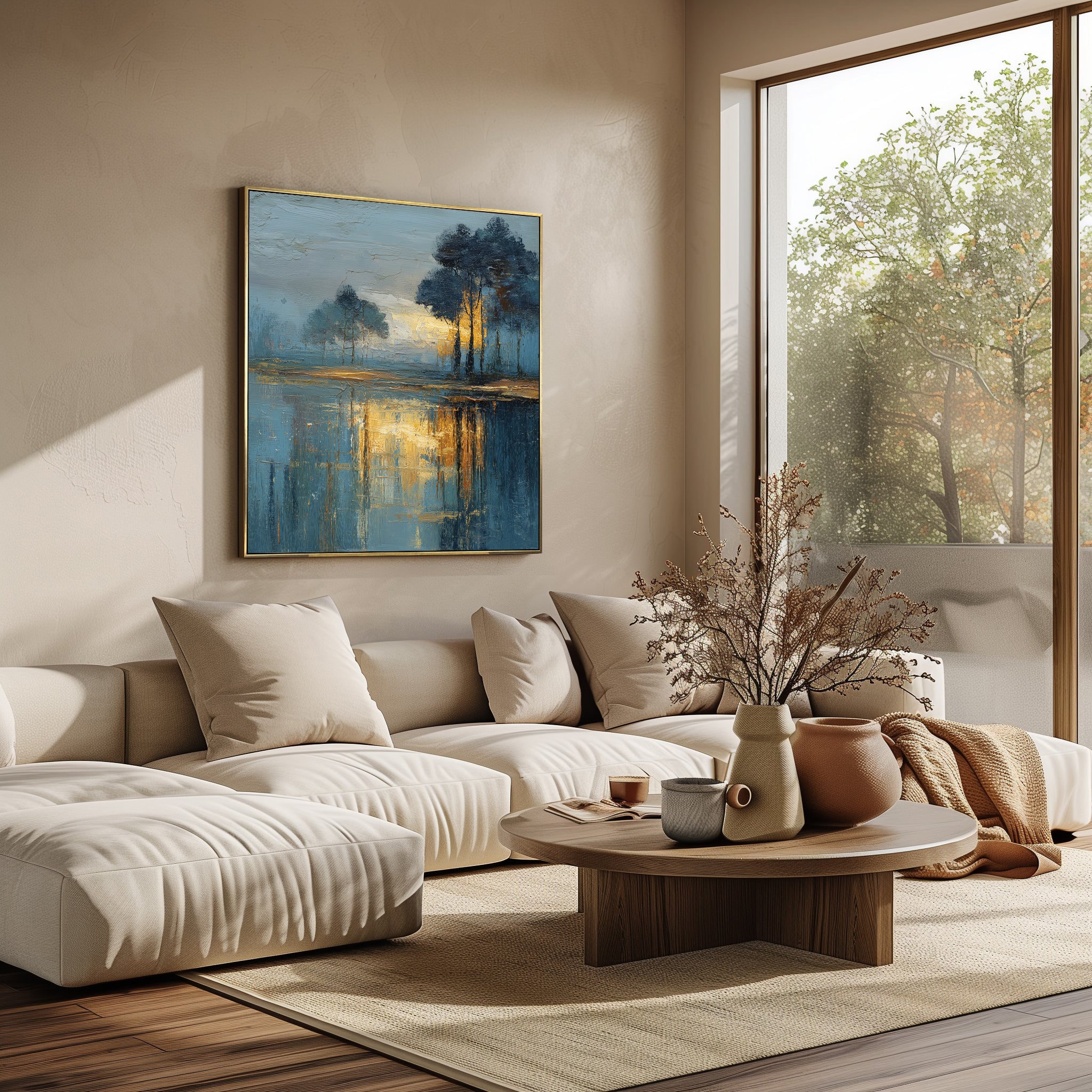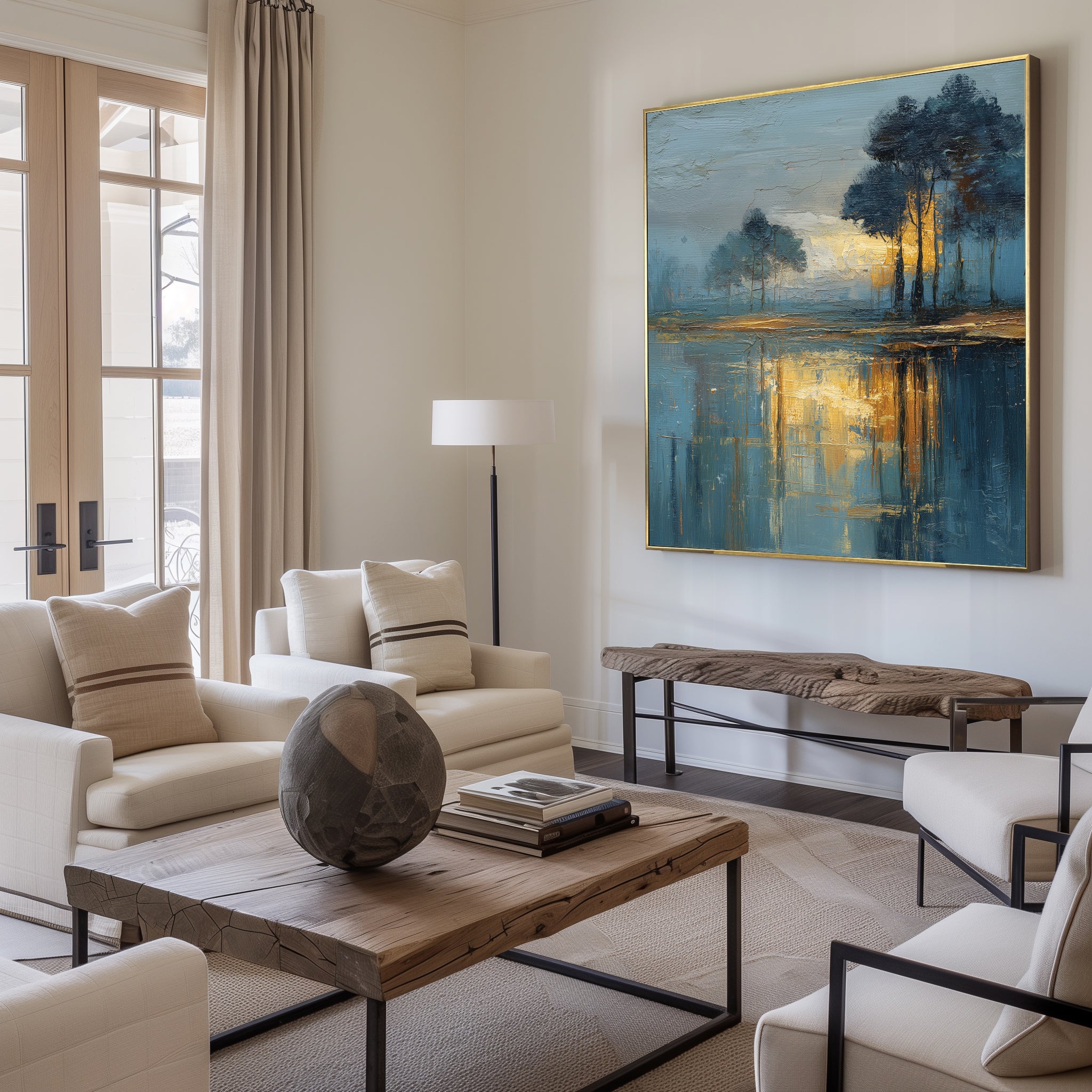 Bring serene elegance to your space with “Whispering Forest”, a hand-painted landscape capturing a misty forest illuminated by golden sunset light. This textured oil painting features deep blue tones contrasted by warm yellow highlights, evoking calm and introspection. Ideal for modern and rustic interiors alike, it’s a perfect centerpiece for living rooms, bedrooms, or offices. Elevate your wall décor with timeless tranquility and rich natural color.