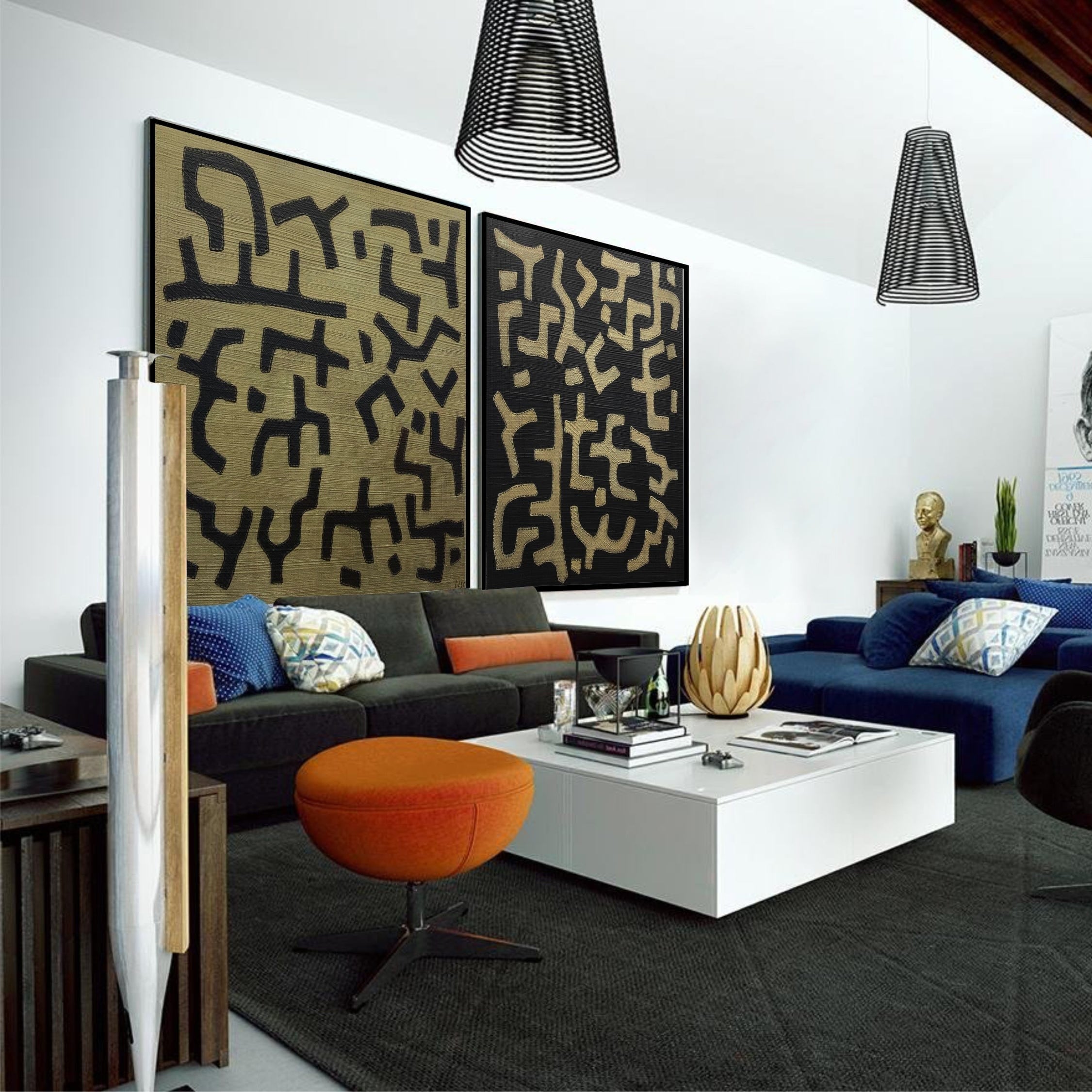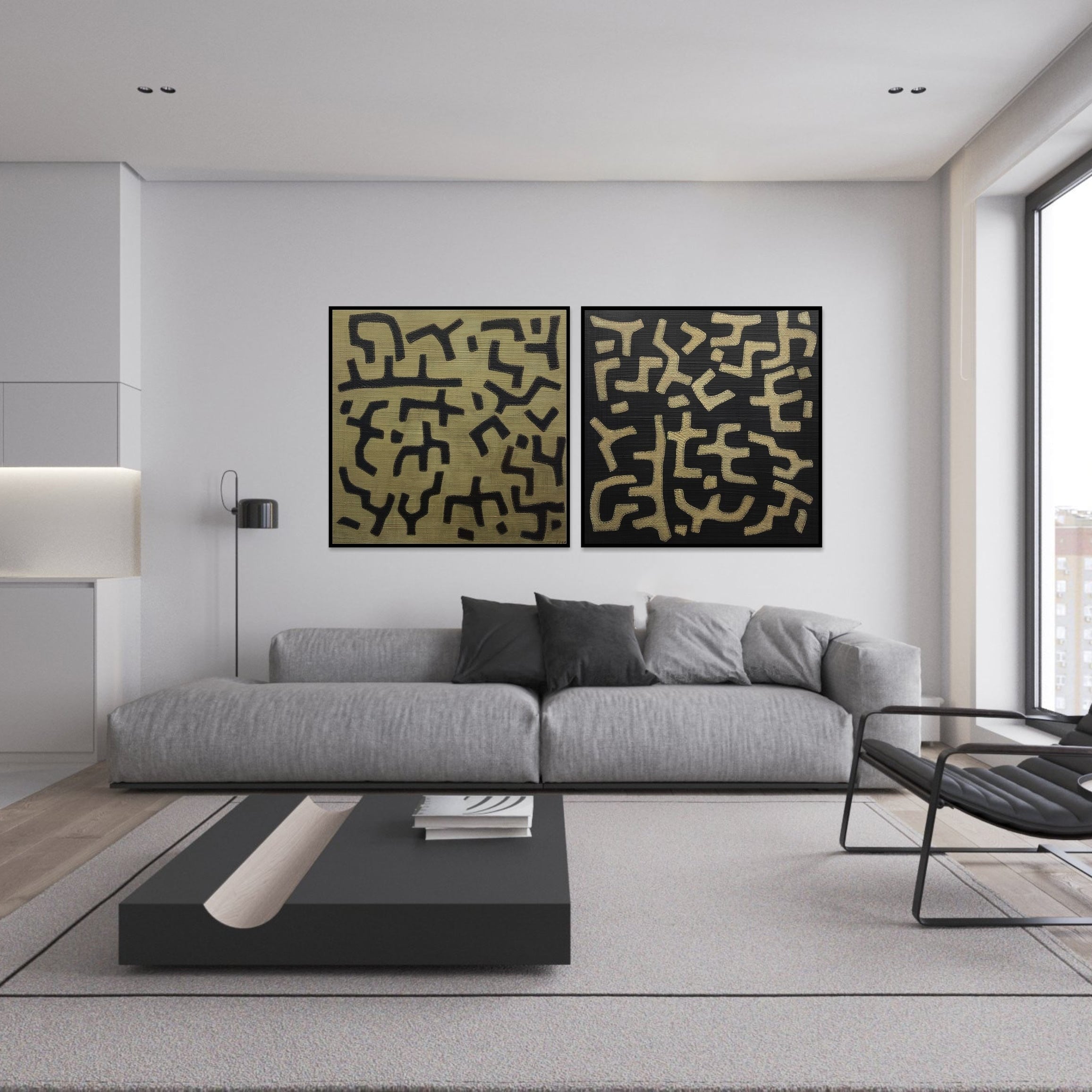 Introducing 'Map To Nowhere, ' a striking piece of modern abstract art that brings together minimalist design and tribal influences. This textured painting features bold black geometric shapes against a rich brown background, creating a captivating pattern that adds depth and character to any space. Perfect for contemporary decor, this artwork will enhance your living room, bedroom, or office with its unique blend of modern and tribal aesthetics. Elevate your interior with this stylish and thought-provoking piece.