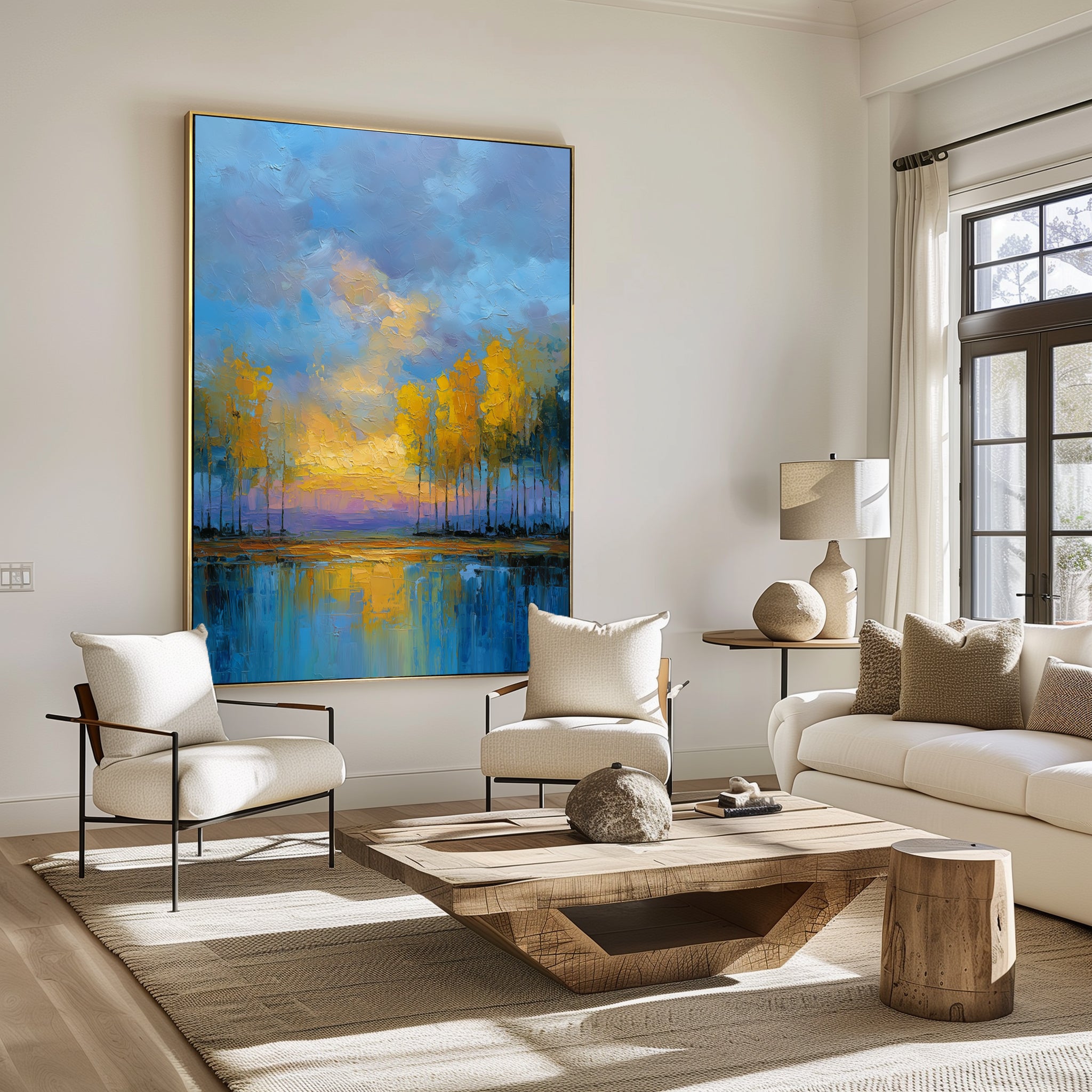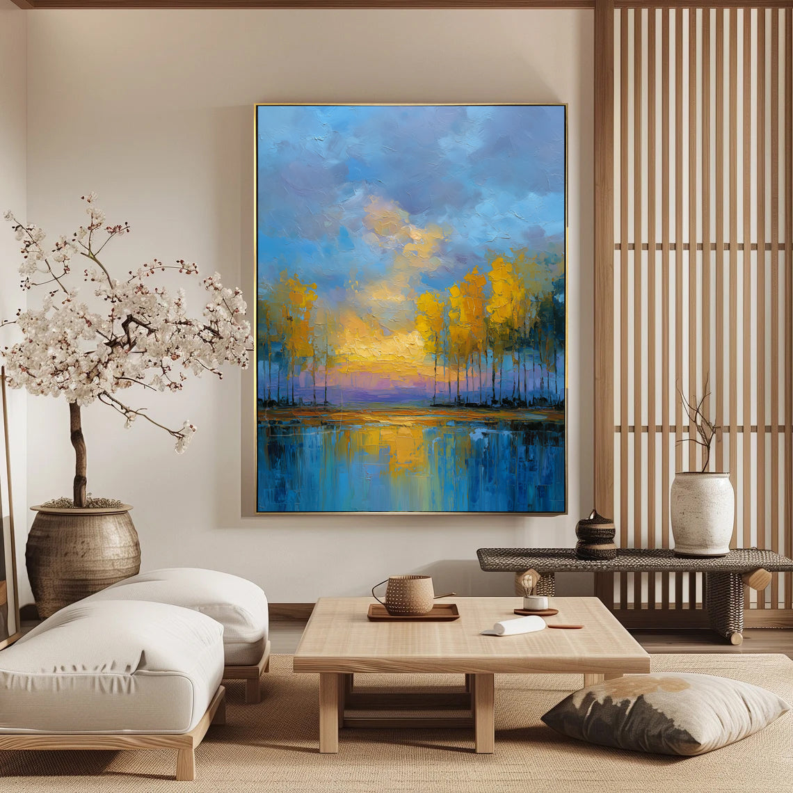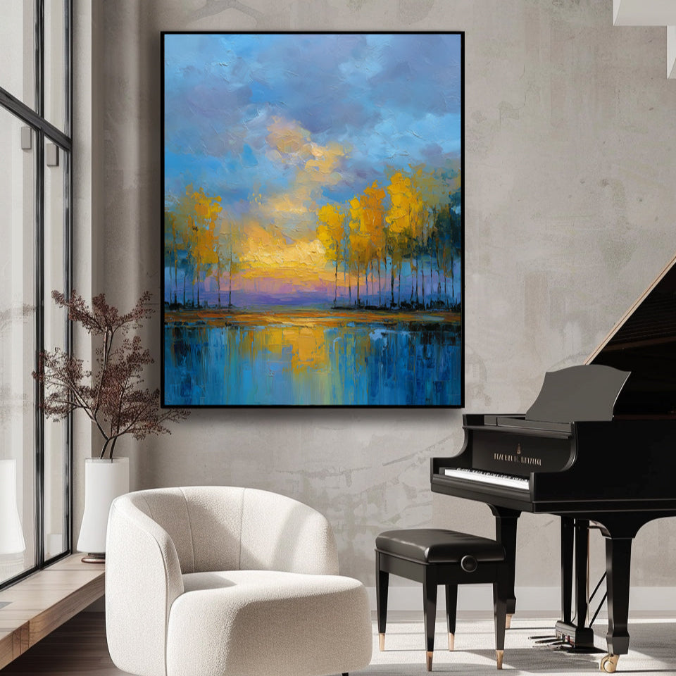 Bring warmth and serenity into your home with “Twilight Reflections”, a hand-painted landscape showcasing golden autumn trees, a glowing sunset, and tranquil lake reflections. With rich texture and vivid colors, this large impressionist canvas adds depth, vibrancy, and elegance to any living room, bedroom, or office. Perfect for nature lovers and modern interiors, this statement piece instantly transforms your wall into a peaceful escape.