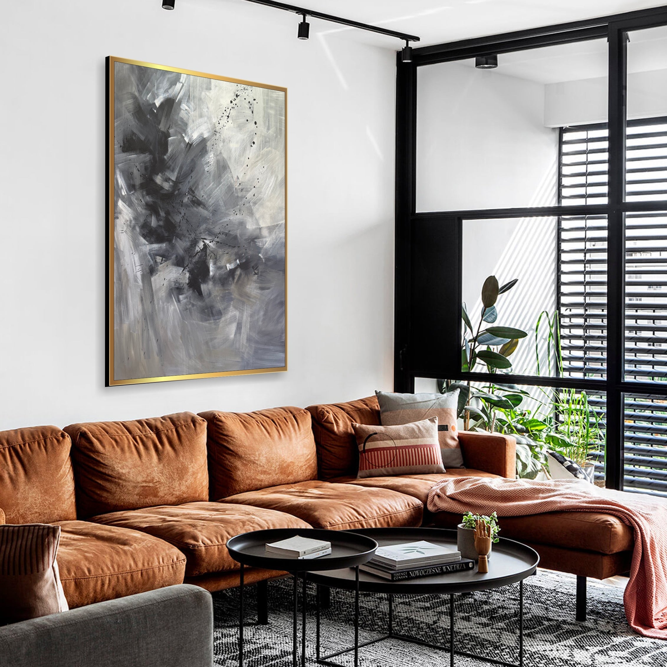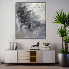 This large abstract painting showcases bold black and gray brushstrokes, creating a dramatic sense of movement and texture. The monochrome palette adds a sleek, modern touch, perfect for contemporary and minimalist interiors. Ideal for living rooms, offices, or bedrooms, this striking canvas brings depth and sophistication to any space. With its dynamic energy and elegant textures, this artwork makes a bold statement, embodying abstract expressionism and modern design.