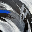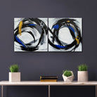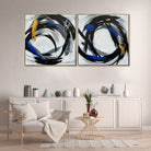 This striking abstract diptych features bold black and white swirls with dynamic brushstrokes, accented by pops of blue and gold. The geometric shapes and minimalist design evoke a sense of energy and movement, perfect for contemporary interiors. This large canvas set adds a touch of modern sophistication to living rooms, offices, or any space in need of a bold statement piece. Ideal for those who appreciate abstract expressionism and minimalist art, this diptych offers harmony and balance through its elegant design.This abstract painting will adorn and transform any modern interior!