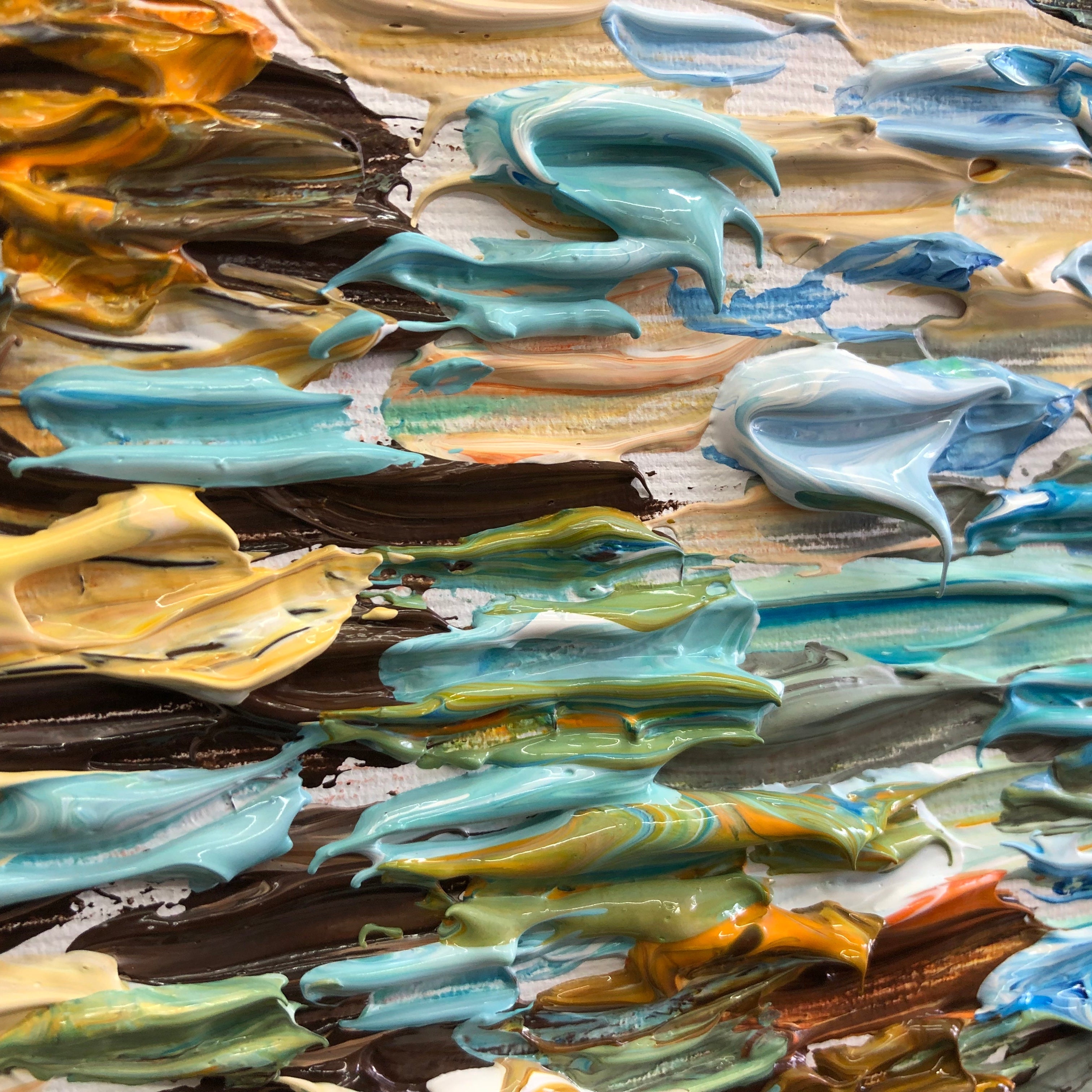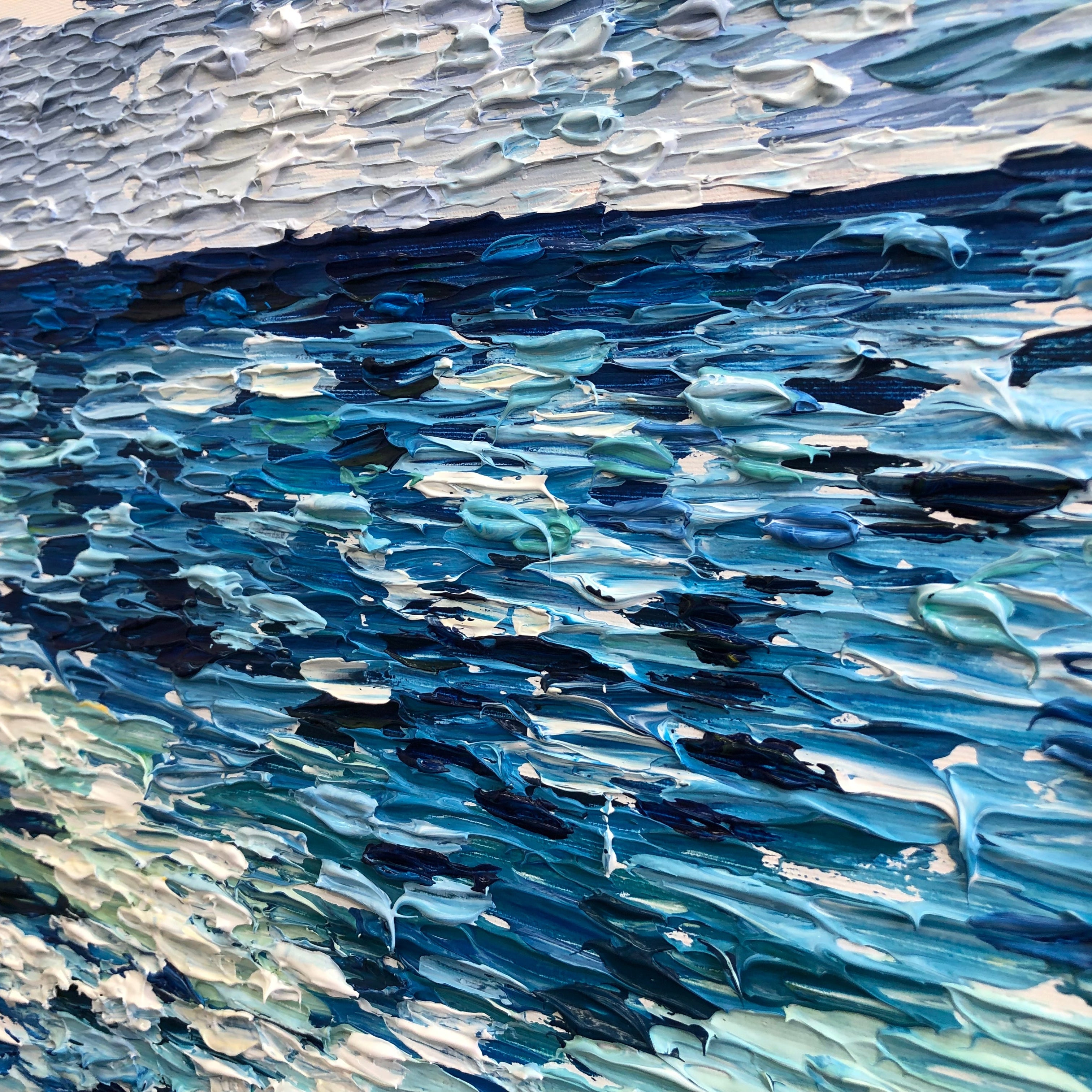 The upper half is a swirling mix of blues and greens, creating a sense of movement and energy, evoking the vastness and power of the ocean. The whitecaps of breaking waves are suggested by accents of white paint throughout the blue section.