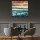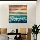 This painting depicts a seascape with turbulent waves crashing against the shore, captured in vibrant shades of blue and green. The sky above is a dramatic blend of warm oranges and yellows, transitioning to soft, muted clouds. The overall composition conveys a sense of movement and energy, juxtaposed with the serene beauty of the horizon.